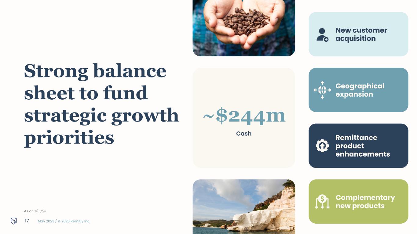 May 2023 / © 2023 Remitly Inc. Complementary new products Remittance product enhancements Geographical expansion New customer acquisition Strong balance sheet to fund strategic growth priorities As of 3/31/23 ~$244m Cash 17