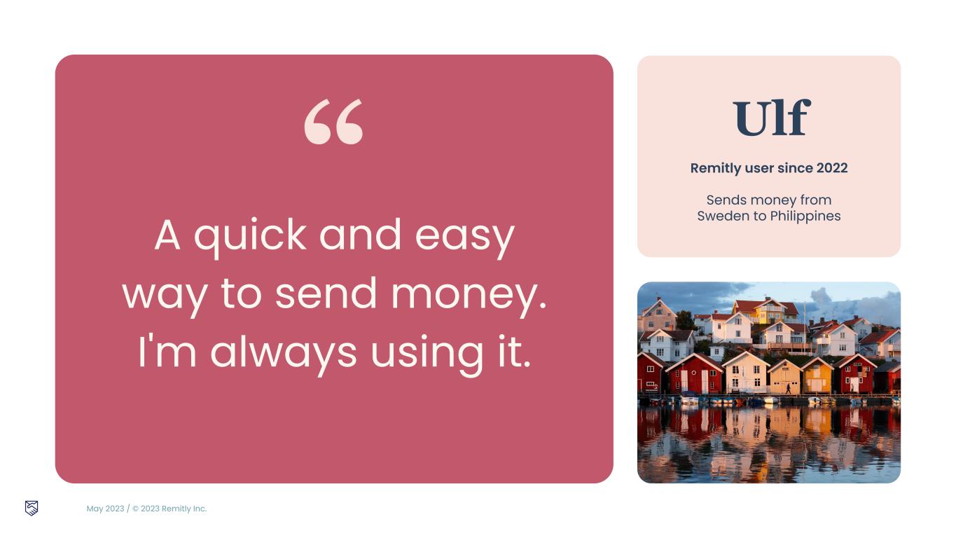 May 2023 / © 2023 Remitly Inc. “ Ulf Remitly user since 2022 Sends money from Sweden to PhilippinesA quick and easy way to send money. I'm always using it.
