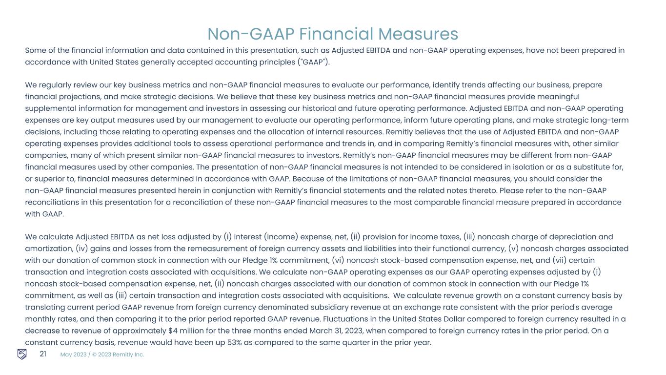 May 2023 / © 2023 Remitly Inc. Some of the financial information and data contained in this presentation, such as Adjusted EBITDA and non-GAAP operating expenses, have not been prepared in accordance with United States generally accepted accounting principles ("GAAP"). We regularly review our key business metrics and non-GAAP financial measures to evaluate our performance, identify trends affecting our business, prepare financial projections, and make strategic decisions. We believe that these key business metrics and non-GAAP financial measures provide meaningful supplemental information for management and investors in assessing our historical and future operating performance. Adjusted EBITDA and non-GAAP operating expenses are key output measures used by our management to evaluate our operating performance, inform future operating plans, and make strategic long-term decisions, including those relating to operating expenses and the allocation of internal resources. Remitly believes that the use of Adjusted EBITDA and non-GAAP operating expenses provides additional tools to assess operational performance and trends in, and in comparing Remitly’s financial measures with, other similar companies, many of which present similar non-GAAP financial measures to investors. Remitly’s non-GAAP financial measures may be different from non-GAAP financial measures used by other companies. The presentation of non-GAAP financial measures is not intended to be considered in isolation or as a substitute for, or superior to, financial measures determined in accordance with GAAP. Because of the limitations of non-GAAP financial measures, you should consider the non-GAAP financial measures presented herein in conjunction with Remitly’s financial statements and the related notes thereto. Please refer to the non-GAAP reconciliations in this presentation for a reconciliation of these non-GAAP financial measures to the most comparable financial measure prepared in accordance with GAAP. We calculate Adjusted EBITDA as net loss adjusted by (i) interest (income) expense, net, (ii) provision for income taxes, (iii) noncash charge of depreciation and amortization, (iv) gains and losses from the remeasurement of foreign currency assets and liabilities into their functional currency, (v) noncash charges associated with our donation of common stock in connection with our Pledge 1% commitment, (vi) noncash stock-based compensation expense, net, and (vii) certain transaction and integration costs associated with acquisitions. We calculate non-GAAP operating expenses as our GAAP operating expenses adjusted by (i) noncash stock-based compensation expense, net, (ii) noncash charges associated with our donation of common stock in connection with our Pledge 1% commitment, as well as (iii) certain transaction and integration costs associated with acquisitions. We calculate revenue growth on a constant currency basis by translating current period GAAP revenue from foreign currency denominated subsidiary revenue at an exchange rate consistent with the prior period's average monthly rates, and then comparing it to the prior period reported GAAP revenue. Fluctuations in the United States Dollar compared to foreign currency resulted in a decrease to revenue of approximately $4 million for the three months ended March 31, 2023, when compared to foreign currency rates in the prior period. On a constant currency basis, revenue would have been up 53% as compared to the same quarter in the prior year. 21 Non-GAAP Financial Measures