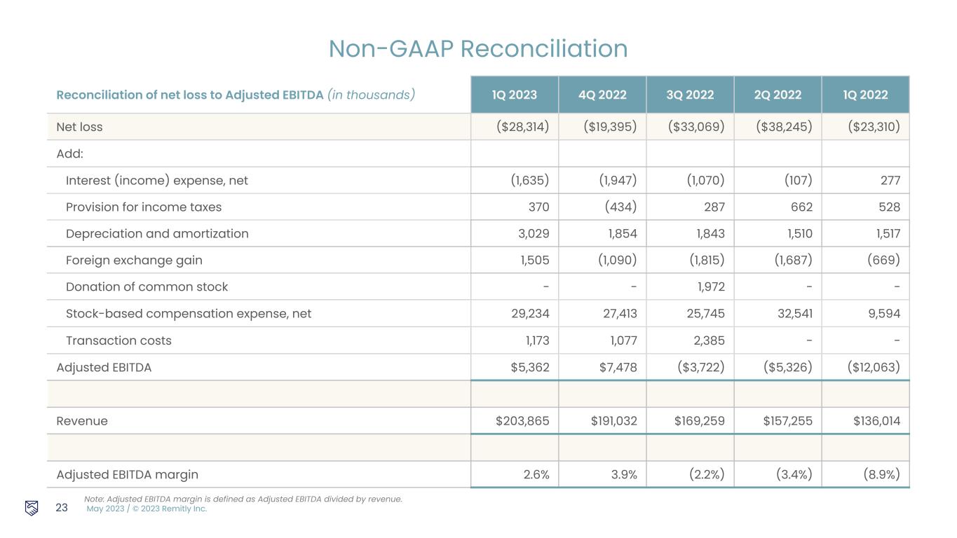 May 2023 / © 2023 Remitly Inc. Reconciliation of operating expenses to non-GAAP operating expenses (in thousands) 1Q 2023 4Q 2022 3Q 2022 2Q 2022 1Q 2022 Customer support and operations $19,931 $19,239 $18,142 $16,855 $13,870 Excluding: Stock-based compensation expense, net 205 220 226 277 93 Non-GAAP customer support and operations $19,726 $19,019 $17,916 $16,578 $13,777 Marketing $44,123 $43,163 $43,337 $43,849 $40,621 Excluding: Stock-based compensation expense, net 2,983 3,363 3,352 2,765 1,032 Non-GAAP marketing $41,140 $39,800 $39,985 $41,084 $39,589 Technology and development $49,376 $42,883 $36,178 $36,083 $23,575 Excluding: Stock-based compensation expense, net 16,631 15,461 13,238 13,649 4,072 Non-GAAP technology and development $32,745 $27,422 $22,940 $22,434 $19,503 General and administrative $41,408 $34,895 $35,504 $37,509 $23,342 Excluding: Stock-based compensation expense, net 9,415 8,369 8,929 15,850 4,397 Excluding: Donation of common stock - - 1,972 - - Excluding: Transaction costs 1,173 1,077 2,385 - - Non-GAAP general and administrative $30,820 $25,449 $22,218 $21,659 $18,945 22 Non-GAAP Reconciliation