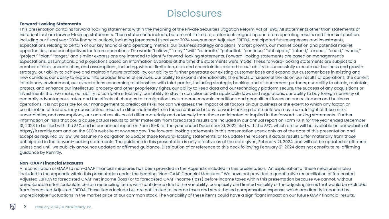 February 2024 / © 2024 Remitly Inc. 2 Disclosures Forward-Looking Statements This presentation contains forward-looking statements within the meaning of the Private Securities Litigation Reform Act of 1995. All statements other than statements of historical fact are forward-looking statements. These statements include, but are not limited to, statements regarding our future operating results and financial position, including our fiscal year 2024 financial outlook, including forecasted fiscal year 2024 revenue and Adjusted EBITDA, anticipated future expenses and investments, expectations relating to certain of our key financial and operating metrics, our business strategy and plans, market growth, our market position and potential market opportunities, and our objectives for future operations. The words “believe,” “may,” “will,” “estimate,” “potential,” “continue,” “anticipate,” “intend,” “expect,” “could,” “would,” “project,” “plan,” “target,” and similar expressions are intended to identify forward-looking statements. Forward-looking statements are based on management’s expectations, assumptions, and projections based on information available at the time the statements were made. These forward-looking statements are subject to a number of risks, uncertainties, and assumptions, including, without limitation, risks and uncertainties related to: our ability to successfully execute our business and growth strategy, our ability to achieve and maintain future profitability, our ability to further penetrate our existing customer base and expand our customer base in existing and new corridors, our ability to expand into broader financial services, our ability to expand internationally, the effects of seasonal trends on our results of operations, the current inflationary environment, our expectations concerning relationships with third parties, including strategic, banking and disbursement partners, our ability to obtain, maintain, protect, and enhance our intellectual property and other proprietary rights, our ability to keep data and our technology platform secure, the success of any acquisitions or investments that we make, our ability to compete effectively, our ability to stay in compliance with applicable laws and regulations, our ability to buy foreign currency at generally advantageous rates, and the effects of changes to immigration laws, macroeconomic conditions and geopolitical forces on our customers and business operations. It is not possible for our management to predict all risks, nor can we assess the impact of all factors on our business or the extent to which any factor, or combination of factors, may cause actual results to differ materially from those contained in any forward-looking statements we may make. In light of these risks, uncertainties, and assumptions, our actual results could differ materially and adversely from those anticipated or implied in the forward-looking statements. Further information on risks that could cause actual results to differ materially from forecasted results are included in our annual report on Form 10-K for the year ended December 31, 2023 to be filed with the SEC and in our annual report on Form 10-K for the year ended December 31, 2022 filed with the SEC, which are or will be available on our website at https://ir.remitly.com and on the SEC’s website at www.sec.gov. The forward-looking statements in this presentation speak only as of the date of this presentation and except as required by law, we assume no obligation to update these forward-looking statements, or to update the reasons if actual results differ materially from those anticipated in the forward-looking statements. The guidance in this presentation is only effective as of the date given, February 21, 2024, and will not be updated or affirmed unless and until we publicly announce updated or affirmed guidance. Distribution of or reference to this deck following February 21, 2024 does not constitute re-affirming guidance by Remitly. Non-GAAP Financial Measures A reconciliation of GAAP to non-GAAP financial measures has been provided in the Appendix included in this presentation. An explanation of these measures is also included in the Appendix within this presentation under the heading “Non-GAAP Financial Measures.” We have not provided a quantitative reconciliation of forecasted Adjusted EBITDA to forecasted GAAP net income (loss) or to forecasted GAAP income (loss) before income taxes within this presentation because we cannot, without unreasonable effort, calculate certain reconciling items with confidence due to the variability, complexity and limited visibility of the adjusting items that would be excluded from forecasted Adjusted EBITDA. These items include but are not limited to income taxes and stock-based compensation expense, which are directly impacted by unpredictable fluctuations in the market price of our common stock. The variability of these items could have a significant impact on our future GAAP financial results.
