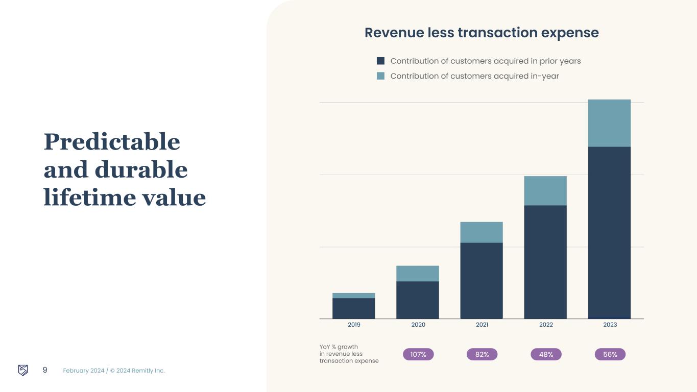 February 2024 / © 2024 Remitly Inc. Building trust by removing unnecessary friction drives retention and engagement 8 1. Remitly internal data for 4Q 2023. 2. Disbursement speed reflects the time between when Remitly has the customer funds and when the funds are successfully disbursed (e.g., completed or available for pickup). * Please see reconciliation of non-GAAP measures to the most comparable GAAP measures in the appendix. >90% Customer transactions disbursed in less than an hour1,2 >95% Transactions without customer support contact1 260 bps YoY 4Q23 non-GAAP customer support expense* as a % of revenue Removing customer friction across the transaction lifecycle enabled by scale ● Advanced identity verification and higher precision risk systems ● Higher payment acceptance and delivery rates ● Self service error resolution and self help ● Leverage AI and ML that improves with scale in order to reduce friction — — Key outcomes