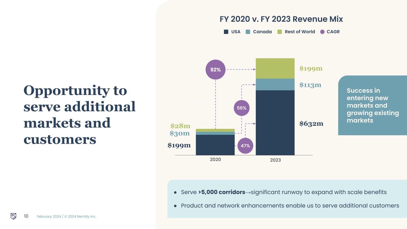February 2024 / © 2024 Remitly Inc. 9 Predictable and durable lifetime value Contribution of customers acquired in prior years Contribution of customers acquired in-year Revenue less transaction expense 107% 82% 48% 56% YoY % growth in revenue less transaction expense 2019 2020 2021 2022 2023 2019 2020 2021 2022 2023