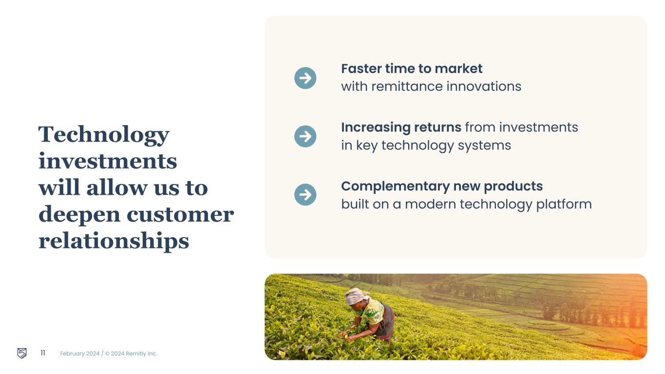 February 2024 / © 2024 Remitly Inc. 10 Opportunity to serve additional markets and customers ● Serve >5,000 corridors→significant runway to expand with scale benefits ● Product and network enhancements enable us to serve additional customers USA Canada Rest of World CAGR FY 2020 v. FY 2023 Revenue Mix 2020 2023 $199m $30m $28m $632m $113m $199m 47% 56% 92% Success in entering new markets and growing existing markets