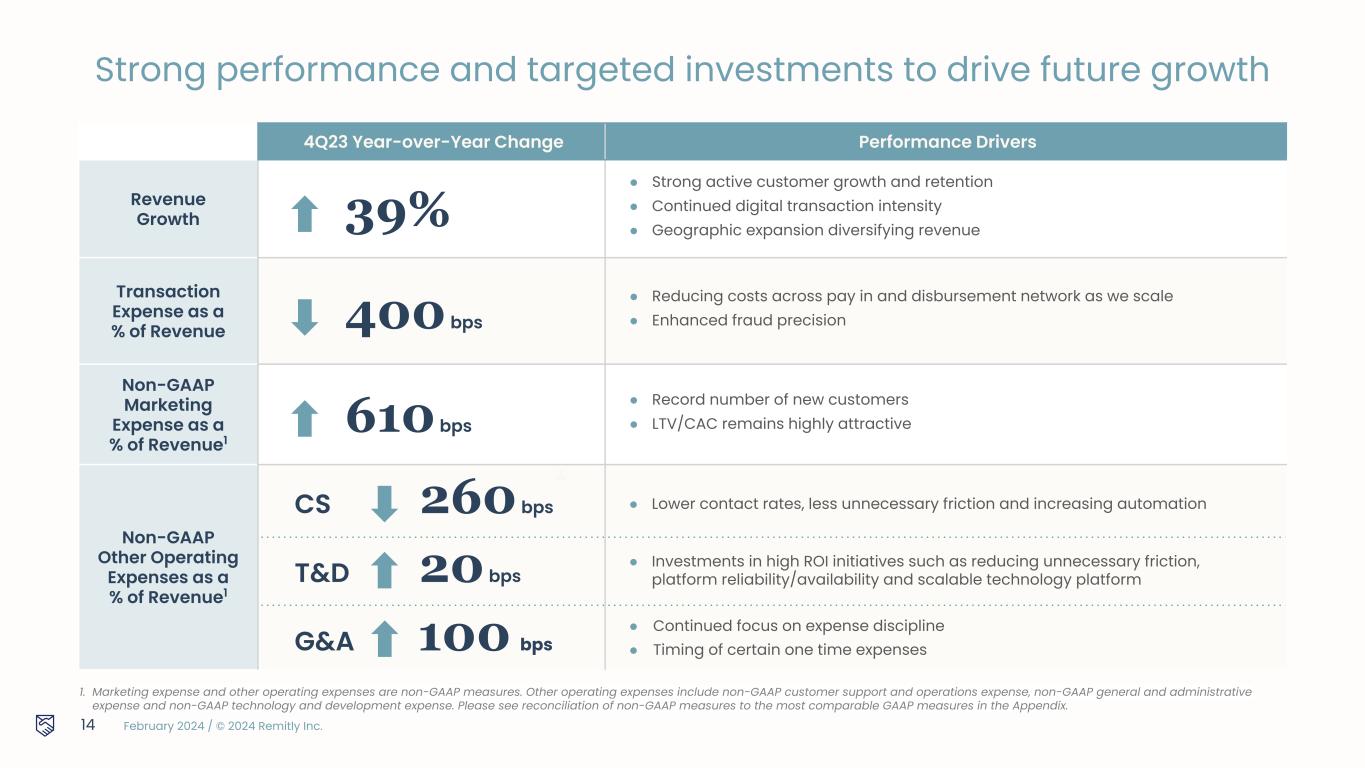 February 2024 / © 2024 Remitly Inc. 4Q — Continued strong execution Scale 5.9m 41% growth in quarterly active customers over 4Q 2022 $11.1b 38% growth in send volume over 4Q 2022 Revenue $265m 39% growth in revenue over 4Q 2022 13 Profitability ($35m) GAAP Net Loss $8m Adjusted EBITDA* *Adjusted EBITDA is a non-GAAP measure. Please see reconciliation of non-GAAP measures to the most comparable GAAP measures in the Appendix.
