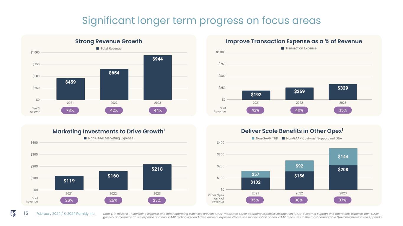 February 2024 / © 2024 Remitly Inc. 1. Marketing expense and other operating expenses are non-GAAP measures. Other operating expenses include non-GAAP customer support and operations expense, non-GAAP general and administrative expense and non-GAAP technology and development expense. Please see reconciliation of non-GAAP measures to the most comparable GAAP measures in the Appendix. 4Q23 Year-over-Year Change Performance Drivers Revenue Growth 39% ● Strong active customer growth and retention ● Continued digital transaction intensity ● Geographic expansion diversifying revenue Transaction Expense as a % of Revenue 400 bps ● Reducing costs across pay in and disbursement network as we scale ● Enhanced fraud precision Non-GAAP Marketing Expense as a % of Revenue1 610 bps ● Record number of new customers ● LTV/CAC remains highly attractive Non-GAAP Other Operating Expenses as a % of Revenue1 14 ● Continued focus on expense discipline ● Timing of certain one time expenses ● Investments in high ROI initiatives such as reducing unnecessary friction, platform reliability/availability and scalable technology platform G&A 100 bps T&D 20 bps CS 260 bps ● Lower contact rates, less unnecessary friction and increasing automation Strong performance and targeted investments to drive future growth
