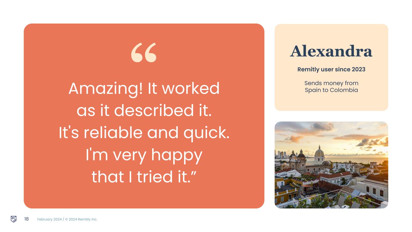 February 2024 / © 2024 Remitly Inc. “ Alexandra Remitly user since 2023 Sends money from Spain to ColombiaAmazing! It worked as it described it. It's reliable and quick. I'm very happy that I tried it.” 18