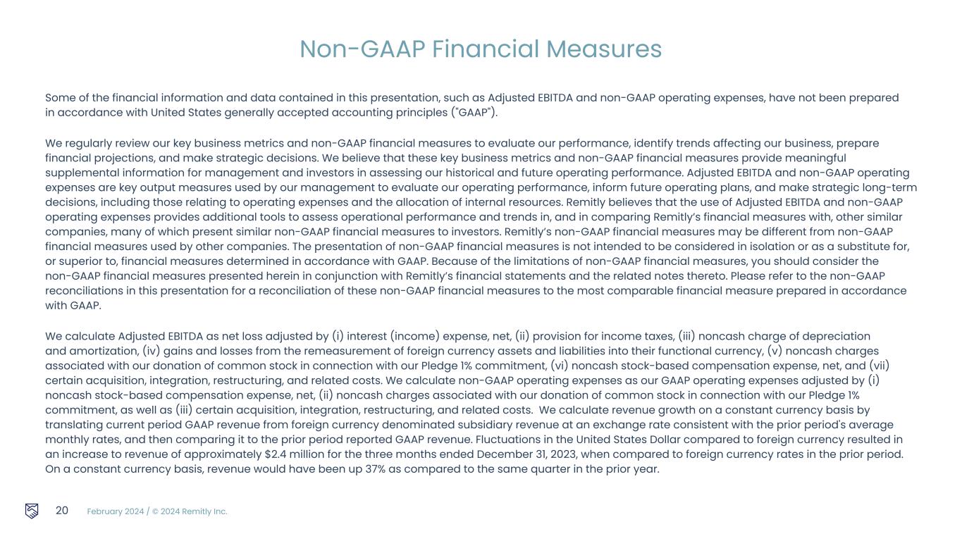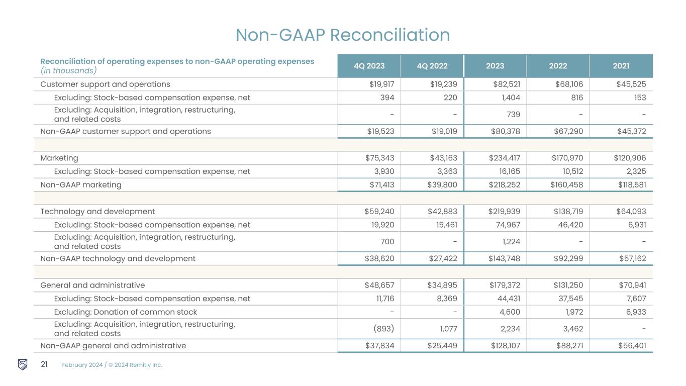 February 2024 / © 2024 Remitly Inc. Some of the financial information and data contained in this presentation, such as Adjusted EBITDA and non-GAAP operating expenses, have not been prepared in accordance with United States generally accepted accounting principles ("GAAP"). We regularly review our key business metrics and non-GAAP financial measures to evaluate our performance, identify trends affecting our business, prepare financial projections, and make strategic decisions. We believe that these key business metrics and non-GAAP financial measures provide meaningful supplemental information for management and investors in assessing our historical and future operating performance. Adjusted EBITDA and non-GAAP operating expenses are key output measures used by our management to evaluate our operating performance, inform future operating plans, and make strategic long-term decisions, including those relating to operating expenses and the allocation of internal resources. Remitly believes that the use of Adjusted EBITDA and non-GAAP operating expenses provides additional tools to assess operational performance and trends in, and in comparing Remitly’s financial measures with, other similar companies, many of which present similar non-GAAP financial measures to investors. Remitly’s non-GAAP financial measures may be different from non-GAAP financial measures used by other companies. The presentation of non-GAAP financial measures is not intended to be considered in isolation or as a substitute for, or superior to, financial measures determined in accordance with GAAP. Because of the limitations of non-GAAP financial measures, you should consider the non-GAAP financial measures presented herein in conjunction with Remitly’s financial statements and the related notes thereto. Please refer to the non-GAAP reconciliations in this presentation for a reconciliation of these non-GAAP financial measures to the most comparable financial measure prepared in accordance with GAAP. We calculate Adjusted EBITDA as net loss adjusted by (i) interest (income) expense, net, (ii) provision for income taxes, (iii) noncash charge of depreciation and amortization, (iv) gains and losses from the remeasurement of foreign currency assets and liabilities into their functional currency, (v) noncash charges associated with our donation of common stock in connection with our Pledge 1% commitment, (vi) noncash stock-based compensation expense, net, and (vii) certain acquisition, integration, restructuring, and related costs. We calculate non-GAAP operating expenses as our GAAP operating expenses adjusted by (i) noncash stock-based compensation expense, net, (ii) noncash charges associated with our donation of common stock in connection with our Pledge 1% commitment, as well as (iii) certain acquisition, integration, restructuring, and related costs. We calculate revenue growth on a constant currency basis by translating current period GAAP revenue from foreign currency denominated subsidiary revenue at an exchange rate consistent with the prior period's average monthly rates, and then comparing it to the prior period reported GAAP revenue. Fluctuations in the United States Dollar compared to foreign currency resulted in an increase to revenue of approximately $2.4 million for the three months ended December 31, 2023, when compared to foreign currency rates in the prior period. On a constant currency basis, revenue would have been up 37% as compared to the same quarter in the prior year. 20 Non-GAAP Financial Measures