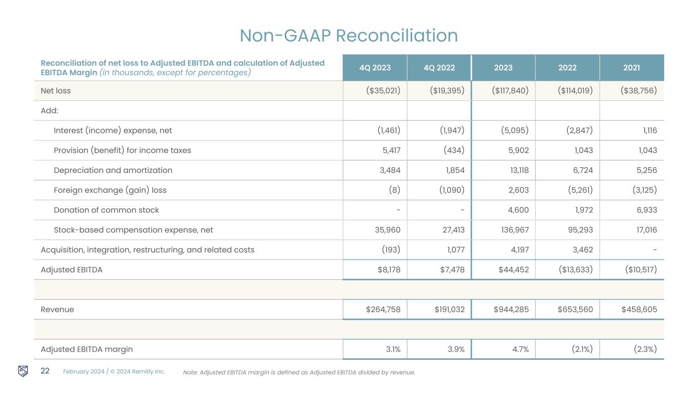 February 2024 / © 2024 Remitly Inc. Reconciliation of net loss to Adjusted EBITDA and calculation of Adjusted EBITDA Margin (in thousands, except for percentages) 4Q 2023 4Q 2022 2023 2022 2021 Net loss ($35,021) ($19,395) ($117,840) ($114,019) ($38,756) Add: Interest (income) expense, net (1,461) (1,947) (5,095) (2,847) 1,116 Provision (benefit) for income taxes 5,417 (434) 5,902 1,043 1,043 Depreciation and amortization 3,484 1,854 13,118 6,724 5,256 Foreign exchange (gain) loss (8) (1,090) 2,603 (5,261) (3,125) Donation of common stock - - 4,600 1,972 6,933 Stock-based compensation expense, net 35,960 27,413 136,967 95,293 17,016 Acquisition, integration, restructuring, and related costs (193) 1,077 4,197 3,462 - Adjusted EBITDA $8,178 $7,478 $44,452 ($13,633) ($10,517) Revenue $264,758 $191,032 $944,285 $653,560 $458,605 Adjusted EBITDA margin 3.1% 3.9% 4.7% (2.1%) (2.3%) 22 Non-GAAP Reconciliation Note: Adjusted EBITDA margin is defined as Adjusted EBITDA divided by revenue.