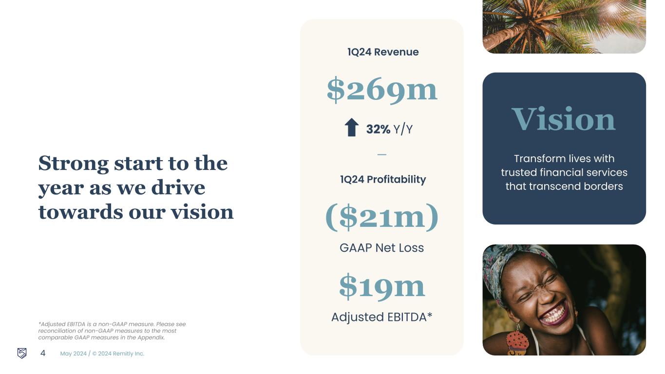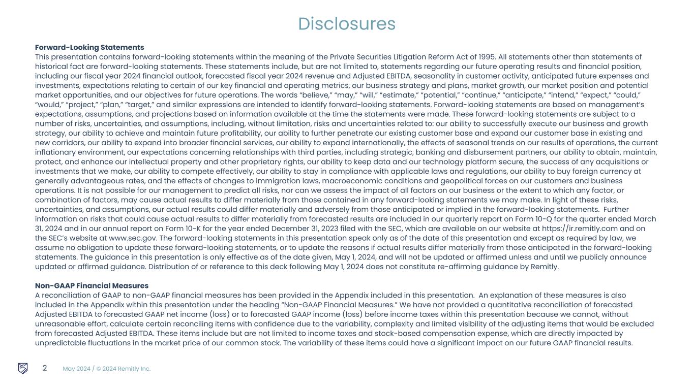 May 2024 / © 2024 Remitly Inc. 2 Disclosures Forward-Looking Statements This presentation contains forward-looking statements within the meaning of the Private Securities Litigation Reform Act of 1995. All statements other than statements of historical fact are forward-looking statements. These statements include, but are not limited to, statements regarding our future operating results and financial position, including our fiscal year 2024 financial outlook, forecasted fiscal year 2024 revenue and Adjusted EBITDA, seasonality in customer activity, anticipated future expenses and investments, expectations relating to certain of our key financial and operating metrics, our business strategy and plans, market growth, our market position and potential market opportunities, and our objectives for future operations. The words “believe,” “may,” “will,” “estimate,” “potential,” “continue,” “anticipate,” “intend,” “expect,” “could,” “would,” “project,” “plan,” “target,” and similar expressions are intended to identify forward-looking statements. Forward-looking statements are based on management’s expectations, assumptions, and projections based on information available at the time the statements were made. These forward-looking statements are subject to a number of risks, uncertainties, and assumptions, including, without limitation, risks and uncertainties related to: our ability to successfully execute our business and growth strategy, our ability to achieve and maintain future profitability, our ability to further penetrate our existing customer base and expand our customer base in existing and new corridors, our ability to expand into broader financial services, our ability to expand internationally, the effects of seasonal trends on our results of operations, the current inflationary environment, our expectations concerning relationships with third parties, including strategic, banking and disbursement partners, our ability to obtain, maintain, protect, and enhance our intellectual property and other proprietary rights, our ability to keep data and our technology platform secure, the success of any acquisitions or investments that we make, our ability to compete effectively, our ability to stay in compliance with applicable laws and regulations, our ability to buy foreign currency at generally advantageous rates, and the effects of changes to immigration laws, macroeconomic conditions and geopolitical forces on our customers and business operations. It is not possible for our management to predict all risks, nor can we assess the impact of all factors on our business or the extent to which any factor, or combination of factors, may cause actual results to differ materially from those contained in any forward-looking statements we may make. In light of these risks, uncertainties, and assumptions, our actual results could differ materially and adversely from those anticipated or implied in the forward-looking statements. Further information on risks that could cause actual results to differ materially from forecasted results are included in our quarterly report on Form 10-Q for the quarter ended March 31, 2024 and in our annual report on Form 10-K for the year ended December 31, 2023 filed with the SEC, which are available on our website at https://ir.remitly.com and on the SEC’s website at www.sec.gov. The forward-looking statements in this presentation speak only as of the date of this presentation and except as required by law, we assume no obligation to update these forward-looking statements, or to update the reasons if actual results differ materially from those anticipated in the forward-looking statements. The guidance in this presentation is only effective as of the date given, May 1, 2024, and will not be updated or affirmed unless and until we publicly announce updated or affirmed guidance. Distribution of or reference to this deck following May 1, 2024 does not constitute re-affirming guidance by Remitly. Non-GAAP Financial Measures A reconciliation of GAAP to non-GAAP financial measures has been provided in the Appendix included in this presentation. An explanation of these measures is also included in the Appendix within this presentation under the heading “Non-GAAP Financial Measures.” We have not provided a quantitative reconciliation of forecasted Adjusted EBITDA to forecasted GAAP net income (loss) or to forecasted GAAP income (loss) before income taxes within this presentation because we cannot, without unreasonable effort, calculate certain reconciling items with confidence due to the variability, complexity and limited visibility of the adjusting items that would be excluded from forecasted Adjusted EBITDA. These items include but are not limited to income taxes and stock-based compensation expense, which are directly impacted by unpredictable fluctuations in the market price of our common stock. The variability of these items could have a significant impact on our future GAAP financial results.