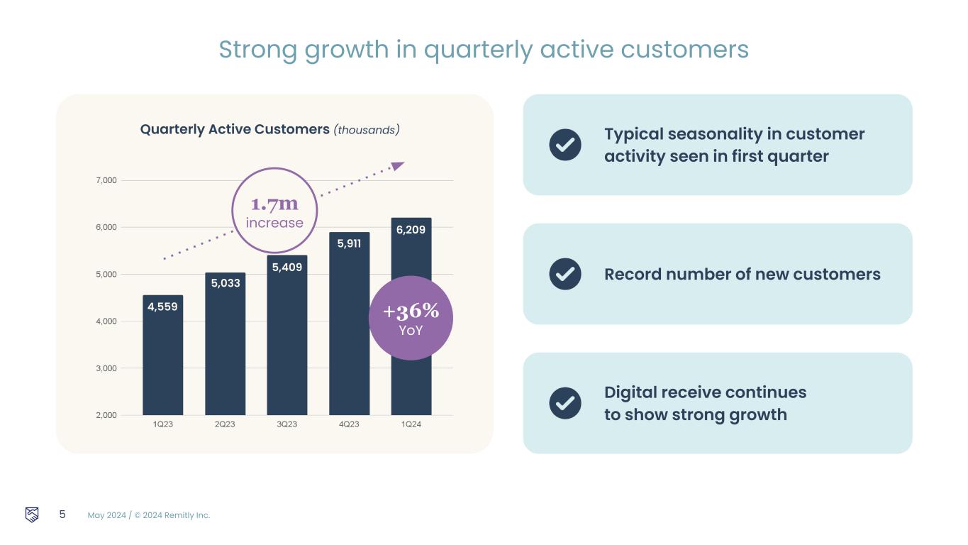 May 2024 / © 2024 Remitly Inc. 1Q24 Revenue $269m 32% Y/Y — 1Q24 Profitability ($21m) GAAP Net Loss $19m Adjusted EBITDA* 4 *Adjusted EBITDA is a non-GAAP measure. Please see reconciliation of non-GAAP measures to the most comparable GAAP measures in the Appendix. Strong start to the year as we drive towards our vision Vision Transform lives with trusted financial services that transcend borders
