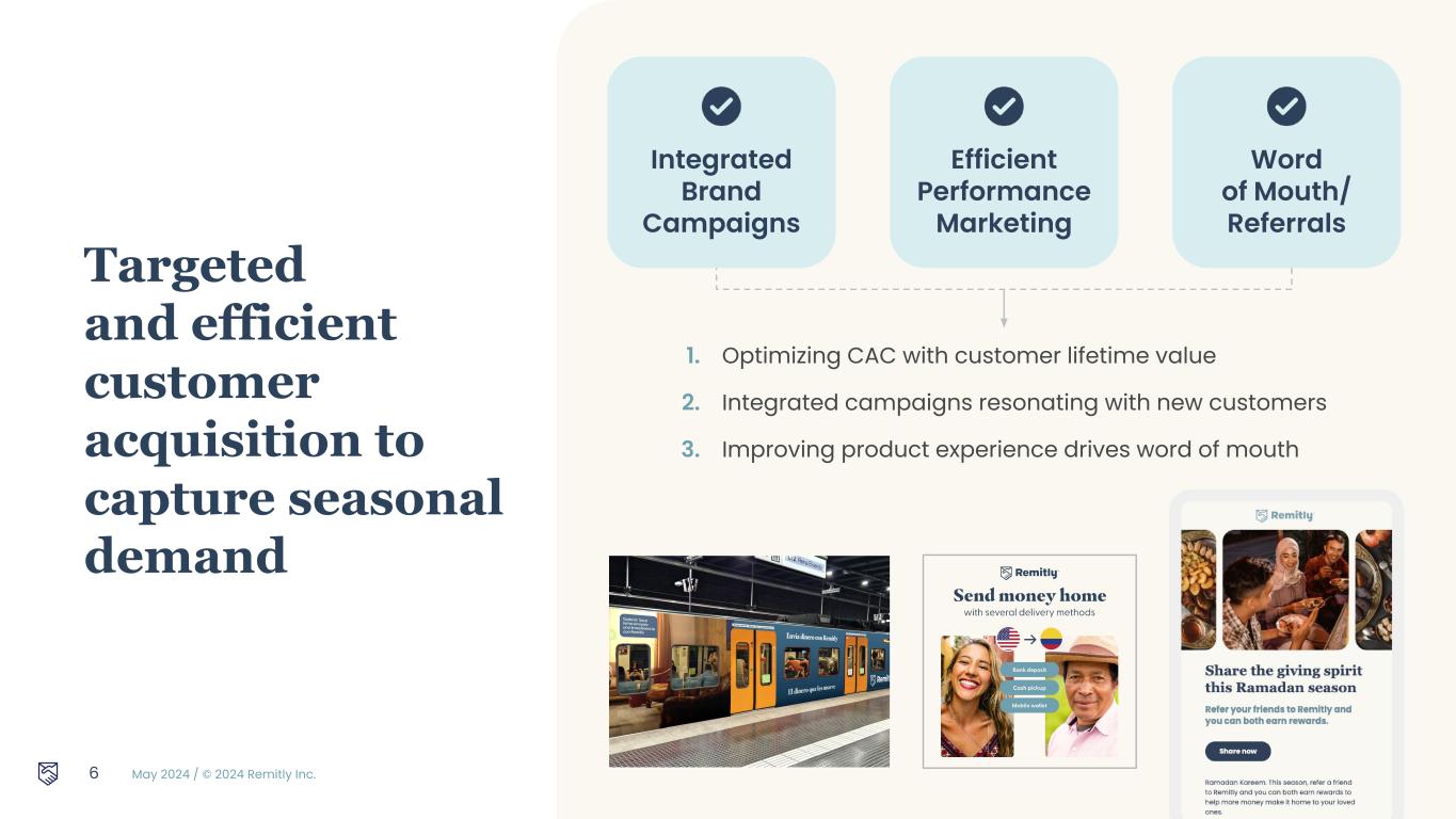 May 2024 / © 2024 Remitly Inc. 5 Quarterly Active Customers (thousands) Strong growth in quarterly active customers 4,559 +36% YoY 5,033 Record number of new customers Digital receive continues to show strong growth 5,409 1.7m increase 5,911 6,209 Typical seasonality in customer activity seen in first quarter