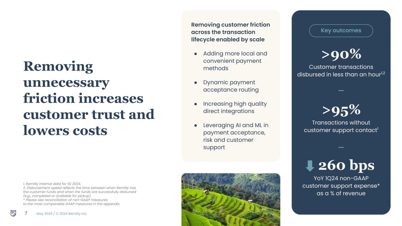 May 2024 / © 2024 Remitly Inc. 6 Targeted and efficient customer acquisition to capture seasonal demand Integrated Brand Campaigns Word of Mouth/ Referrals Efficient Performance Marketing 1. Optimizing CAC with customer lifetime value 2. Integrated campaigns resonating with new customers 3. Improving product experience drives word of mouth