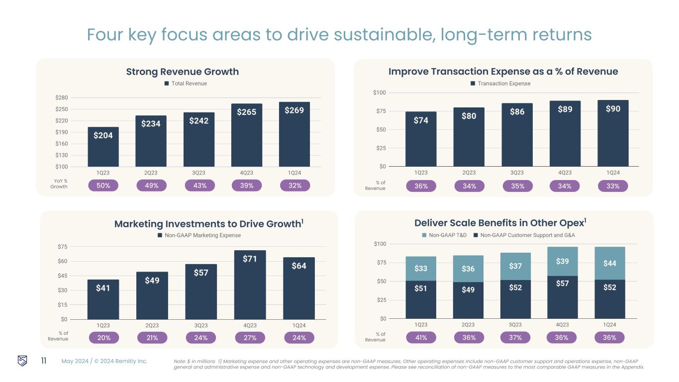 May 2024 / © 2024 Remitly Inc. 1Q — Strong start to 2024 Scale 6.2m 36% growth in quarterly active customers over 1Q 2023 $11.5b 34% growth in send volume over 1Q 2023 Revenue $269m 32% growth in revenue over 1Q 2023 10 Profitability ($21m) GAAP Net Loss $19m Adjusted EBITDA* *Adjusted EBITDA is a non-GAAP measure. Please see reconciliation of non-GAAP measures to the most comparable GAAP measures in the Appendix.