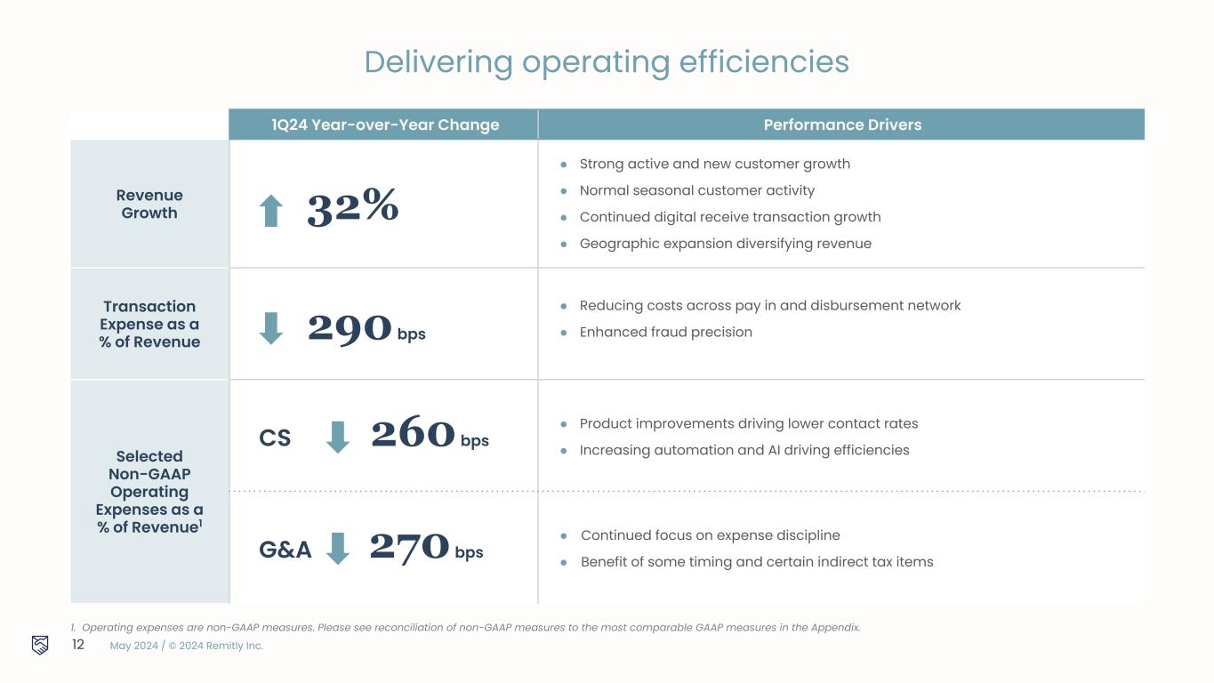 May 2024 / © 2024 Remitly Inc. 11 Strong Revenue Growth Note: $ in millions. 1) Marketing expense and other operating expenses are non-GAAP measures. Other operating expenses include non-GAAP customer support and operations expense, non-GAAP general and administrative expense and non-GAAP technology and development expense. Please see reconciliation of non-GAAP measures to the most comparable GAAP measures in the Appendix. YoY % Growth 50% 49% 43% 39% 32% Marketing Investments to Drive Growth1 % of Revenue 20% 21% 24% 27% 24% % of Revenue 36% 34% 35% 34% 33% Improve Transaction Expense as a % of Revenue Four key focus areas to drive sustainable, long-term returns Deliver Scale Benefits in Other Opex1 % of Revenue 41% 36% 37% 36% 36%
