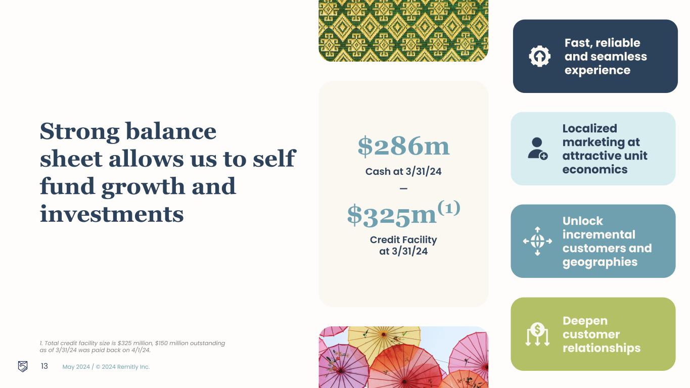 May 2024 / © 2024 Remitly Inc. 1. Operating expenses are non-GAAP measures. Please see reconciliation of non-GAAP measures to the most comparable GAAP measures in the Appendix. 1Q24 Year-over-Year Change Performance Drivers Revenue Growth 32% ● Strong active and new customer growth ● Normal seasonal customer activity ● Continued digital receive transaction growth ● Geographic expansion diversifying revenue Transaction Expense as a % of Revenue 290 bps ● Reducing costs across pay in and disbursement network ● Enhanced fraud precision Selected Non-GAAP Operating Expenses as a % of Revenue1 CS 260 bps ● Product improvements driving lower contact rates ● Increasing automation and AI driving efficiencies G&A 270 bps ● Continued focus on expense discipline ● Benefit of some timing and certain indirect tax items 12 Delivering operating efficiencies