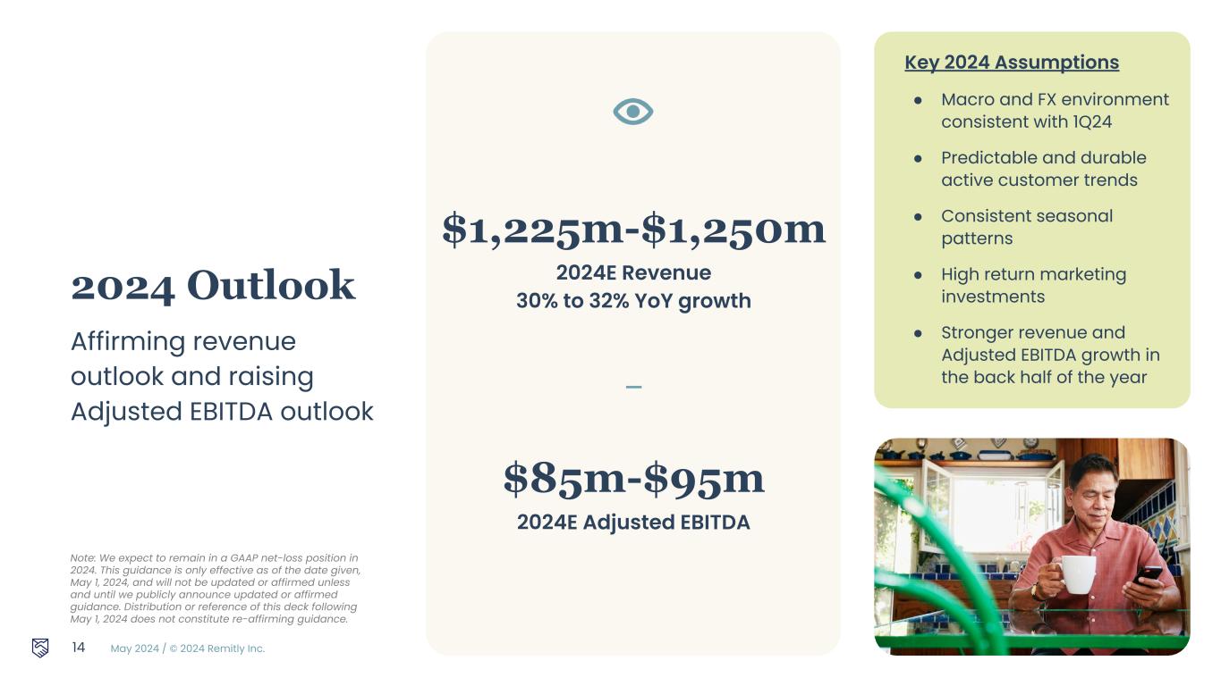 May 2024 / © 2024 Remitly Inc. Deepen customer relationships Fast, reliable and seamless experience Unlock incremental customers and geographies Localized marketing at attractive unit economics Strong balance sheet allows us to self fund growth and investments $286m Cash at 3/31/24 — $325m(1) Credit Facility at 3/31/24 13 1. Total credit facility size is $325 million, $150 million outstanding as of 3/31/24 was paid back on 4/1/24.