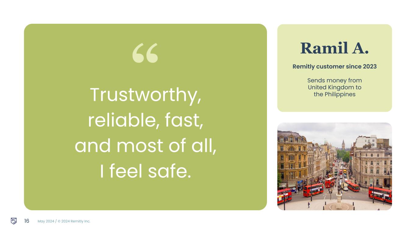 May 2024 / © 2024 Remitly Inc. “ Ramil A. Remitly customer since 2023 Sends money from United Kingdom to the PhilippinesTrustworthy, reliable, fast, and most of all, I feel safe. 16