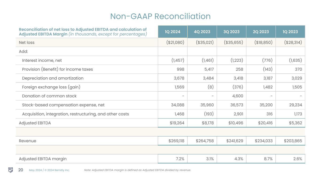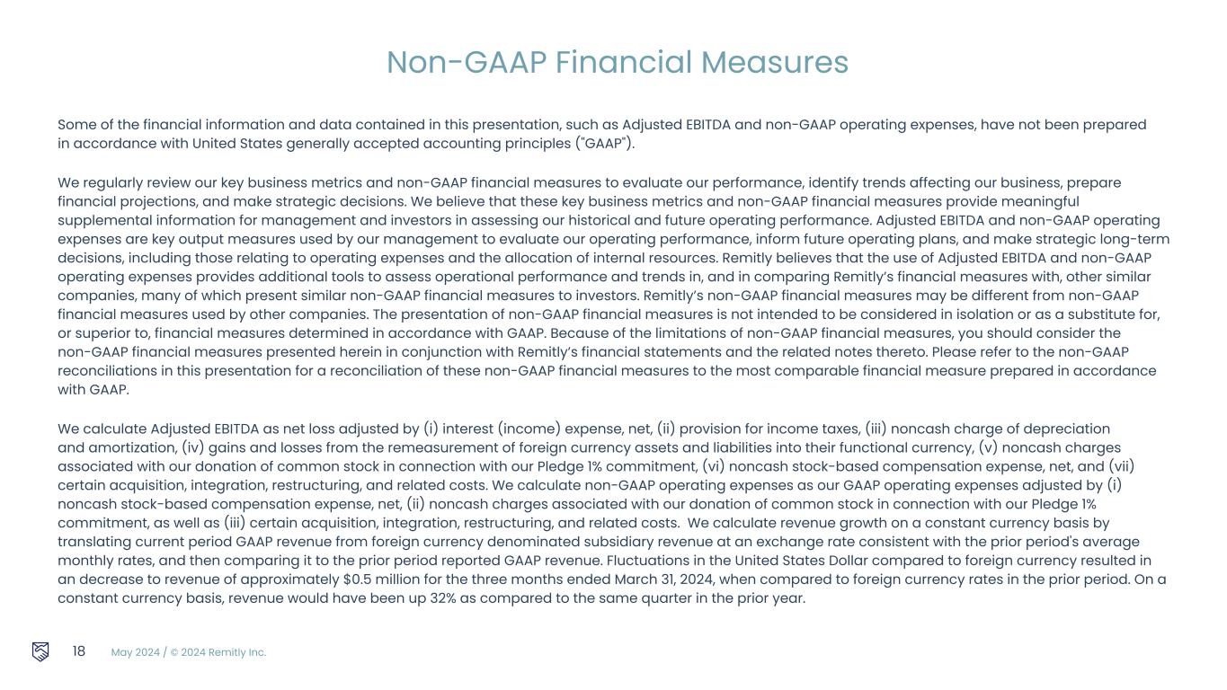 May 2024 / © 2024 Remitly Inc. Some of the financial information and data contained in this presentation, such as Adjusted EBITDA and non-GAAP operating expenses, have not been prepared in accordance with United States generally accepted accounting principles ("GAAP"). We regularly review our key business metrics and non-GAAP financial measures to evaluate our performance, identify trends affecting our business, prepare financial projections, and make strategic decisions. We believe that these key business metrics and non-GAAP financial measures provide meaningful supplemental information for management and investors in assessing our historical and future operating performance. Adjusted EBITDA and non-GAAP operating expenses are key output measures used by our management to evaluate our operating performance, inform future operating plans, and make strategic long-term decisions, including those relating to operating expenses and the allocation of internal resources. Remitly believes that the use of Adjusted EBITDA and non-GAAP operating expenses provides additional tools to assess operational performance and trends in, and in comparing Remitly’s financial measures with, other similar companies, many of which present similar non-GAAP financial measures to investors. Remitly’s non-GAAP financial measures may be different from non-GAAP financial measures used by other companies. The presentation of non-GAAP financial measures is not intended to be considered in isolation or as a substitute for, or superior to, financial measures determined in accordance with GAAP. Because of the limitations of non-GAAP financial measures, you should consider the non-GAAP financial measures presented herein in conjunction with Remitly’s financial statements and the related notes thereto. Please refer to the non-GAAP reconciliations in this presentation for a reconciliation of these non-GAAP financial measures to the most comparable financial measure prepared in accordance with GAAP. We calculate Adjusted EBITDA as net loss adjusted by (i) interest (income) expense, net, (ii) provision for income taxes, (iii) noncash charge of depreciation and amortization, (iv) gains and losses from the remeasurement of foreign currency assets and liabilities into their functional currency, (v) noncash charges associated with our donation of common stock in connection with our Pledge 1% commitment, (vi) noncash stock-based compensation expense, net, and (vii) certain acquisition, integration, restructuring, and related costs. We calculate non-GAAP operating expenses as our GAAP operating expenses adjusted by (i) noncash stock-based compensation expense, net, (ii) noncash charges associated with our donation of common stock in connection with our Pledge 1% commitment, as well as (iii) certain acquisition, integration, restructuring, and related costs. We calculate revenue growth on a constant currency basis by translating current period GAAP revenue from foreign currency denominated subsidiary revenue at an exchange rate consistent with the prior period's average monthly rates, and then comparing it to the prior period reported GAAP revenue. Fluctuations in the United States Dollar compared to foreign currency resulted in an decrease to revenue of approximately $0.5 million for the three months ended March 31, 2024, when compared to foreign currency rates in the prior period. On a constant currency basis, revenue would have been up 32% as compared to the same quarter in the prior year. 18 Non-GAAP Financial Measures