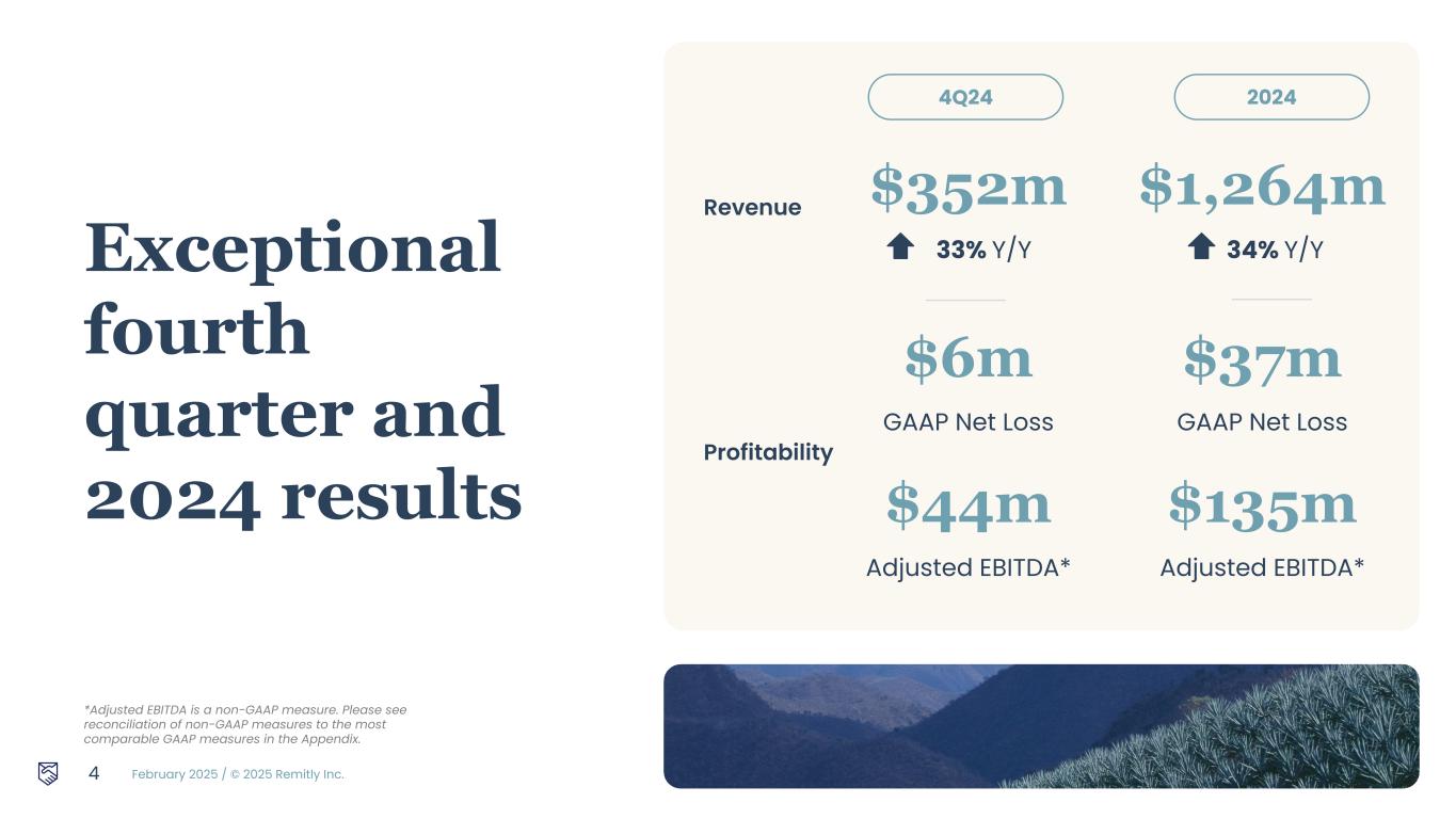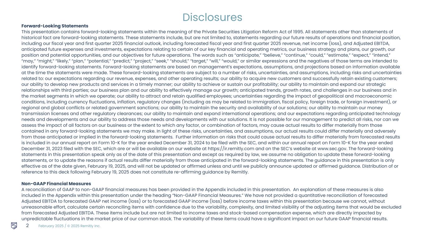 February 2025 / © 2025 Remitly Inc. 2 Disclosures Forward-Looking Statements This presentation contains forward-looking statements within the meaning of the Private Securities Litigation Reform Act of 1995. All statements other than statements of historical fact are forward-looking statements. These statements include, but are not limited to, statements regarding our future results of operations and financial position, including our fiscal year and first quarter 2025 financial outlook, including forecasted fiscal year and first quarter 2025 revenue, net income (loss), and Adjusted EBITDA, anticipated future expenses and investments, expectations relating to certain of our key financial and operating metrics, our business strategy and plans, our growth, our position and potential opportunities, and our objectives for future operations. The words such as “anticipate,” “believe,” “continue,” “could,” “estimate,” “expect,” “intend,” “may,” “might,” “likely,” “plan,” “potential,” “predict,” “project,” “seek,” “should,” “target,” “will,” “would,” or similar expressions and the negatives of those terms are intended to identify forward-looking statements. Forward-looking statements are based on management’s expectations, assumptions, and projections based on information available at the time the statements were made. These forward-looking statements are subject to a number of risks, uncertainties, and assumptions, including risks and uncertainties related to: our expectations regarding our revenue, expenses, and other operating results; our ability to acquire new customers and successfully retain existing customers; our ability to develop new products and services in a timely manner; our ability to achieve or sustain our profitability; our ability to maintain and expand our strategic relationships with third parties; our business plan and our ability to effectively manage our growth; anticipated trends, growth rates, and challenges in our business and in the market segments in which we operate; our ability to attract and retain qualified employees; uncertainties regarding the impact of geopolitical and macroeconomic conditions, including currency fluctuations, inflation, regulatory changes (including as may be related to immigration, fiscal policy, foreign trade, or foreign investment), or regional and global conflicts or related government sanctions; our ability to maintain the security and availability of our solutions; our ability to maintain our money transmission licenses and other regulatory clearances; our ability to maintain and expand international operations; and our expectations regarding anticipated technology needs and developments and our ability to address those needs and developments with our solutions. It is not possible for our management to predict all risks, nor can we assess the impact of all factors on our business or the extent to which any factor, or combination of factors, may cause actual results to differ materially from those contained in any forward-looking statements we may make. In light of these risks, uncertainties, and assumptions, our actual results could differ materially and adversely from those anticipated or implied in the forward-looking statements. Further information on risks that could cause actual results to differ materially from forecasted results is included in our annual report on Form 10-K for the year ended December 31, 2024 to be filed with the SEC, and within our annual report on Form 10-K for the year ended December 31, 2023 filed with the SEC, which are or will be available on our website at https://ir.remitly.com and on the SEC’s website at www.sec.gov. The forward-looking statements in this presentation speak only as of the date of this presentation and except as required by law, we assume no obligation to update these forward-looking statements, or to update the reasons if actual results differ materially from those anticipated in the forward-looking statements. The guidance in this presentation is only effective as of the date given, February 19, 2025, and will not be updated or affirmed unless and until we publicly announce updated or affirmed guidance. Distribution of or reference to this deck following February 19, 2025 does not constitute re-affirming guidance by Remitly. Non-GAAP Financial Measures A reconciliation of GAAP to non-GAAP financial measures has been provided in the Appendix included in this presentation. An explanation of these measures is also included in the Appendix within this presentation under the heading “Non-GAAP Financial Measures.” We have not provided a quantitative reconciliation of forecasted Adjusted EBITDA to forecasted GAAP net income (loss) or to forecasted GAAP income (loss) before income taxes within this presentation because we cannot, without unreasonable effort, calculate certain reconciling items with confidence due to the variability, complexity, and limited visibility of the adjusting items that would be excluded from forecasted Adjusted EBITDA. These items include but are not limited to income taxes and stock-based compensation expense, which are directly impacted by unpredictable fluctuations in the market price of our common stock. The variability of these items could have a significant impact on our future GAAP financial results.
