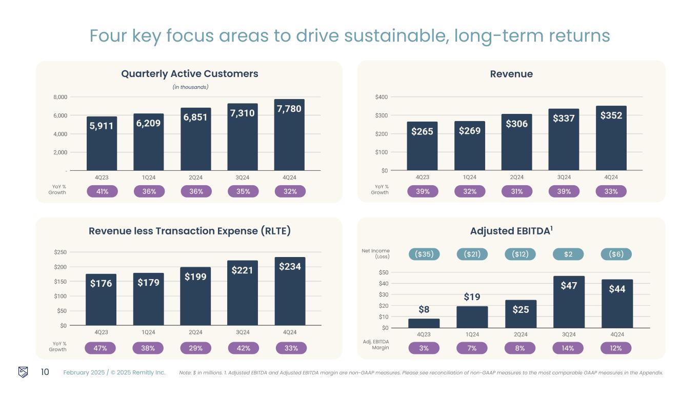 February 2025 / © 2025 Remitly Inc. 4Q — Strong execution Scale 7.8m 32% growth in quarterly active customers over 4Q 2023 $15.4b 39% growth in send volume over 4Q 2023 Revenue $351.9m 33% growth in revenue over 4Q 2023 9 Profitability $5.7m GAAP Net Loss $43.7m Adjusted EBITDA* *Adjusted EBITDA is a non-GAAP measure. Please see reconciliation of non-GAAP measures to the most comparable GAAP measures in the Appendix.