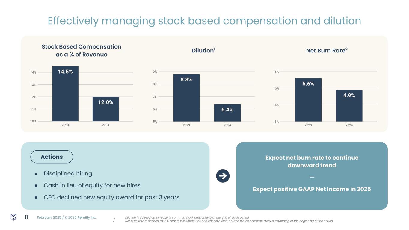 February 2025 / © 2025 Remitly Inc. Stock Based Compensation as a % of Revenue 11 ● Disciplined hiring ● Cash in lieu of equity for new hires ● CEO declined new equity award for past 3 years Effectively managing stock based compensation and dilution 1. Dilution is defined as increase in common stock outstanding at the end of each period. 2. Net burn rate is defined as RSU grants less forfeitures and cancellations, divided by the common stock outstanding at the beginning of the period. Expect net burn rate to continue downward trend — Expect positive GAAP Net Income in 2025 Dilution1 Net Burn Rate2 Actions