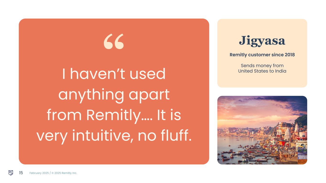 February 2025 / © 2025 Remitly Inc. “ Jigyasa Remitly customer since 2018 Sends money from United States to India 15 I haven’t used anything apart from Remitly…. It is very intuitive, no fluff.