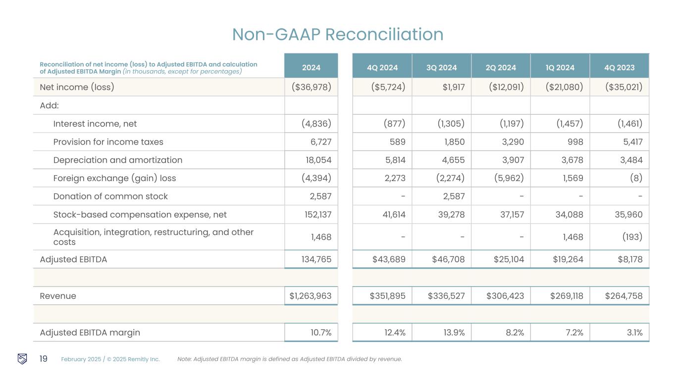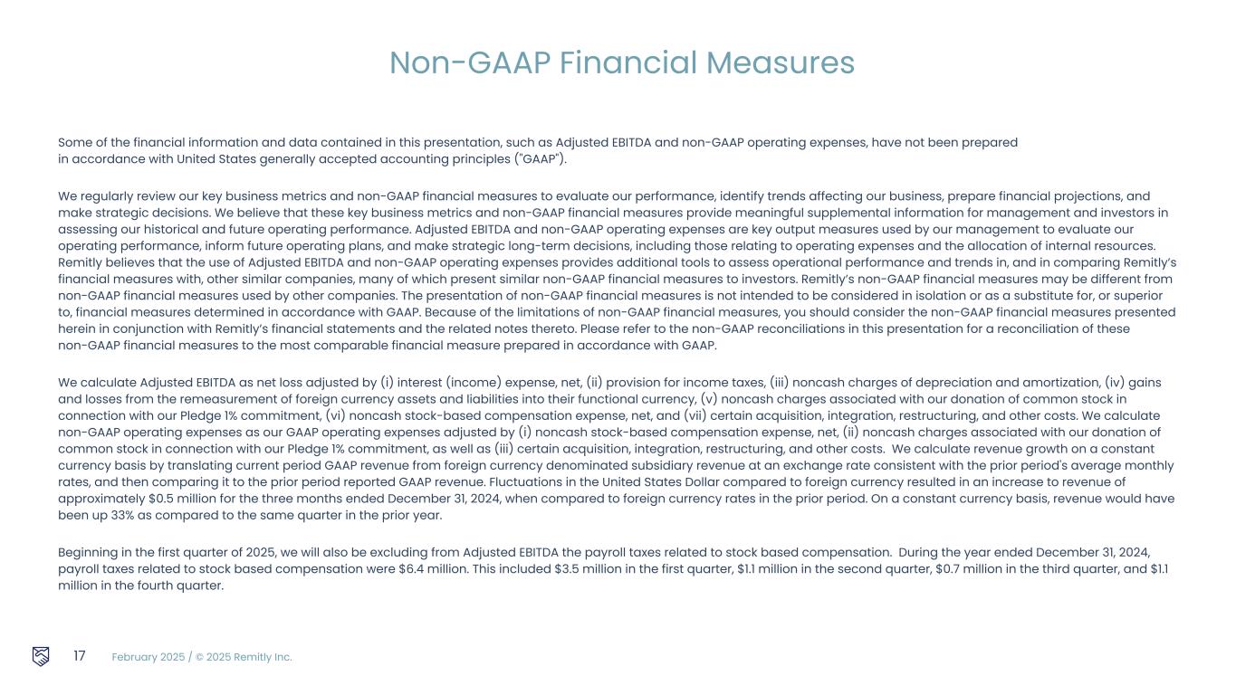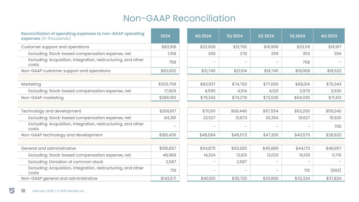 February 2025 / © 2025 Remitly Inc. Some of the financial information and data contained in this presentation, such as Adjusted EBITDA and non-GAAP operating expenses, have not been prepared in accordance with United States generally accepted accounting principles ("GAAP"). We regularly review our key business metrics and non-GAAP financial measures to evaluate our performance, identify trends affecting our business, prepare financial projections, and make strategic decisions. We believe that these key business metrics and non-GAAP financial measures provide meaningful supplemental information for management and investors in assessing our historical and future operating performance. Adjusted EBITDA and non-GAAP operating expenses are key output measures used by our management to evaluate our operating performance, inform future operating plans, and make strategic long-term decisions, including those relating to operating expenses and the allocation of internal resources. Remitly believes that the use of Adjusted EBITDA and non-GAAP operating expenses provides additional tools to assess operational performance and trends in, and in comparing Remitly’s financial measures with, other similar companies, many of which present similar non-GAAP financial measures to investors. Remitly’s non-GAAP financial measures may be different from non-GAAP financial measures used by other companies. The presentation of non-GAAP financial measures is not intended to be considered in isolation or as a substitute for, or superior to, financial measures determined in accordance with GAAP. Because of the limitations of non-GAAP financial measures, you should consider the non-GAAP financial measures presented herein in conjunction with Remitly’s financial statements and the related notes thereto. Please refer to the non-GAAP reconciliations in this presentation for a reconciliation of these non-GAAP financial measures to the most comparable financial measure prepared in accordance with GAAP. We calculate Adjusted EBITDA as net loss adjusted by (i) interest (income) expense, net, (ii) provision for income taxes, (iii) noncash charges of depreciation and amortization, (iv) gains and losses from the remeasurement of foreign currency assets and liabilities into their functional currency, (v) noncash charges associated with our donation of common stock in connection with our Pledge 1% commitment, (vi) noncash stock-based compensation expense, net, and (vii) certain acquisition, integration, restructuring, and other costs. We calculate non-GAAP operating expenses as our GAAP operating expenses adjusted by (i) noncash stock-based compensation expense, net, (ii) noncash charges associated with our donation of common stock in connection with our Pledge 1% commitment, as well as (iii) certain acquisition, integration, restructuring, and other costs. We calculate revenue growth on a constant currency basis by translating current period GAAP revenue from foreign currency denominated subsidiary revenue at an exchange rate consistent with the prior period's average monthly rates, and then comparing it to the prior period reported GAAP revenue. Fluctuations in the United States Dollar compared to foreign currency resulted in an increase to revenue of approximately $0.5 million for the three months ended December 31, 2024, when compared to foreign currency rates in the prior period. On a constant currency basis, revenue would have been up 33% as compared to the same quarter in the prior year. Beginning in the first quarter of 2025, we will also be excluding from Adjusted EBITDA the payroll taxes related to stock based compensation. During the year ended December 31, 2024, payroll taxes related to stock based compensation were $6.4 million. This included $3.5 million in the first quarter, $1.1 million in the second quarter, $0.7 million in the third quarter, and $1.1 million in the fourth quarter. 17 Non-GAAP Financial Measures