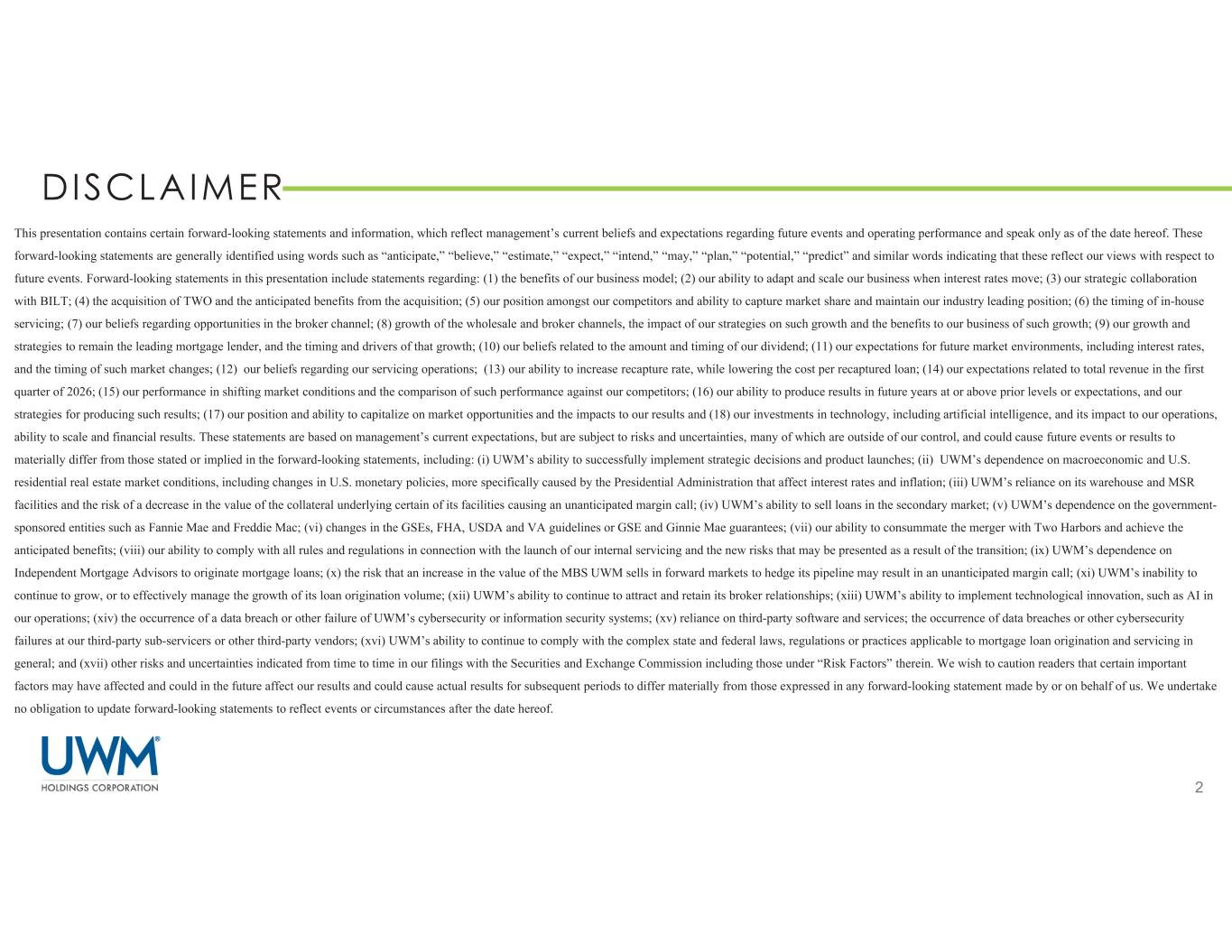 This presentation contains certain forward-looking statements and information, which reflect management’s current beliefs and expectations regarding future events and operating performance and speak only as of the date hereof. These forward-looking statements are generally identified using words such as “anticipate,” “believe,” “estimate,” “expect,” “intend,” “may,” “plan,” “potential,” “predict” and similar words indicating that these reflect our views with respect to future events. Forward-looking statements in this include statements regarding: (1) the benefits of our business model; (2) our ability to adapt and scale our business when interest rates move; (3) our strategic collaboration with BILT; (4) the acquisition of TWO and the anticipated benefits from the acquisition; (5) our position amongst our competitors and ability to capture market share and maintain our industry leading position; (6) the timing of in-house servicing; (7) our beliefs regarding opportunities in the broker channel; (8) growth of the wholesale and broker channels, the impact of our strategies on such growth and the benefits to our business of such growth; (9) our growth and strategies to remain the leading mortgage lender, and the timing and drivers of that growth; (10) our beliefs related to the amount and timing of our dividend; (11) our expectations for future market environments, including interest rates, and the timing of such market changes; (12) our beliefs regarding our servicing operations; (13) our ability to increase recapture rate, while lowering the cost per recaptured loan; (14) our expectations related to total revenue in the first quarter of 2026; (15) our performance in shifting market conditions and the comparison of such performance against our competitors; (16) our ability to produce results in future years at or above prior levels or expectations, and our strategies for producing such results; (17) our position and ability to capitalize on market opportunities and the impacts to our results and (18) our investments in technology, including artificial intelligence, and its impact to our operations, ability to scale and financial results. These statements are based on management’s current expectations, but are subject to risks and uncertainties, many of which are outside of our control, and could cause future events or results to materially differ from those stated or implied in the forward-looking statements, including: (i) UWM’s ability to successfully implement strategic decisions and product launches; (ii) UWM’s dependence on macroeconomic and U.S. residential real estate market conditions, including changes in U.S. monetary policies, more specifically caused by the Presidential Administration that affect interest rates and inflation; (iii) UWM’s reliance on its warehouse and MSR facilities and the risk of a decrease in the value of the collateral underlying certain of its facilities causing an unanticipated margin call; (iv) UWM’s ability to sell loans in the secondary market; (v) UWM’s dependence on the government- sponsored entities such as Fannie Mae and Freddie Mac; (vi) changes in the GSEs, FHA, USDA and VA guidelines or GSE and Ginnie Mae guarantees; (vii) our ability to consummate the merger with Two Harbors and achieve the anticipated benefits; (viii) our ability to comply with all rules and regulations in connection with the launch of our internal servicing and the new risks that may be presented as a result of the transition; (ix) UWM’s dependence on Independent Mortgage Advisors to originate mortgage loans; (x) the risk that an increase in the value of the MBS UWM sells in forward markets to hedge its pipeline may result in an unanticipated margin call; (xi) UWM’s inability to continue to grow, or to effectively manage the growth of its loan origination volume; (xii) UWM’s ability to continue to attract and retain its broker relationships; (xiii) UWM’s ability to implement technological innovation, such as AI in our operations; (xiv) the occurrence of a data breach or other failure of UWM’s cybersecurity or information security systems; (xv) reliance on third-party software and services; the occurrence of data breaches or other cybersecurity failures at our third-party sub-servicers or other third-party vendors; (xvi) UWM’s ability to continue to comply with the complex state and federal laws, regulations or practices applicable to mortgage loan origination and servicing in general; and (xvii) other risks and uncertainties indicated from time to time in our filings with the Securities and Exchange Commission including those under “Risk Factors” therein. We wish to caution readers that certain important factors may have affected and could in the future affect our results and could cause actual results for subsequent periods to differ materially from those expressed in any forward-looking statement made by or on behalf of us. We undertake no obligation to update forward-looking statements to reflect events or circumstances after the date hereof. DISCLAIMER 2