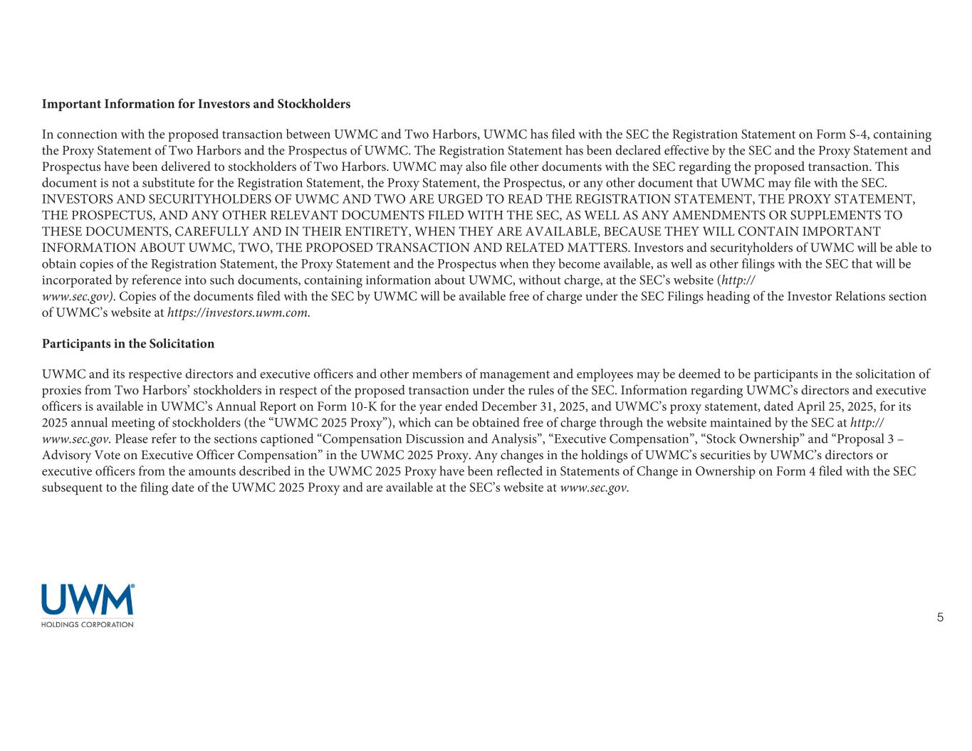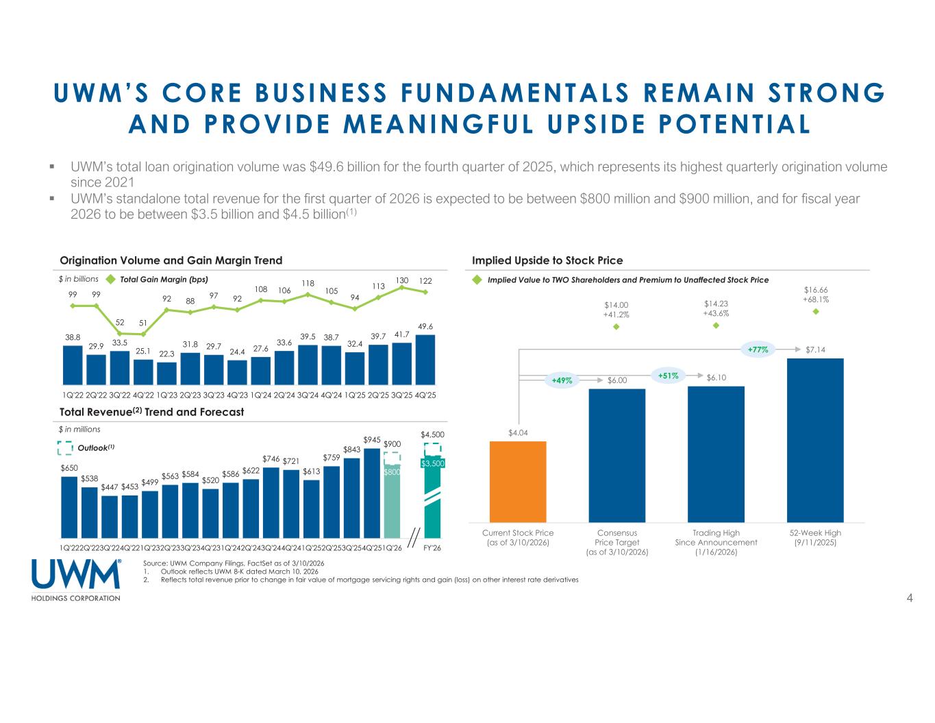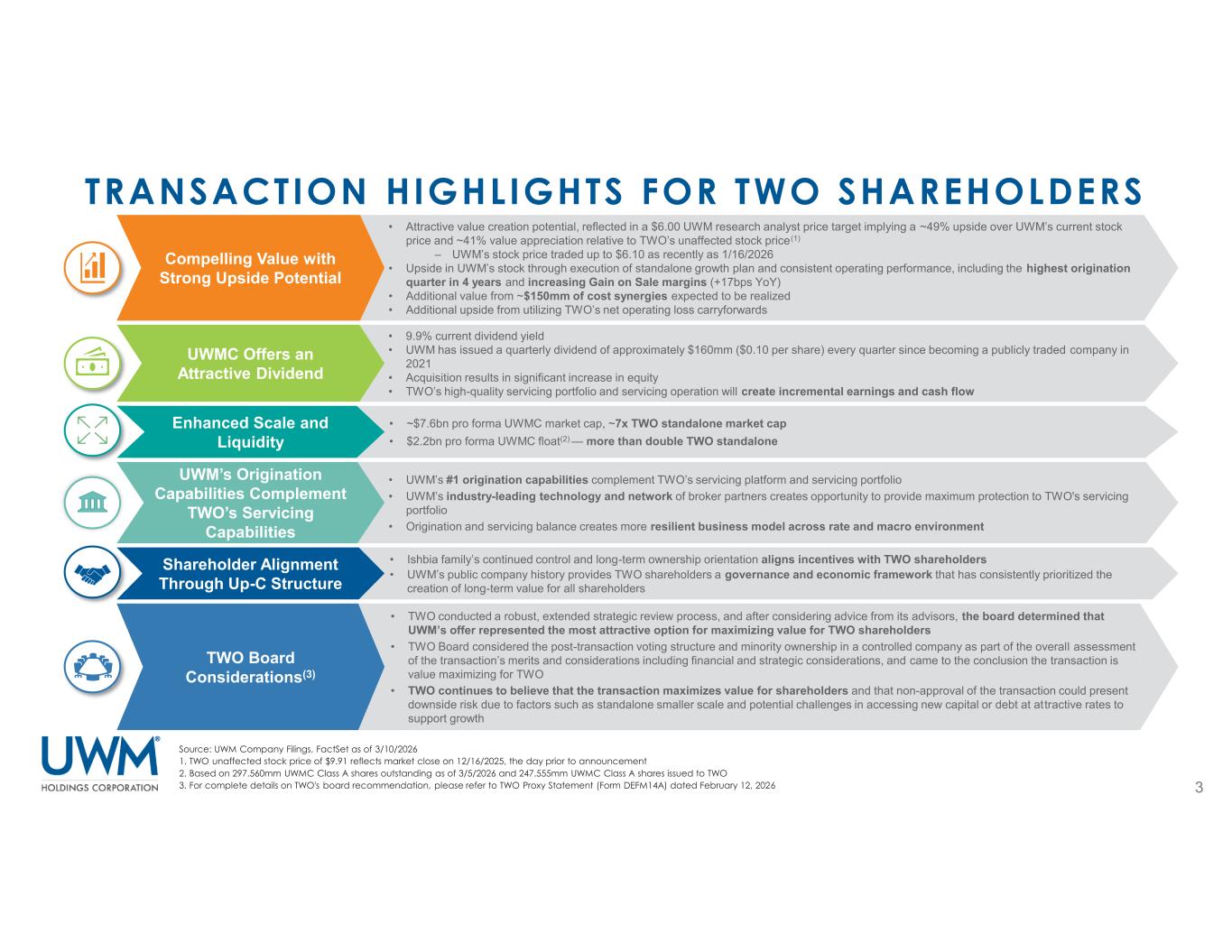 3 • ~$7.6bn pro forma UWMC market cap, ~7x TWO standalone market cap • $2.2bn pro forma UWMC float(2) — more than double TWO standalone Enhanced Scale and Liquidity • 9.9% current dividend yield • UWM has issued a quarterly dividend of approximately $160mm ($0.10 per share) every quarter since becoming a publicly traded company in 2021 • Acquisition results in significant increase in equity • TWO’s high-quality servicing portfolio and servicing operation will create incremental earnings and cash flow UWMC Offers an Attractive Dividend s • UWM’s #1 origination capabilities complement TWO’s servicing platform and servicing portfolio • UWM’s industry-leading technology and network of broker partners creates opportunity to provide maximum protection to TWO's servicing portfolio • Origination and servicing balance creates more resilient business model across rate and macro environment UWM’s Origination Capabilities Complement TWO’s Servicing Capabilities Source: UWM Company Filings, FactSet as of 3/10/2026 1. TWO unaffected stock price of $9.91 reflects market close on 12/16/2025, the day prior to announcement 2. Based on 297.560mm UWMC Class A shares outstanding as of 3/5/2026 and 247.555mm UWMC Class A shares issued to TWO 3. For complete details on TWO's board recommendation, please refer to TWO Proxy Statement (Form DEFM14A) dated February 12, 2026 TRANSACTION HIGHLIGHTS FOR TWO SHAREHOLDERS • Ishbia family’s continued control and long-term ownership orientation aligns incentives with TWO shareholders • UWM’s public company history provides TWO shareholders a governance and economic framework that has consistently prioritized the creation of long-term value for all shareholders Shareholder Alignment Through Up-C Structure • TWO conducted a robust, extended strategic review process, and after considering advice from its advisors, the board determined that UWM’s offer represented the most attractive option for maximizing value for TWO shareholders • TWO Board considered the post-transaction voting structure and minority ownership in a controlled company as part of the overall assessment of the transaction’s merits and considerations including financial and strategic considerations, and came to the conclusion the transaction is value maximizing for TWO • TWO continues to believe that the transaction maximizes value for shareholders and that non-approval of the transaction could present downside risk due to factors such as standalone smaller scale and potential challenges in accessing new capital or debt at attractive rates to support growth TWO Board Considerations(3) • Attractive value creation potential, reflected in a $6.00 UWM research analyst price target implying a ~49% upside over UWM’s current stock price and ~41% value appreciation relative to TWO’s unaffected stock price(1) UWM’s stock price traded up to $6.10 as recently as 1/16/2026 • Upside in UWM’s stock through execution of standalone growth plan and consistent operating performance, including the highest origination quarter in 4 years and increasing Gain on Sale margins (+17bps YoY) • Additional value from ~$150mm of cost synergies expected to be realized • Additional upside from utilizing TWO’s net operating loss carryforwards Compelling Value with Strong Upside Potential