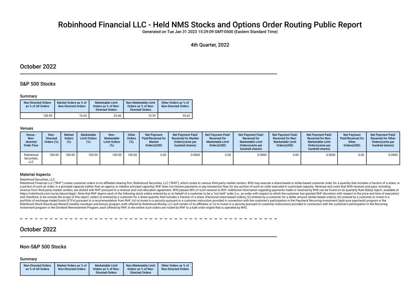 Robinhood Financial LLC - Held NMS Stocks and Options Order Routing Public Report Generated on Tue Jan 31 2023 15:29:09 GMT-0500 (Eastern Standard Time) 4th Quarter, 2022 October 2022 S&P 500 Stocks Summary Non-Directed Orders as % of All Orders Market Orders as % of Non-Directed Orders Marketable Limit Orders as % of Non- Directed Orders Non-Marketable Limit Orders as % of Non- Directed Orders Other Orders as % of Non-Directed Orders 100.00 10.63 23.46 10.29 55.62 Venues Venue - Non- directed Order Flow Non- Directed Orders (%) Market Orders (%) Marketable Limit Orders (%) Non- Marketable Limit Orders (%) Other Orders (%) Net Payment Paid/Received for Market Orders(USD) Net Payment Paid/ Received for Market Orders(cents per hundred shares) Net Payment Paid/ Received for Marketable Limit Orders(USD) Net Payment Paid/ Received for Marketable Limit Orders(cents per hundred shares) Net Payment Paid/ Received for Non- Marketable Limit Orders(USD) Net Payment Paid/ Received for Non- Marketable Limit Orders(cents per hundred shares) Net Payment Paid/Received for Other Orders(USD) Net Payment Paid/ Received for Other Orders(cents per hundred shares) Robinhood Securities, LLC 100.00 100.00 100.00 100.00 100.00 0.00 0.0000 0.00 0.0000 0.00 0.0000 0.00 0.0000 Material Aspects: Robinhood Securities, LLC: Robinhood Financial LLC (“RHF”) routes customer orders to its affiliated clearing firm, Robinhood Securities, LLC (“RHS”), which routes to various third-party market centers. RHS may execute a share-based or dollar-based customer order for a quantity that includes a fraction of a share, or a portion of such an order, in a principal capacity (rather than an agency or riskless principal capacity); RHF does not receive payments or pay transaction fees for any portion of such an order executed in a principal capacity. Revenue and costs that RHS receives and pays, including revenue from third-party market centers, are shared with RHF pursuant to a revenue and cost allocation agreement. RHS passes 80% of such revenue to RHF. Additional information regarding payments made or received by RHS can be found on its quarterly Rule 606(a) report, available at https://robinhood.com/us/en/about/legal/. Note that RHF deems each of the following stock orders entered by or on behalf of a customer to be a “not held” order (i.e., an order with respect to which the customer has granted RHF discretion with respect to the price and time of execution) and, therefore, to be outside the scope of this report: orders (i) entered by a customer for a share quantity that includes a fraction of a share (fractional share-based orders); (ii) entered by a customer for a dollar amount (dollar-based orders); (iii) entered by a customer to invest in a portfolio of exchange traded funds (ETFs) pursuant to a recommendation from RHF; (iv) to invest in a security pursuant to a customer instruction provided in connection with the customer’s participation in the Paycheck Recurring Investment (split-your-paycheck) program or the Robinhood Stock Round-ups Reward (weekly roundups and bonus) program, both offered by Robinhood Money, LLC and certain of its affiliates; or (v) to invest in a security pursuant to customer instructions provided in connection with the customer’s participation in the Recurring Investment program or the Dividend Reinvestment Program, each offered by RHF, to the extent such orders are routed by RHF to a bulk order engine that is operated by RHS. October 2022 Non-S&P 500 Stocks Summary Non-Directed Orders as % of All Orders Market Orders as % of Non-Directed Orders Marketable Limit Orders as % of Non- Directed Orders Non-Marketable Limit Orders as % of Non- Directed Orders Other Orders as % of Non-Directed Orders