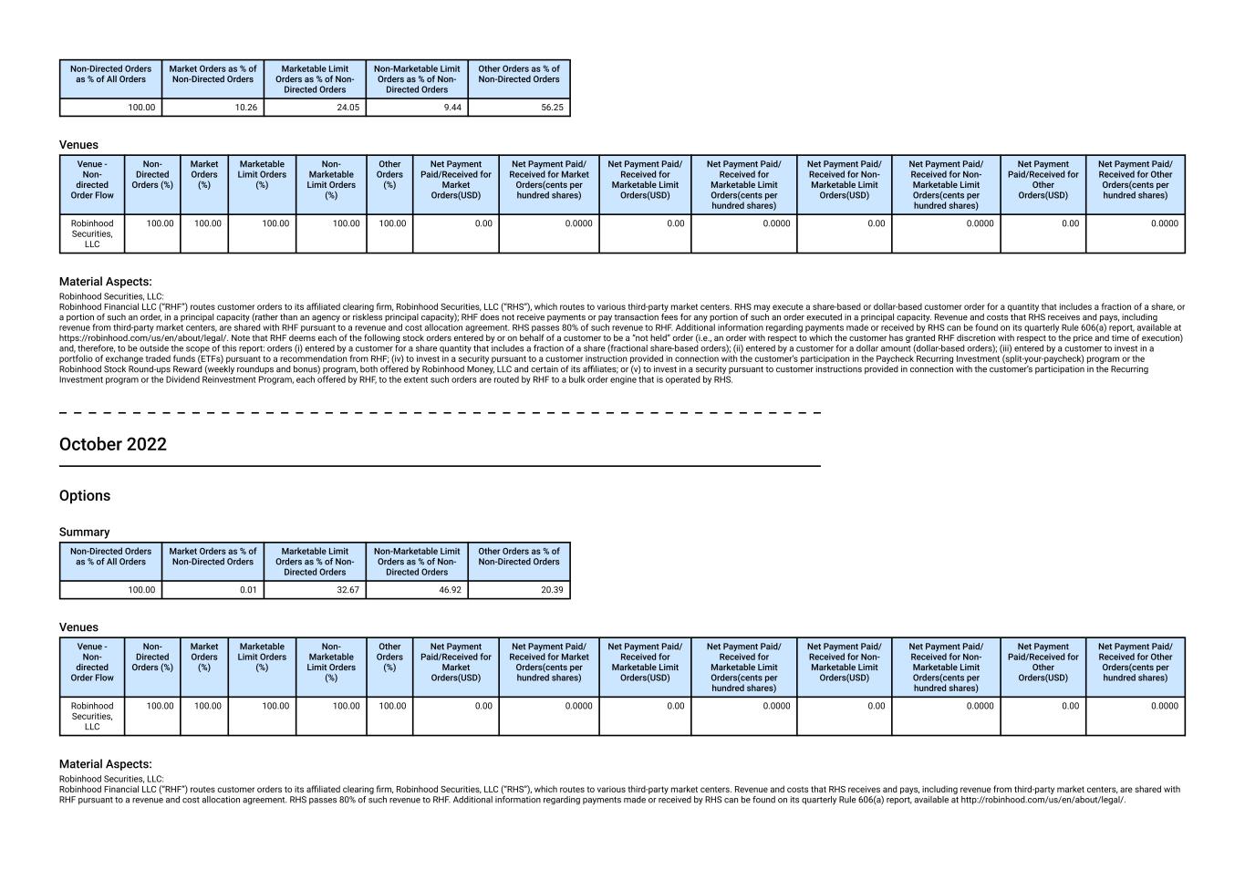 Non-Directed Orders as % of All Orders Market Orders as % of Non-Directed Orders Marketable Limit Orders as % of Non- Directed Orders Non-Marketable Limit Orders as % of Non- Directed Orders Other Orders as % of Non-Directed Orders 100.00 10.26 24.05 9.44 56.25 Venues Venue - Non- directed Order Flow Non- Directed Orders (%) Market Orders (%) Marketable Limit Orders (%) Non- Marketable Limit Orders (%) Other Orders (%) Net Payment Paid/Received for Market Orders(USD) Net Payment Paid/ Received for Market Orders(cents per hundred shares) Net Payment Paid/ Received for Marketable Limit Orders(USD) Net Payment Paid/ Received for Marketable Limit Orders(cents per hundred shares) Net Payment Paid/ Received for Non- Marketable Limit Orders(USD) Net Payment Paid/ Received for Non- Marketable Limit Orders(cents per hundred shares) Net Payment Paid/Received for Other Orders(USD) Net Payment Paid/ Received for Other Orders(cents per hundred shares) Robinhood Securities, LLC 100.00 100.00 100.00 100.00 100.00 0.00 0.0000 0.00 0.0000 0.00 0.0000 0.00 0.0000 Material Aspects: Robinhood Securities, LLC: Robinhood Financial LLC (“RHF”) routes customer orders to its affiliated clearing firm, Robinhood Securities, LLC (“RHS”), which routes to various third-party market centers. RHS may execute a share-based or dollar-based customer order for a quantity that includes a fraction of a share, or a portion of such an order, in a principal capacity (rather than an agency or riskless principal capacity); RHF does not receive payments or pay transaction fees for any portion of such an order executed in a principal capacity. Revenue and costs that RHS receives and pays, including revenue from third-party market centers, are shared with RHF pursuant to a revenue and cost allocation agreement. RHS passes 80% of such revenue to RHF. Additional information regarding payments made or received by RHS can be found on its quarterly Rule 606(a) report, available at https://robinhood.com/us/en/about/legal/. Note that RHF deems each of the following stock orders entered by or on behalf of a customer to be a “not held” order (i.e., an order with respect to which the customer has granted RHF discretion with respect to the price and time of execution) and, therefore, to be outside the scope of this report: orders (i) entered by a customer for a share quantity that includes a fraction of a share (fractional share-based orders); (ii) entered by a customer for a dollar amount (dollar-based orders); (iii) entered by a customer to invest in a portfolio of exchange traded funds (ETFs) pursuant to a recommendation from RHF; (iv) to invest in a security pursuant to a customer instruction provided in connection with the customer’s participation in the Paycheck Recurring Investment (split-your-paycheck) program or the Robinhood Stock Round-ups Reward (weekly roundups and bonus) program, both offered by Robinhood Money, LLC and certain of its affiliates; or (v) to invest in a security pursuant to customer instructions provided in connection with the customer’s participation in the Recurring Investment program or the Dividend Reinvestment Program, each offered by RHF, to the extent such orders are routed by RHF to a bulk order engine that is operated by RHS. October 2022 Options Summary Non-Directed Orders as % of All Orders Market Orders as % of Non-Directed Orders Marketable Limit Orders as % of Non- Directed Orders Non-Marketable Limit Orders as % of Non- Directed Orders Other Orders as % of Non-Directed Orders 100.00 0.01 32.67 46.92 20.39 Venues Venue - Non- directed Order Flow Non- Directed Orders (%) Market Orders (%) Marketable Limit Orders (%) Non- Marketable Limit Orders (%) Other Orders (%) Net Payment Paid/Received for Market Orders(USD) Net Payment Paid/ Received for Market Orders(cents per hundred shares) Net Payment Paid/ Received for Marketable Limit Orders(USD) Net Payment Paid/ Received for Marketable Limit Orders(cents per hundred shares) Net Payment Paid/ Received for Non- Marketable Limit Orders(USD) Net Payment Paid/ Received for Non- Marketable Limit Orders(cents per hundred shares) Net Payment Paid/Received for Other Orders(USD) Net Payment Paid/ Received for Other Orders(cents per hundred shares) Robinhood Securities, LLC 100.00 100.00 100.00 100.00 100.00 0.00 0.0000 0.00 0.0000 0.00 0.0000 0.00 0.0000 Material Aspects: Robinhood Securities, LLC: Robinhood Financial LLC (“RHF”) routes customer orders to its affiliated clearing firm, Robinhood Securities, LLC (“RHS”), which routes to various third-party market centers. Revenue and costs that RHS receives and pays, including revenue from third-party market centers, are shared with RHF pursuant to a revenue and cost allocation agreement. RHS passes 80% of such revenue to RHF. Additional information regarding payments made or received by RHS can be found on its quarterly Rule 606(a) report, available at http://robinhood.com/us/en/about/legal/.