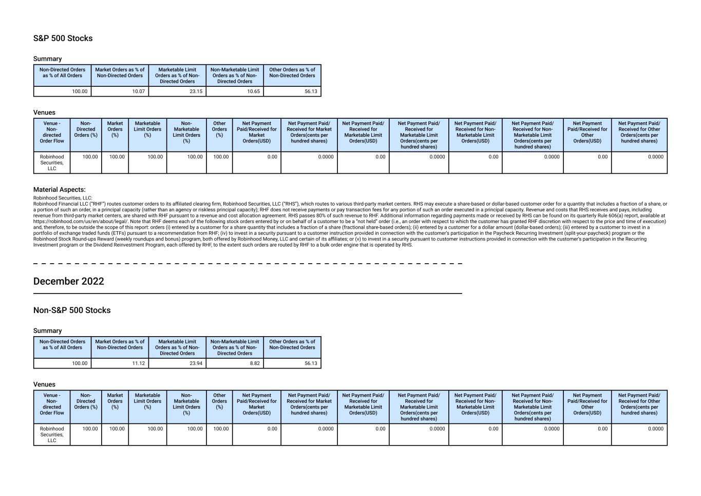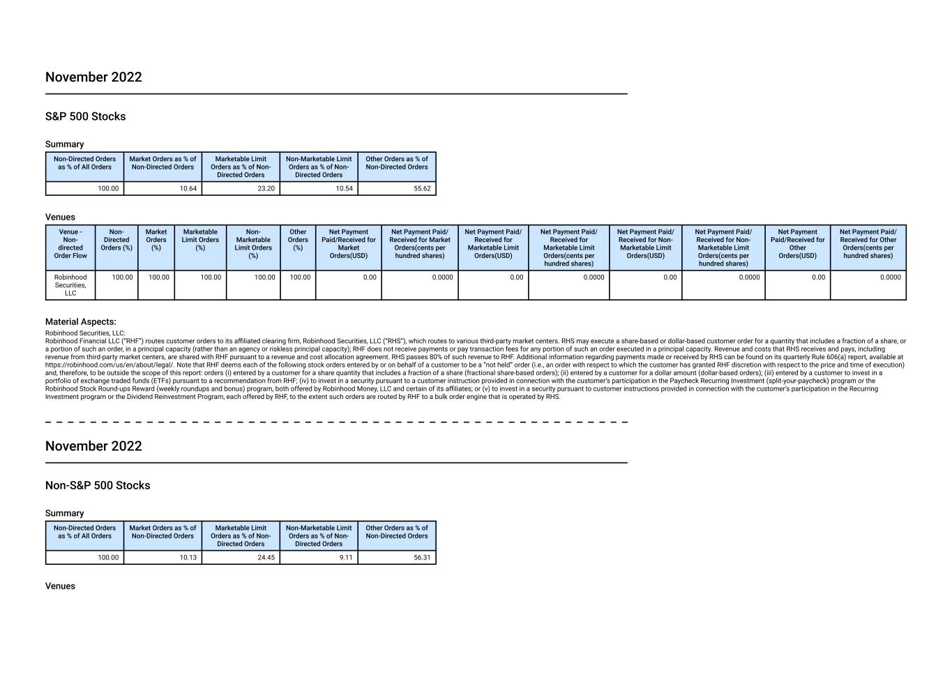 S&P 500 Stocks Summary Non-Directed Orders as % of All Orders Market Orders as % of Non-Directed Orders Marketable Limit Orders as % of Non- Directed Orders Non-Marketable Limit Orders as % of Non- Directed Orders Other Orders as % of Non-Directed Orders 100.00 10.07 23.15 10.65 56.13 Venues Venue - Non- directed Order Flow Non- Directed Orders (%) Market Orders (%) Marketable Limit Orders (%) Non- Marketable Limit Orders (%) Other Orders (%) Net Payment Paid/Received for Market Orders(USD) Net Payment Paid/ Received for Market Orders(cents per hundred shares) Net Payment Paid/ Received for Marketable Limit Orders(USD) Net Payment Paid/ Received for Marketable Limit Orders(cents per hundred shares) Net Payment Paid/ Received for Non- Marketable Limit Orders(USD) Net Payment Paid/ Received for Non- Marketable Limit Orders(cents per hundred shares) Net Payment Paid/Received for Other Orders(USD) Net Payment Paid/ Received for Other Orders(cents per hundred shares) Robinhood Securities, LLC 100.00 100.00 100.00 100.00 100.00 0.00 0.0000 0.00 0.0000 0.00 0.0000 0.00 0.0000 Material Aspects: Robinhood Securities, LLC: Robinhood Financial LLC (“RHF”) routes customer orders to its affiliated clearing firm, Robinhood Securities, LLC (“RHS”), which routes to various third-party market centers. RHS may execute a share-based or dollar-based customer order for a quantity that includes a fraction of a share, or a portion of such an order, in a principal capacity (rather than an agency or riskless principal capacity); RHF does not receive payments or pay transaction fees for any portion of such an order executed in a principal capacity. Revenue and costs that RHS receives and pays, including revenue from third-party market centers, are shared with RHF pursuant to a revenue and cost allocation agreement. RHS passes 80% of such revenue to RHF. Additional information regarding payments made or received by RHS can be found on its quarterly Rule 606(a) report, available at https://robinhood.com/us/en/about/legal/. Note that RHF deems each of the following stock orders entered by or on behalf of a customer to be a “not held” order (i.e., an order with respect to which the customer has granted RHF discretion with respect to the price and time of execution) and, therefore, to be outside the scope of this report: orders (i) entered by a customer for a share quantity that includes a fraction of a share (fractional share-based orders); (ii) entered by a customer for a dollar amount (dollar-based orders); (iii) entered by a customer to invest in a portfolio of exchange traded funds (ETFs) pursuant to a recommendation from RHF; (iv) to invest in a security pursuant to a customer instruction provided in connection with the customer’s participation in the Paycheck Recurring Investment (split-your-paycheck) program or the Robinhood Stock Round-ups Reward (weekly roundups and bonus) program, both offered by Robinhood Money, LLC and certain of its affiliates; or (v) to invest in a security pursuant to customer instructions provided in connection with the customer’s participation in the Recurring Investment program or the Dividend Reinvestment Program, each offered by RHF, to the extent such orders are routed by RHF to a bulk order engine that is operated by RHS. December 2022 Non-S&P 500 Stocks Summary Non-Directed Orders as % of All Orders Market Orders as % of Non-Directed Orders Marketable Limit Orders as % of Non- Directed Orders Non-Marketable Limit Orders as % of Non- Directed Orders Other Orders as % of Non-Directed Orders 100.00 11.12 23.94 8.82 56.13 Venues Venue - Non- directed Order Flow Non- Directed Orders (%) Market Orders (%) Marketable Limit Orders (%) Non- Marketable Limit Orders (%) Other Orders (%) Net Payment Paid/Received for Market Orders(USD) Net Payment Paid/ Received for Market Orders(cents per hundred shares) Net Payment Paid/ Received for Marketable Limit Orders(USD) Net Payment Paid/ Received for Marketable Limit Orders(cents per hundred shares) Net Payment Paid/ Received for Non- Marketable Limit Orders(USD) Net Payment Paid/ Received for Non- Marketable Limit Orders(cents per hundred shares) Net Payment Paid/Received for Other Orders(USD) Net Payment Paid/ Received for Other Orders(cents per hundred shares) Robinhood Securities, LLC 100.00 100.00 100.00 100.00 100.00 0.00 0.0000 0.00 0.0000 0.00 0.0000 0.00 0.0000