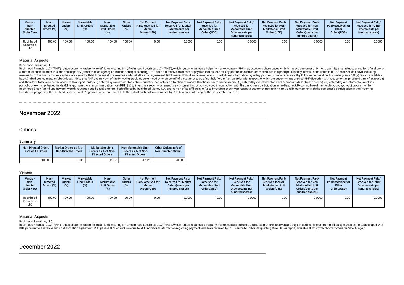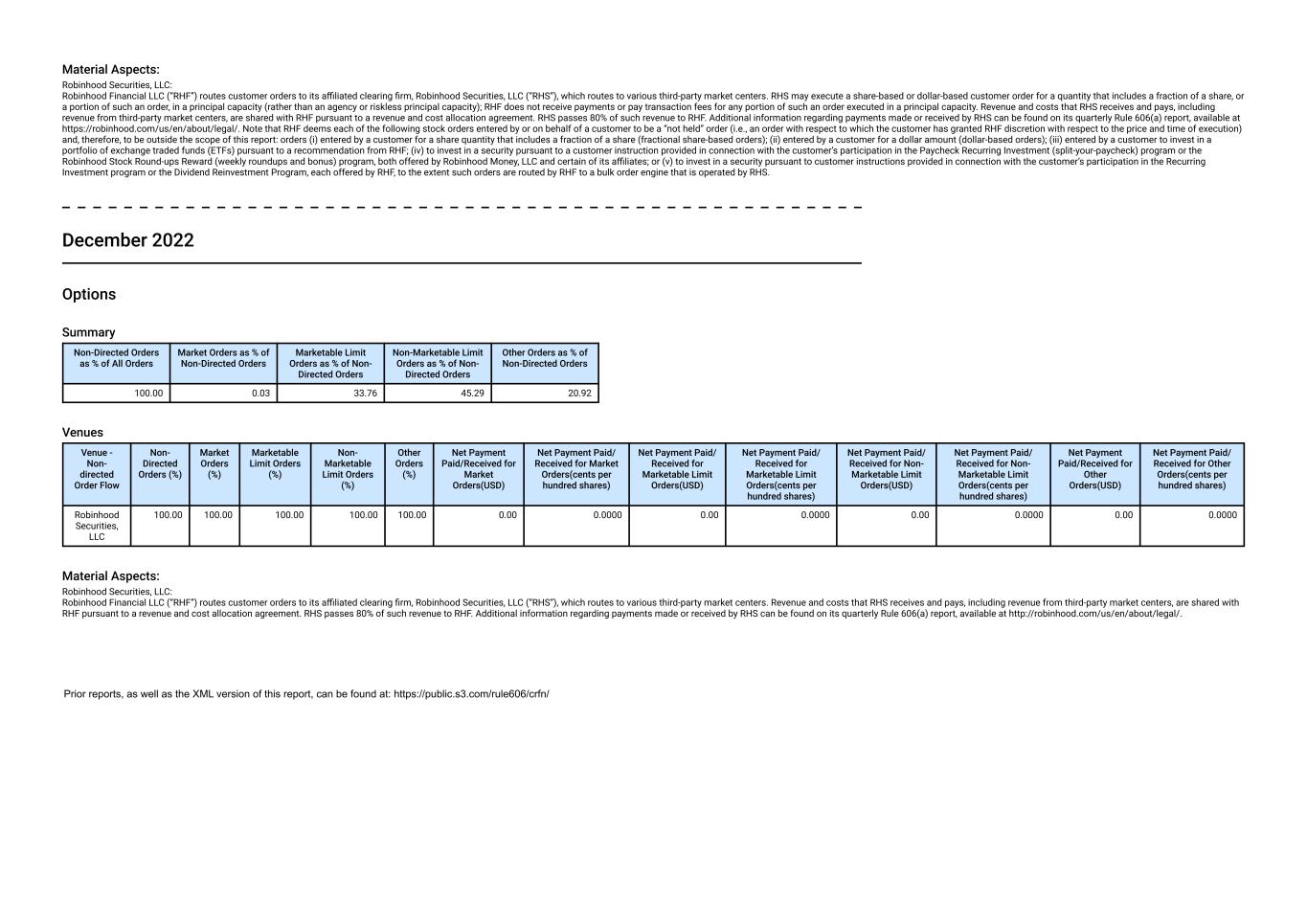 Material Aspects: Robinhood Securities, LLC: Robinhood Financial LLC (“RHF”) routes customer orders to its affiliated clearing firm, Robinhood Securities, LLC (“RHS”), which routes to various third-party market centers. RHS may execute a share-based or dollar-based customer order for a quantity that includes a fraction of a share, or a portion of such an order, in a principal capacity (rather than an agency or riskless principal capacity); RHF does not receive payments or pay transaction fees for any portion of such an order executed in a principal capacity. Revenue and costs that RHS receives and pays, including revenue from third-party market centers, are shared with RHF pursuant to a revenue and cost allocation agreement. RHS passes 80% of such revenue to RHF. Additional information regarding payments made or received by RHS can be found on its quarterly Rule 606(a) report, available at https://robinhood.com/us/en/about/legal/. Note that RHF deems each of the following stock orders entered by or on behalf of a customer to be a “not held” order (i.e., an order with respect to which the customer has granted RHF discretion with respect to the price and time of execution) and, therefore, to be outside the scope of this report: orders (i) entered by a customer for a share quantity that includes a fraction of a share (fractional share-based orders); (ii) entered by a customer for a dollar amount (dollar-based orders); (iii) entered by a customer to invest in a portfolio of exchange traded funds (ETFs) pursuant to a recommendation from RHF; (iv) to invest in a security pursuant to a customer instruction provided in connection with the customer’s participation in the Paycheck Recurring Investment (split-your-paycheck) program or the Robinhood Stock Round-ups Reward (weekly roundups and bonus) program, both offered by Robinhood Money, LLC and certain of its affiliates; or (v) to invest in a security pursuant to customer instructions provided in connection with the customer’s participation in the Recurring Investment program or the Dividend Reinvestment Program, each offered by RHF, to the extent such orders are routed by RHF to a bulk order engine that is operated by RHS. December 2022 Options Summary Non-Directed Orders as % of All Orders Market Orders as % of Non-Directed Orders Marketable Limit Orders as % of Non- Directed Orders Non-Marketable Limit Orders as % of Non- Directed Orders Other Orders as % of Non-Directed Orders 100.00 0.03 33.76 45.29 20.92 Venues Venue - Non- directed Order Flow Non- Directed Orders (%) Market Orders (%) Marketable Limit Orders (%) Non- Marketable Limit Orders (%) Other Orders (%) Net Payment Paid/Received for Market Orders(USD) Net Payment Paid/ Received for Market Orders(cents per hundred shares) Net Payment Paid/ Received for Marketable Limit Orders(USD) Net Payment Paid/ Received for Marketable Limit Orders(cents per hundred shares) Net Payment Paid/ Received for Non- Marketable Limit Orders(USD) Net Payment Paid/ Received for Non- Marketable Limit Orders(cents per hundred shares) Net Payment Paid/Received for Other Orders(USD) Net Payment Paid/ Received for Other Orders(cents per hundred shares) Robinhood Securities, LLC 100.00 100.00 100.00 100.00 100.00 0.00 0.0000 0.00 0.0000 0.00 0.0000 0.00 0.0000 Material Aspects: Robinhood Securities, LLC: Robinhood Financial LLC (“RHF”) routes customer orders to its affiliated clearing firm, Robinhood Securities, LLC (“RHS”), which routes to various third-party market centers. Revenue and costs that RHS receives and pays, including revenue from third-party market centers, are shared with RHF pursuant to a revenue and cost allocation agreement. RHS passes 80% of such revenue to RHF. Additional information regarding payments made or received by RHS can be found on its quarterly Rule 606(a) report, available at http://robinhood.com/us/en/about/legal/.