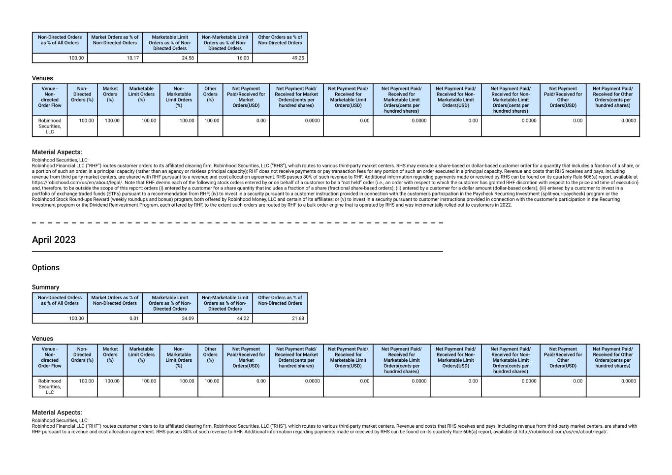 Non-Directed Orders as % of All Orders Market Orders as % of Non-Directed Orders Marketable Limit Orders as % of Non- Directed Orders Non-Marketable Limit Orders as % of Non- Directed Orders Other Orders as % of Non-Directed Orders 100.00 10.17 24.58 16.00 49.25 Venues Venue - Non- directed Order Flow Non- Directed Orders (%) Market Orders (%) Marketable Limit Orders (%) Non- Marketable Limit Orders (%) Other Orders (%) Net Payment Paid/Received for Market Orders(USD) Net Payment Paid/ Received for Market Orders(cents per hundred shares) Net Payment Paid/ Received for Marketable Limit Orders(USD) Net Payment Paid/ Received for Marketable Limit Orders(cents per hundred shares) Net Payment Paid/ Received for Non- Marketable Limit Orders(USD) Net Payment Paid/ Received for Non- Marketable Limit Orders(cents per hundred shares) Net Payment Paid/Received for Other Orders(USD) Net Payment Paid/ Received for Other Orders(cents per hundred shares) Robinhood Securities, LLC 100.00 100.00 100.00 100.00 100.00 0.00 0.0000 0.00 0.0000 0.00 0.0000 0.00 0.0000 Material Aspects: Robinhood Securities, LLC: Robinhood Financial LLC (“RHF”) routes customer orders to its affiliated clearing firm, Robinhood Securities, LLC (“RHS”), which routes to various third-party market centers. RHS may execute a share-based or dollar-based customer order for a quantity that includes a fraction of a share, or a portion of such an order, in a principal capacity (rather than an agency or riskless principal capacity); RHF does not receive payments or pay transaction fees for any portion of such an order executed in a principal capacity. Revenue and costs that RHS receives and pays, including revenue from third-party market centers, are shared with RHF pursuant to a revenue and cost allocation agreement. RHS passes 80% of such revenue to RHF. Additional information regarding payments made or received by RHS can be found on its quarterly Rule 606(a) report, available at https://robinhood.com/us/en/about/legal/. Note that RHF deems each of the following stock orders entered by or on behalf of a customer to be a “not held” order (i.e., an order with respect to which the customer has granted RHF discretion with respect to the price and time of execution) and, therefore, to be outside the scope of this report: orders (i) entered by a customer for a share quantity that includes a fraction of a share (fractional share-based orders); (ii) entered by a customer for a dollar amount (dollar-based orders); (iii) entered by a customer to invest in a portfolio of exchange traded funds (ETFs) pursuant to a recommendation from RHF; (iv) to invest in a security pursuant to a customer instruction provided in connection with the customer’s participation in the Paycheck Recurring Investment (split-your-paycheck) program or the Robinhood Stock Round-ups Reward (weekly roundups and bonus) program, both offered by Robinhood Money, LLC and certain of its affiliates; or (v) to invest in a security pursuant to customer instructions provided in connection with the customer’s participation in the Recurring Investment program or the Dividend Reinvestment Program, each offered by RHF, to the extent such orders are routed by RHF to a bulk order engine that is operated by RHS and was incrementally rolled out to customers in 2022. April 2023 Options Summary Non-Directed Orders as % of All Orders Market Orders as % of Non-Directed Orders Marketable Limit Orders as % of Non- Directed Orders Non-Marketable Limit Orders as % of Non- Directed Orders Other Orders as % of Non-Directed Orders 100.00 0.01 34.09 44.22 21.68 Venues Venue - Non- directed Order Flow Non- Directed Orders (%) Market Orders (%) Marketable Limit Orders (%) Non- Marketable Limit Orders (%) Other Orders (%) Net Payment Paid/Received for Market Orders(USD) Net Payment Paid/ Received for Market Orders(cents per hundred shares) Net Payment Paid/ Received for Marketable Limit Orders(USD) Net Payment Paid/ Received for Marketable Limit Orders(cents per hundred shares) Net Payment Paid/ Received for Non- Marketable Limit Orders(USD) Net Payment Paid/ Received for Non- Marketable Limit Orders(cents per hundred shares) Net Payment Paid/Received for Other Orders(USD) Net Payment Paid/ Received for Other Orders(cents per hundred shares) Robinhood Securities, LLC 100.00 100.00 100.00 100.00 100.00 0.00 0.0000 0.00 0.0000 0.00 0.0000 0.00 0.0000 Material Aspects: Robinhood Securities, LLC: Robinhood Financial LLC (“RHF”) routes customer orders to its affiliated clearing firm, Robinhood Securities, LLC (“RHS”), which routes to various third-party market centers. Revenue and costs that RHS receives and pays, including revenue from third-party market centers, are shared with RHF pursuant to a revenue and cost allocation agreement. RHS passes 80% of such revenue to RHF. Additional information regarding payments made or received by RHS can be found on its quarterly Rule 606(a) report, available at http://robinhood.com/us/en/about/legal/.