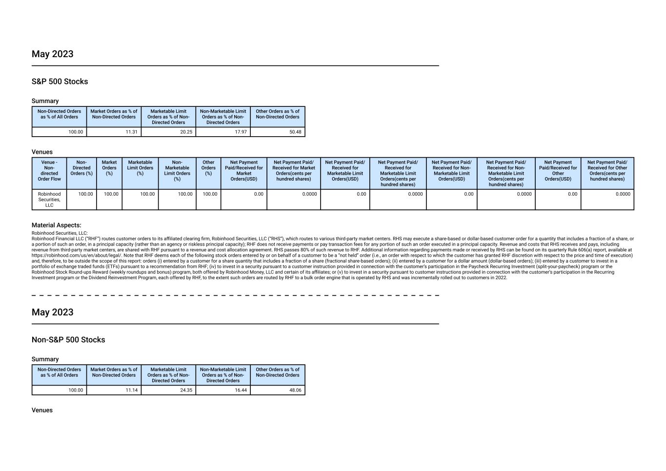 May 2023 S&P 500 Stocks Summary Non-Directed Orders as % of All Orders Market Orders as % of Non-Directed Orders Marketable Limit Orders as % of Non- Directed Orders Non-Marketable Limit Orders as % of Non- Directed Orders Other Orders as % of Non-Directed Orders 100.00 11.31 20.25 17.97 50.48 Venues Venue - Non- directed Order Flow Non- Directed Orders (%) Market Orders (%) Marketable Limit Orders (%) Non- Marketable Limit Orders (%) Other Orders (%) Net Payment Paid/Received for Market Orders(USD) Net Payment Paid/ Received for Market Orders(cents per hundred shares) Net Payment Paid/ Received for Marketable Limit Orders(USD) Net Payment Paid/ Received for Marketable Limit Orders(cents per hundred shares) Net Payment Paid/ Received for Non- Marketable Limit Orders(USD) Net Payment Paid/ Received for Non- Marketable Limit Orders(cents per hundred shares) Net Payment Paid/Received for Other Orders(USD) Net Payment Paid/ Received for Other Orders(cents per hundred shares) Robinhood Securities, LLC 100.00 100.00 100.00 100.00 100.00 0.00 0.0000 0.00 0.0000 0.00 0.0000 0.00 0.0000 Material Aspects: Robinhood Securities, LLC: Robinhood Financial LLC (“RHF”) routes customer orders to its affiliated clearing firm, Robinhood Securities, LLC (“RHS”), which routes to various third-party market centers. RHS may execute a share-based or dollar-based customer order for a quantity that includes a fraction of a share, or a portion of such an order, in a principal capacity (rather than an agency or riskless principal capacity); RHF does not receive payments or pay transaction fees for any portion of such an order executed in a principal capacity. Revenue and costs that RHS receives and pays, including revenue from third-party market centers, are shared with RHF pursuant to a revenue and cost allocation agreement. RHS passes 80% of such revenue to RHF. Additional information regarding payments made or received by RHS can be found on its quarterly Rule 606(a) report, available at https://robinhood.com/us/en/about/legal/. Note that RHF deems each of the following stock orders entered by or on behalf of a customer to be a “not held” order (i.e., an order with respect to which the customer has granted RHF discretion with respect to the price and time of execution) and, therefore, to be outside the scope of this report: orders (i) entered by a customer for a share quantity that includes a fraction of a share (fractional share-based orders); (ii) entered by a customer for a dollar amount (dollar-based orders); (iii) entered by a customer to invest in a portfolio of exchange traded funds (ETFs) pursuant to a recommendation from RHF; (iv) to invest in a security pursuant to a customer instruction provided in connection with the customer’s participation in the Paycheck Recurring Investment (split-your-paycheck) program or the Robinhood Stock Round-ups Reward (weekly roundups and bonus) program, both offered by Robinhood Money, LLC and certain of its affiliates; or (v) to invest in a security pursuant to customer instructions provided in connection with the customer’s participation in the Recurring Investment program or the Dividend Reinvestment Program, each offered by RHF, to the extent such orders are routed by RHF to a bulk order engine that is operated by RHS and was incrementally rolled out to customers in 2022. May 2023 Non-S&P 500 Stocks Summary Non-Directed Orders as % of All Orders Market Orders as % of Non-Directed Orders Marketable Limit Orders as % of Non- Directed Orders Non-Marketable Limit Orders as % of Non- Directed Orders Other Orders as % of Non-Directed Orders 100.00 11.14 24.35 16.44 48.06 Venues