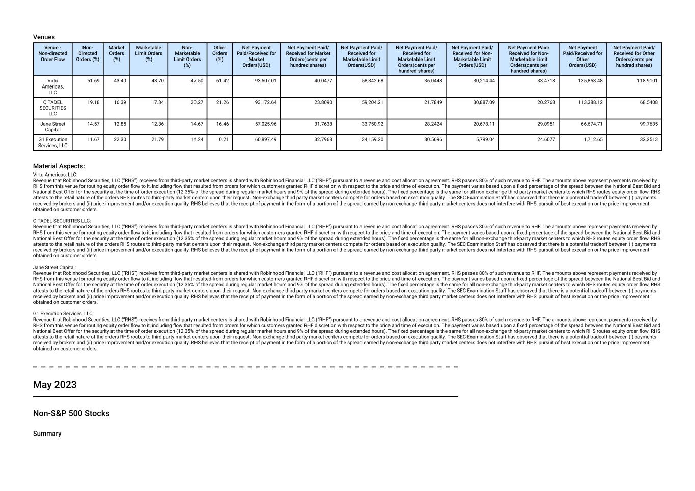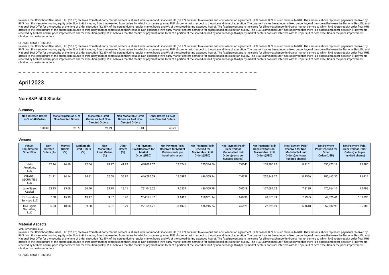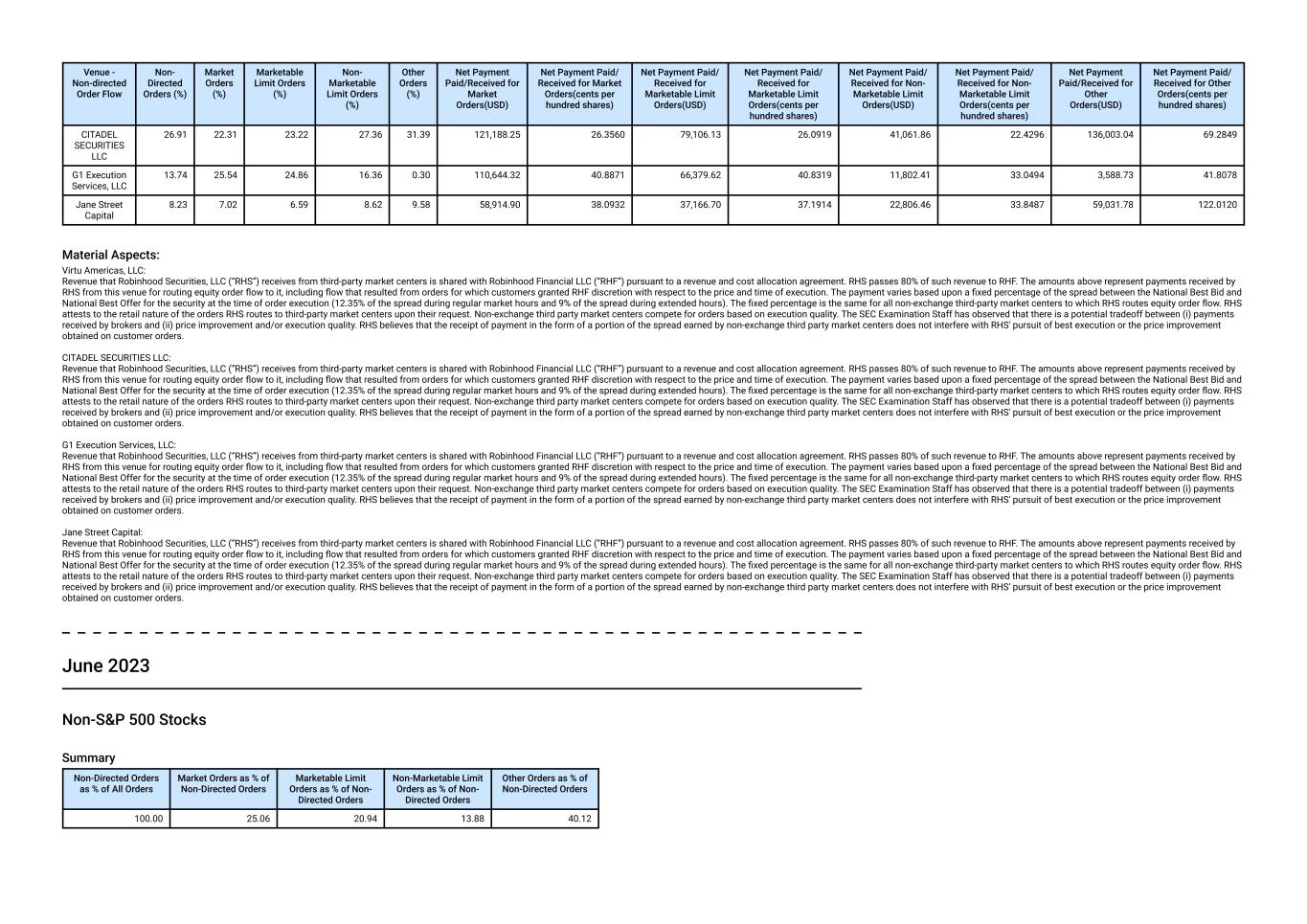 Revenue that Robinhood Securities, LLC (“RHS”) receives from third-party market centers is shared with Robinhood Financial LLC (“RHF”) pursuant to a revenue and cost allocation agreement. RHS passes 80% of such revenue to RHF. The amounts above represent payments received by RHS from this venue for routing equity order flow to it, including flow that resulted from orders for which customers granted RHF discretion with respect to the price and time of execution. The payment varies based upon a fixed percentage of the spread between the National Best Bid and National Best Offer for the security at the time of order execution (12.35% of the spread during regular market hours and 9% of the spread during extended hours). The fixed percentage is the same for all non-exchange third-party market centers to which RHS routes equity order flow. RHS attests to the retail nature of the orders RHS routes to third-party market centers upon their request. Non-exchange third party market centers compete for orders based on execution quality. The SEC Examination Staff has observed that there is a potential tradeoff between (i) payments received by brokers and (ii) price improvement and/or execution quality. RHS believes that the receipt of payment in the form of a portion of the spread earned by non-exchange third party market centers does not interfere with RHS' pursuit of best execution or the price improvement obtained on customer orders. CITADEL SECURITIES LLC: Revenue that Robinhood Securities, LLC (“RHS”) receives from third-party market centers is shared with Robinhood Financial LLC (“RHF”) pursuant to a revenue and cost allocation agreement. RHS passes 80% of such revenue to RHF. The amounts above represent payments received by RHS from this venue for routing equity order flow to it, including flow that resulted from orders for which customers granted RHF discretion with respect to the price and time of execution. The payment varies based upon a fixed percentage of the spread between the National Best Bid and National Best Offer for the security at the time of order execution (12.35% of the spread during regular market hours and 9% of the spread during extended hours). The fixed percentage is the same for all non-exchange third-party market centers to which RHS routes equity order flow. RHS attests to the retail nature of the orders RHS routes to third-party market centers upon their request. Non-exchange third party market centers compete for orders based on execution quality. The SEC Examination Staff has observed that there is a potential tradeoff between (i) payments received by brokers and (ii) price improvement and/or execution quality. RHS believes that the receipt of payment in the form of a portion of the spread earned by non-exchange third party market centers does not interfere with RHS' pursuit of best execution or the price improvement obtained on customer orders. April 2023 Non-S&P 500 Stocks Summary Non-Directed Orders as % of All Orders Market Orders as % of Non-Directed Orders Marketable Limit Orders as % of Non- Directed Orders Non-Marketable Limit Orders as % of Non- Directed Orders Other Orders as % of Non-Directed Orders 100.00 21.79 21.21 13.81 43.20 Venues Venue - Non-directed Order Flow Non- Directed Orders (%) Market Orders (%) Marketable Limit Orders (%) Non- Marketable Limit Orders (%) Other Orders (%) Net Payment Paid/Received for Market Orders(USD) Net Payment Paid/ Received for Market Orders(cents per hundred shares) Net Payment Paid/ Received for Marketable Limit Orders(USD) Net Payment Paid/ Received for Marketable Limit Orders(cents per hundred shares) Net Payment Paid/ Received for Non- Marketable Limit Orders(USD) Net Payment Paid/ Received for Non- Marketable Limit Orders(cents per hundred shares) Net Payment Paid/Received for Other Orders(USD) Net Payment Paid/ Received for Other Orders(cents per hundred shares) Virtu Americas, LLC 32.14 24.10 22.64 28.77 41.93 430,083.57 12.6246 325,334.56 7.0641 169,280.22 8.9151 535,473.19 9.9785 CITADEL SECURITIES LLC 31.71 24.14 24.11 32.58 38.97 646,290.59 12.3997 496,559.24 7.4239 252,242.17 8.9536 785,462.35 9.6914 Jane Street Capital 23.15 25.68 30.40 23.78 18.11 731,045.02 9.6504 486,509.78 5.0519 177,084.72 7.3120 470,764.17 7.0793 G1 Execution Services, LLC 7.68 15.99 13.47 9.07 0.20 254,186.37 9.1412 158,961.14 6.0939 28,676.39 7.9335 49,025.41 10.0836 Two Sigma Securities, LLC 5.33 10.08 9.38 5.81 0.79 221,518.71 8.1075 136,245.74 4.6121 22,696.09 6.1648 57,002.90 8.7383 Material Aspects: Virtu Americas, LLC: Revenue that Robinhood Securities, LLC (“RHS”) receives from third-party market centers is shared with Robinhood Financial LLC (“RHF”) pursuant to a revenue and cost allocation agreement. RHS passes 80% of such revenue to RHF. The amounts above represent payments received by RHS from this venue for routing equity order flow to it, including flow that resulted from orders for which customers granted RHF discretion with respect to the price and time of execution. The payment varies based upon a fixed percentage of the spread between the National Best Bid and National Best Offer for the security at the time of order execution (12.35% of the spread during regular market hours and 9% of the spread during extended hours). The fixed percentage is the same for all non-exchange third-party market centers to which RHS routes equity order flow. RHS attests to the retail nature of the orders RHS routes to third-party market centers upon their request. Non-exchange third party market centers compete for orders based on execution quality. The SEC Examination Staff has observed that there is a potential tradeoff between (i) payments received by brokers and (ii) price improvement and/or execution quality. RHS believes that the receipt of payment in the form of a portion of the spread earned by non-exchange third party market centers does not interfere with RHS' pursuit of best execution or the price i