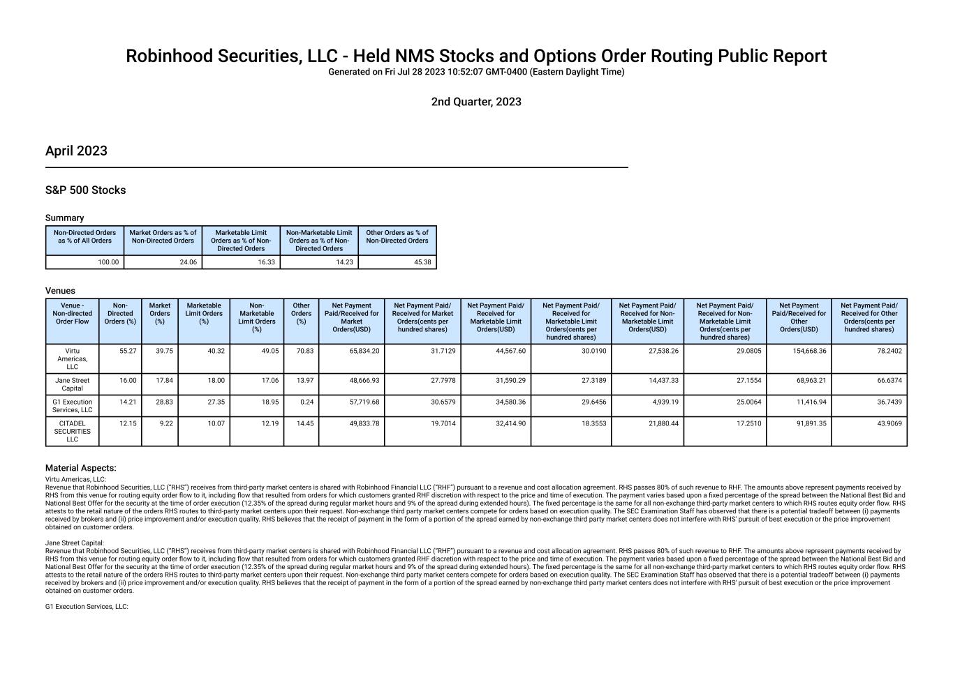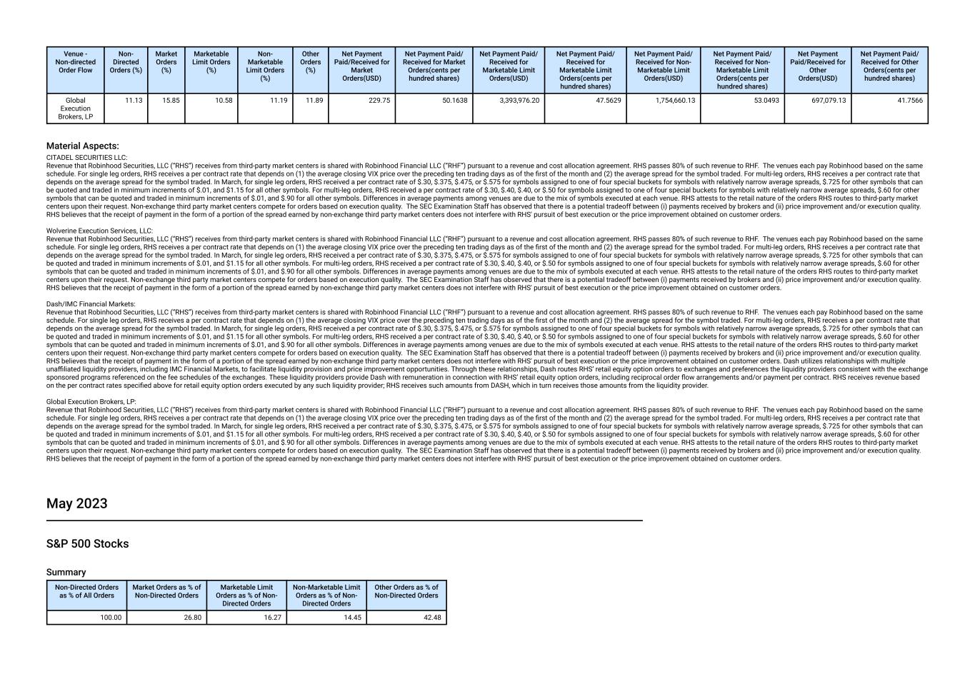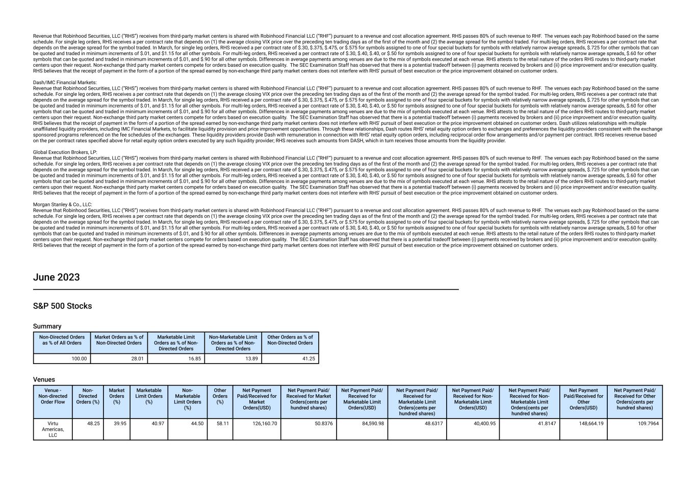 Revenue that Robinhood Securities, LLC (“RHS”) receives from third-party market centers is shared with Robinhood Financial LLC (“RHF”) pursuant to a revenue and cost allocation agreement. RHS passes 80% of such revenue to RHF. The amounts above represent payments received by RHS from this venue for routing equity order flow to it, including flow that resulted from orders for which customers granted RHF discretion with respect to the price and time of execution. The payment varies based upon a fixed percentage of the spread between the National Best Bid and National Best Offer for the security at the time of order execution (12.35% of the spread during regular market hours and 9% of the spread during extended hours). The fixed percentage is the same for all non-exchange third-party market centers to which RHS routes equity order flow. RHS attests to the retail nature of the orders RHS routes to third-party market centers upon their request. Non-exchange third party market centers compete for orders based on execution quality. The SEC Examination Staff has observed that there is a potential tradeoff between (i) payments received by brokers and (ii) price improvement and/or execution quality. RHS believes that the receipt of payment in the form of a portion of the spread earned by non-exchange third party market centers does not interfere with RHS' pursuit of best execution or the price improvement obtained on customer orders. CITADEL SECURITIES LLC: Revenue that Robinhood Securities, LLC (“RHS”) receives from third-party market centers is shared with Robinhood Financial LLC (“RHF”) pursuant to a revenue and cost allocation agreement. RHS passes 80% of such revenue to RHF. The amounts above represent payments received by RHS from this venue for routing equity order flow to it, including flow that resulted from orders for which customers granted RHF discretion with respect to the price and time of execution. The payment varies based upon a fixed percentage of the spread between the National Best Bid and National Best Offer for the security at the time of order execution (12.35% of the spread during regular market hours and 9% of the spread during extended hours). The fixed percentage is the same for all non-exchange third-party market centers to which RHS routes equity order flow. RHS attests to the retail nature of the orders RHS routes to third-party market centers upon their request. Non-exchange third party market centers compete for orders based on execution quality. The SEC Examination Staff has observed that there is a potential tradeoff between (i) payments received by brokers and (ii) price improvement and/or execution quality. RHS believes that the receipt of payment in the form of a portion of the spread earned by non-exchange third party market centers does not interfere with RHS' pursuit of best execution or the price improvement obtained on customer orders. April 2023 Non-S&P 500 Stocks Summary Non-Directed Orders as % of All Orders Market Orders as % of Non-Directed Orders Marketable Limit Orders as % of Non- Directed Orders Non-Marketable Limit Orders as % of Non- Directed Orders Other Orders as % of Non-Directed Orders 100.00 21.79 21.21 13.81 43.20 Venues Venue - Non-directed Order Flow Non- Directed Orders (%) Market Orders (%) Marketable Limit Orders (%) Non- Marketable Limit Orders (%) Other Orders (%) Net Payment Paid/Received for Market Orders(USD) Net Payment Paid/ Received for Market Orders(cents per hundred shares) Net Payment Paid/ Received for Marketable Limit Orders(USD) Net Payment Paid/ Received for Marketable Limit Orders(cents per hundred shares) Net Payment Paid/ Received for Non- Marketable Limit Orders(USD) Net Payment Paid/ Received for Non- Marketable Limit Orders(cents per hundred shares) Net Payment Paid/Received for Other Orders(USD) Net Payment Paid/ Received for Other Orders(cents per hundred shares) Virtu Americas, LLC 32.14 24.10 22.64 28.77 41.93 430,083.57 12.6246 325,334.56 7.0641 169,280.22 8.9151 535,473.19 9.9785 CITADEL SECURITIES LLC 31.71 24.14 24.11 32.58 38.97 646,290.59 12.3997 496,559.24 7.4239 252,242.17 8.9536 785,462.35 9.6914 Jane Street Capital 23.15 25.68 30.40 23.78 18.11 731,045.02 9.6504 486,509.78 5.0519 177,084.72 7.3120 470,764.17 7.0793 G1 Execution Services, LLC 7.68 15.99 13.47 9.07 0.20 254,186.37 9.1412 158,961.14 6.0939 28,676.39 7.9335 49,025.41 10.0836 Two Sigma Securities, LLC 5.33 10.08 9.38 5.81 0.79 221,518.71 8.1075 136,245.74 4.6121 22,696.09 6.1648 57,002.90 8.7383 Material Aspects: Virtu Americas, LLC: Revenue that Robinhood Securities, LLC (“RHS”) receives from third-party market centers is shared with Robinhood Financial LLC (“RHF”) pursuant to a revenue and cost allocation agreement. RHS passes 80% of such revenue to RHF. The amounts above represent payments received by RHS from this venue for routing equity order flow to it, including flow that resulted from orders for which customers granted RHF discretion with respect to the price and time of execution. The payment varies based upon a fixed percentage of the spread between the National Best Bid and National Best Offer for the security at the time of order execution (12.35% of the spread during regular market hours and 9% of the spread during extended hours). The fixed percentage is the same for all non-exchange third-party market centers to which RHS routes equity order flow. RHS attests to the retail nature of the orders RHS routes to third-party market centers upon their request. Non-exchange third party market centers compete for orders based on execution quality. The SEC Examination Staff has observed that there is a potential tradeoff between (i) payments received by brokers and (ii) price improvement and/or execution quality. RHS believes that the receipt of payment in the form of a portion of the spread earned by non-exchange third party market centers does not interfere with RHS' pursuit of best execution or the price i