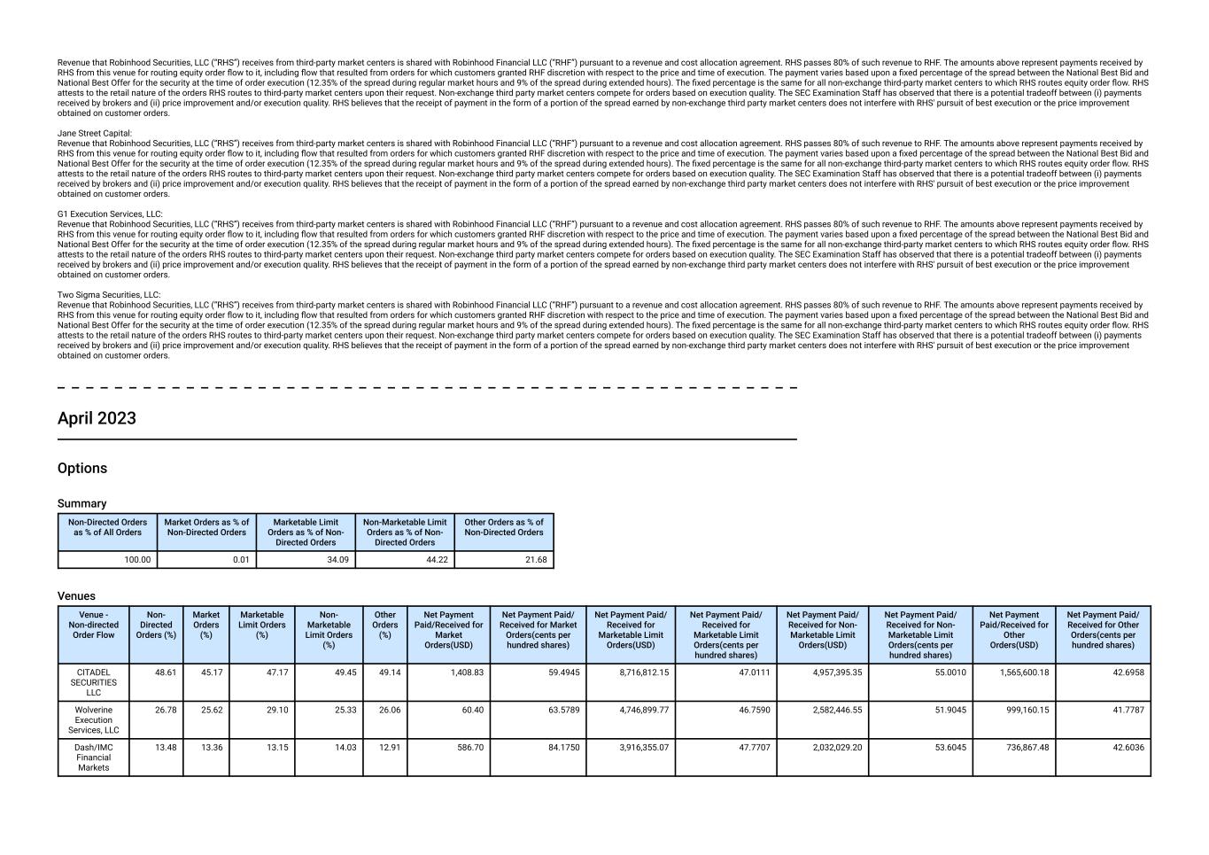 Revenue that Robinhood Securities, LLC (“RHS”) receives from third-party market centers is shared with Robinhood Financial LLC (“RHF”) pursuant to a revenue and cost allocation agreement. RHS passes 80% of such revenue to RHF. The amounts above represent payments received by RHS from this venue for routing equity order flow to it, including flow that resulted from orders for which customers granted RHF discretion with respect to the price and time of execution. The payment varies based upon a fixed percentage of the spread between the National Best Bid and National Best Offer for the security at the time of order execution (12.35% of the spread during regular market hours and 9% of the spread during extended hours). The fixed percentage is the same for all non-exchange third-party market centers to which RHS routes equity order flow. RHS attests to the retail nature of the orders RHS routes to third-party market centers upon their request. Non-exchange third party market centers compete for orders based on execution quality. The SEC Examination Staff has observed that there is a potential tradeoff between (i) payments received by brokers and (ii) price improvement and/or execution quality. RHS believes that the receipt of payment in the form of a portion of the spread earned by non-exchange third party market centers does not interfere with RHS' pursuit of best execution or the price improvement obtained on customer orders. Jane Street Capital: Revenue that Robinhood Securities, LLC (“RHS”) receives from third-party market centers is shared with Robinhood Financial LLC (“RHF”) pursuant to a revenue and cost allocation agreement. RHS passes 80% of such revenue to RHF. The amounts above represent payments received by RHS from this venue for routing equity order flow to it, including flow that resulted from orders for which customers granted RHF discretion with respect to the price and time of execution. The payment varies based upon a fixed percentage of the spread between the National Best Bid and National Best Offer for the security at the time of order execution (12.35% of the spread during regular market hours and 9% of the spread during extended hours). The fixed percentage is the same for all non-exchange third-party market centers to which RHS routes equity order flow. RHS attests to the retail nature of the orders RHS routes to third-party market centers upon their request. Non-exchange third party market centers compete for orders based on execution quality. The SEC Examination Staff has observed that there is a potential tradeoff between (i) payments received by brokers and (ii) price improvement and/or execution quality. RHS believes that the receipt of payment in the form of a portion of the spread earned by non-exchange third party market centers does not interfere with RHS' pursuit of best execution or the price improvement obtained on customer orders. G1 Execution Services, LLC: Revenue that Robinhood Securities, LLC (“RHS”) receives from third-party market centers is shared with Robinhood Financial LLC (“RHF”) pursuant to a revenue and cost allocation agreement. RHS passes 80% of such revenue to RHF. The amounts above represent payments received by RHS from this venue for routing equity order flow to it, including flow that resulted from orders for which customers granted RHF discretion with respect to the price and time of execution. The payment varies based upon a fixed percentage of the spread between the National Best Bid and National Best Offer for the security at the time of order execution (12.35% of the spread during regular market hours and 9% of the spread during extended hours). The fixed percentage is the same for all non-exchange third-party market centers to which RHS routes equity order flow. RHS attests to the retail nature of the orders RHS routes to third-party market centers upon their request. Non-exchange third party market centers compete for orders based on execution quality. The SEC Examination Staff has observed that there is a potential tradeoff between (i) payments received by brokers and (ii) price improvement and/or execution quality. RHS believes that the receipt of payment in the form of a portion of the spread earned by non-exchange third party market centers does not interfere with RHS' pursuit of best execution or the price improvement obtained on customer orders. Two Sigma Securities, LLC: Revenue that Robinhood Securities, LLC (“RHS”) receives from third-party market centers is shared with Robinhood Financial LLC (“RHF”) pursuant to a revenue and cost allocation agreement. RHS passes 80% of such revenue to RHF. The amounts above represent payments received by RHS from this venue for routing equity order flow to it, including flow that resulted from orders for which customers granted RHF discretion with respect to the price and time of execution. The payment varies based upon a fixed percentage of the spread between the National Best Bid and National Best Offer for the security at the time of order execution (12.35% of the spread during regular market hours and 9% of the spread during extended hours). The fixed percentage is the same for all non-exchange third-party market centers to which RHS routes equity order flow. RHS attests to the retail nature of the orders RHS routes to third-party market centers upon their request. Non-exchange third party market centers compete for orders based on execution quality. The SEC Examination Staff has observed that there is a potential tradeoff between (i) payments received by brokers and (ii) price improvement and/or execution quality. RHS believes that the receipt of payment in the form of a portion of the spread earned by non-exchange third party market centers does not interfere with RHS' pursuit of best execution or the price improvement obtained on customer orders. April 2023 Options Summary Non-Directed Orders as % of All Orders Market Orders as % of Non-Directed