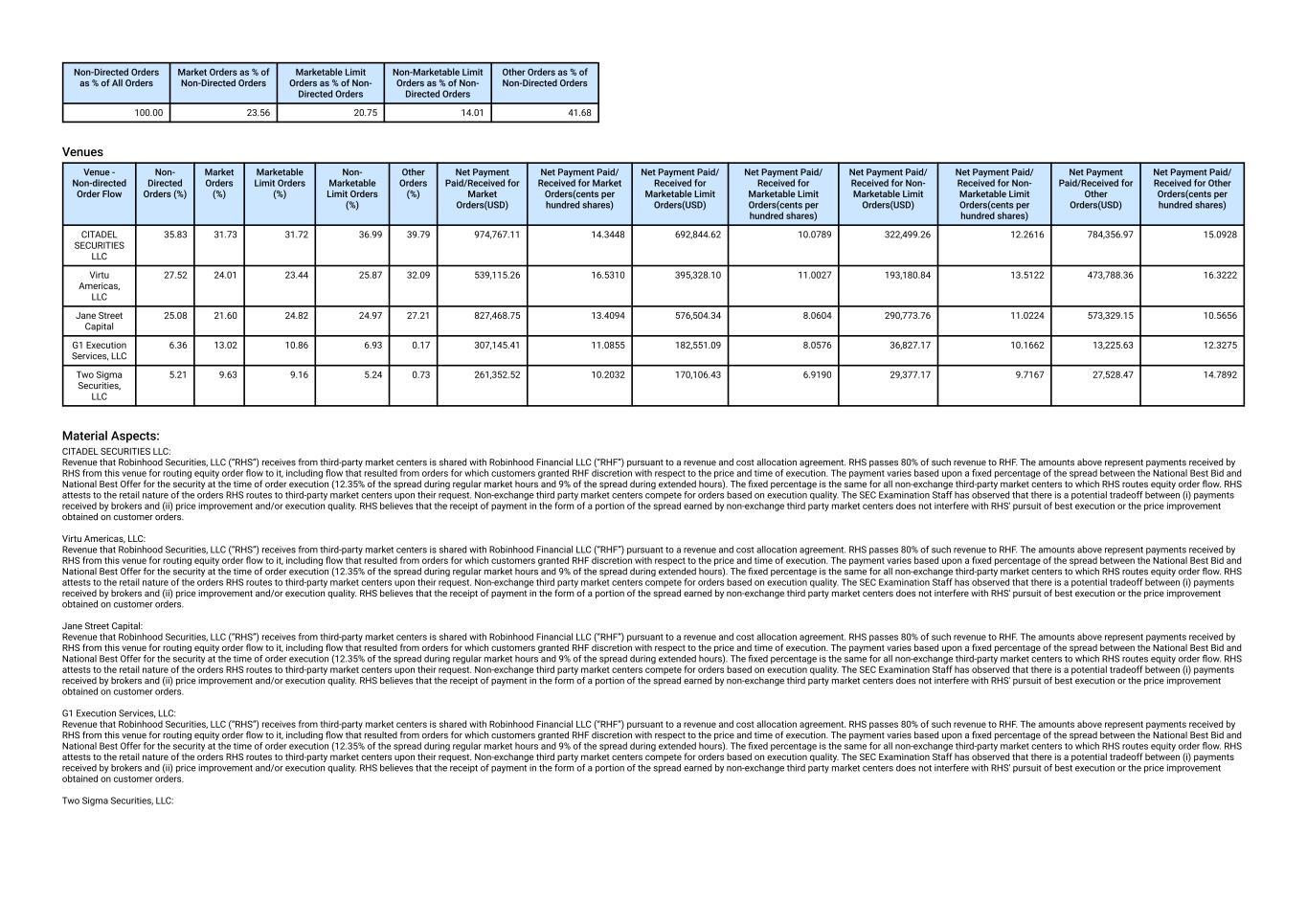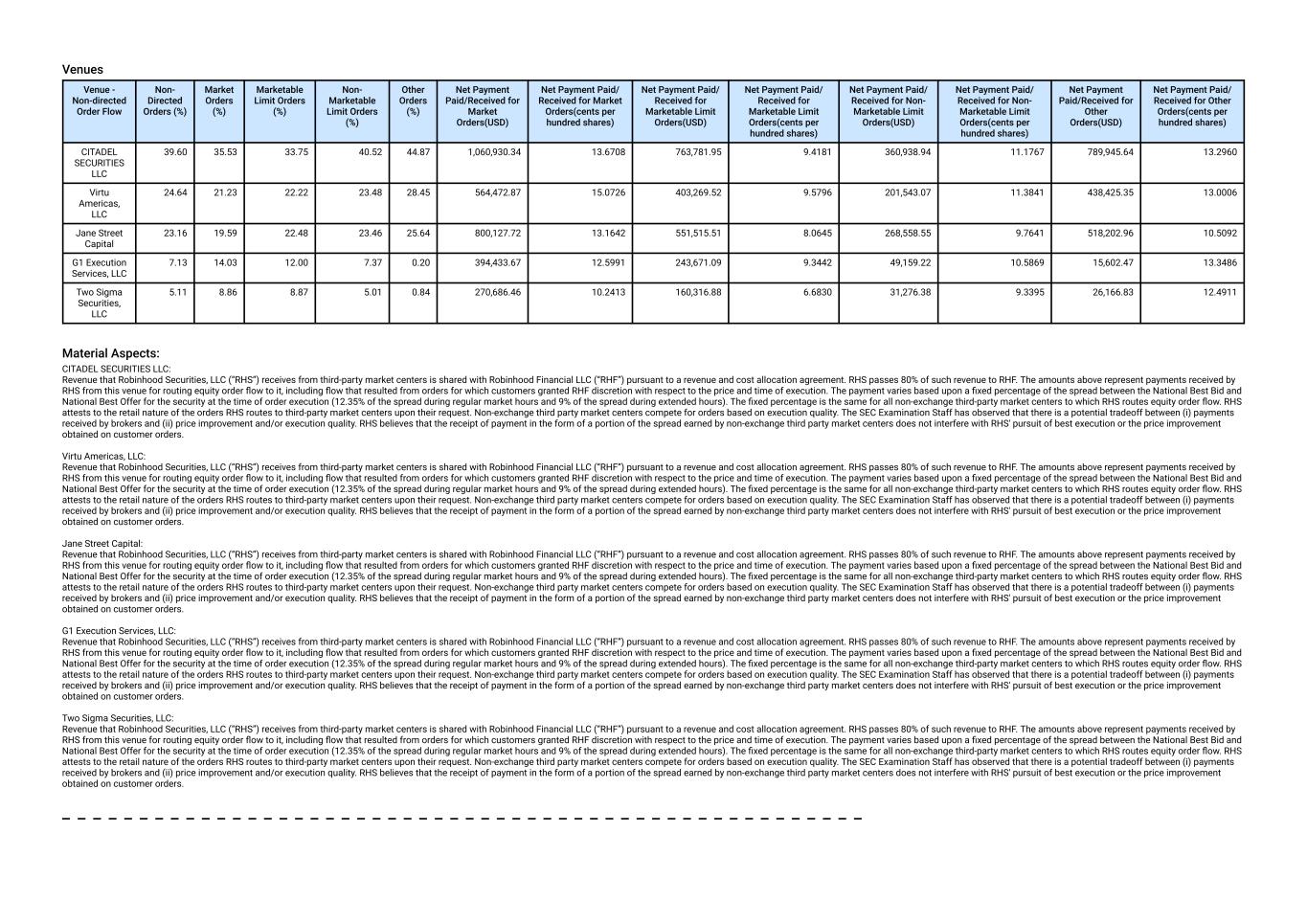 Venues Venue - Non-directed Order Flow Non- Directed Orders (%) Market Orders (%) Marketable Limit Orders (%) Non- Marketable Limit Orders (%) Other Orders (%) Net Payment Paid/Received for Market Orders(USD) Net Payment Paid/ Received for Market Orders(cents per hundred shares) Net Payment Paid/ Received for Marketable Limit Orders(USD) Net Payment Paid/ Received for Marketable Limit Orders(cents per hundred shares) Net Payment Paid/ Received for Non- Marketable Limit Orders(USD) Net Payment Paid/ Received for Non- Marketable Limit Orders(cents per hundred shares) Net Payment Paid/Received for Other Orders(USD) Net Payment Paid/ Received for Other Orders(cents per hundred shares) CITADEL SECURITIES LLC 39.60 35.53 33.75 40.52 44.87 1,060,930.34 13.6708 763,781.95 9.4181 360,938.94 11.1767 789,945.64 13.2960 Virtu Americas, LLC 24.64 21.23 22.22 23.48 28.45 564,472.87 15.0726 403,269.52 9.5796 201,543.07 11.3841 438,425.35 13.0006 Jane Street Capital 23.16 19.59 22.48 23.46 25.64 800,127.72 13.1642 551,515.51 8.0645 268,558.55 9.7641 518,202.96 10.5092 G1 Execution Services, LLC 7.13 14.03 12.00 7.37 0.20 394,433.67 12.5991 243,671.09 9.3442 49,159.22 10.5869 15,602.47 13.3486 Two Sigma Securities, LLC 5.11 8.86 8.87 5.01 0.84 270,686.46 10.2413 160,316.88 6.6830 31,276.38 9.3395 26,166.83 12.4911 Material Aspects: CITADEL SECURITIES LLC: Revenue that Robinhood Securities, LLC (“RHS”) receives from third-party market centers is shared with Robinhood Financial LLC (“RHF”) pursuant to a revenue and cost allocation agreement. RHS passes 80% of such revenue to RHF. The amounts above represent payments received by RHS from this venue for routing equity order flow to it, including flow that resulted from orders for which customers granted RHF discretion with respect to the price and time of execution. The payment varies based upon a fixed percentage of the spread between the National Best Bid and National Best Offer for the security at the time of order execution (12.35% of the spread during regular market hours and 9% of the spread during extended hours). The fixed percentage is the same for all non-exchange third-party market centers to which RHS routes equity order flow. RHS attests to the retail nature of the orders RHS routes to third-party market centers upon their request. Non-exchange third party market centers compete for orders based on execution quality. The SEC Examination Staff has observed that there is a potential tradeoff between (i) payments received by brokers and (ii) price improvement and/or execution quality. RHS believes that the receipt of payment in the form of a portion of the spread earned by non-exchange third party market centers does not interfere with RHS' pursuit of best execution or the price improvement obtained on customer orders. Virtu Americas, LLC: Revenue that Robinhood Securities, LLC (“RHS”) receives from third-party market centers is shared with Robinhood Financial LLC (“RHF”) pursuant to a revenue and cost allocation agreement. RHS passes 80% of such revenue to RHF. The amounts above represent payments received by RHS from this venue for routing equity order flow to it, including flow that resulted from orders for which customers granted RHF discretion with respect to the price and time of execution. The payment varies based upon a fixed percentage of the spread between the National Best Bid and National Best Offer for the security at the time of order execution (12.35% of the spread during regular market hours and 9% of the spread during extended hours). The fixed percentage is the same for all non-exchange third-party market centers to which RHS routes equity order flow. RHS attests to the retail nature of the orders RHS routes to third-party market centers upon their request. Non-exchange third party market centers compete for orders based on execution quality. The SEC Examination Staff has observed that there is a potential tradeoff between (i) payments received by brokers and (ii) price improvement and/or execution quality. RHS believes that the receipt of payment in the form of a portion of the spread earned by non-exchange third party market centers does not interfere with RHS' pursuit of best execution or the price improvement obtained on customer orders. Jane Street Capital: Revenue that Robinhood Securities, LLC (“RHS”) receives from third-party market centers is shared with Robinhood Financial LLC (“RHF”) pursuant to a revenue and cost allocation agreement. RHS passes 80% of such revenue to RHF. The amounts above represent payments received by RHS from this venue for routing equity order flow to it, including flow that resulted from orders for which customers granted RHF discretion with respect to the price and time of execution. The payment varies based upon a fixed percentage of the spread between the National Best Bid and National Best Offer for the security at the time of order execution (12.35% of the spread during regular market hours and 9% of the spread during extended hours). The fixed percentage is the same for all non-exchange third-party market centers to which RHS routes equity order flow. RHS attests to the retail nature of the orders RHS routes to third-party market centers upon their request. Non-exchange third party market centers compete for orders based on execution quality. The SEC Examination Staff has observed that there is a potential tradeoff between (i) payments received by brokers and (ii) price improvement and/or execution quality. RHS believes that the receipt of payment in the form of a portion of the spread earned by non-exchange third party market centers does not interfere with RHS' pursuit of best execution or the price improvement obtained on customer orders. G1 Execution Services, LLC: Revenue that Robinhood Securities, LLC (“RHS”) receives from third-party market centers is shared with Robinhood Financial LLC (“RHF”) pursuant to a revenue and cost allocation agreement. RHS p