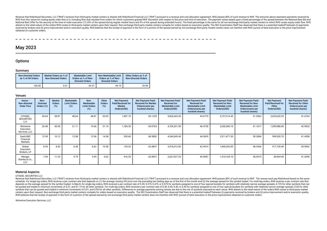 Revenue that Robinhood Securities, LLC (“RHS”) receives from third-party market centers is shared with Robinhood Financial LLC (“RHF”) pursuant to a revenue and cost allocation agreement. RHS passes 80% of such revenue to RHF. The amounts above represent payments received by RHS from this venue for routing equity order flow to it, including flow that resulted from orders for which customers granted RHF discretion with respect to the price and time of execution. The payment varies based upon a fixed percentage of the spread between the National Best Bid and National Best Offer for the security at the time of order execution (12.35% of the spread during regular market hours and 9% of the spread during extended hours). The fixed percentage is the same for all non-exchange third-party market centers to which RHS routes equity order flow. RHS attests to the retail nature of the orders RHS routes to third-party market centers upon their request. Non-exchange third party market centers compete for orders based on execution quality. The SEC Examination Staff has observed that there is a potential tradeoff between (i) payments received by brokers and (ii) price improvement and/or execution quality. RHS believes that the receipt of payment in the form of a portion of the spread earned by non-exchange third party market centers does not interfere with RHS' pursuit of best execution or the price improvement obtained on customer orders. May 2023 Options Summary Non-Directed Orders as % of All Orders Market Orders as % of Non-Directed Orders Marketable Limit Orders as % of Non- Directed Orders Non-Marketable Limit Orders as % of Non- Directed Orders Other Orders as % of Non-Directed Orders 100.00 0.01 34.27 44.74 20.98 Venues Venue - Non-directed Order Flow Non- Directed Orders (%) Market Orders (%) Marketable Limit Orders (%) Non- Marketable Limit Orders (%) Other Orders (%) Net Payment Paid/Received for Market Orders(USD) Net Payment Paid/ Received for Market Orders(cents per hundred shares) Net Payment Paid/ Received for Marketable Limit Orders(USD) Net Payment Paid/ Received for Marketable Limit Orders(cents per hundred shares) Net Payment Paid/ Received for Non- Marketable Limit Orders(USD) Net Payment Paid/ Received for Non- Marketable Limit Orders(cents per hundred shares) Net Payment Paid/Received for Other Orders(USD) Net Payment Paid/ Received for Other Orders(cents per hundred shares) CITADEL SECURITIES LLC 49.64 38.87 48.64 48.81 53.03 1,907.10 69.1229 9,826,443.50 44.0770 5,737,214.45 51.5563 2,033,620.35 41.6763 Wolverine Execution Services, LLC 20.48 30.95 21.11 19.66 21.19 1,185.35 69.0763 4,704,321.90 46.4728 2,655,560.10 51.1617 1,059,988.00 42.9625 Dash/IMC Financial Markets 12.99 10.12 12.08 12.96 14.58 330.60 68.5892 4,344,549.40 44.5639 2,311,677.30 50.3084 999,530.70 41.4558 Global Execution Brokers, LP 8.95 8.83 8.38 8.62 10.58 135.20 62.8837 3,576,412.00 42.9414 1,840,552.85 48.3436 917,728.40 39.9002 Morgan Stanley & Co., LLC 7.94 11.23 9.79 9.95 0.62 416.35 62.8927 2,627,637.25 44.4087 1,510,165.10 50.0915 30,954.90 41.5290 Material Aspects: CITADEL SECURITIES LLC: Revenue that Robinhood Securities, LLC (“RHS”) receives from third-party market centers is shared with Robinhood Financial LLC (“RHF”) pursuant to a revenue and cost allocation agreement. RHS passes 80% of such revenue to RHF.  The venues each pay Robinhood based on the same schedule. For single leg orders, RHS receives a per contract rate that depends on (1) the average closing VIX price over the preceding ten trading days as of the first of the month and (2) the average spread for the symbol traded. For multi-leg orders, RHS receives a per contract rate that depends on the average spread for the symbol traded. In March, for single leg orders, RHS received a per contract rate of $.30, $.375, $.475, or $.575 for symbols assigned to one of four special buckets for symbols with relatively narrow average spreads, $.725 for other symbols that can be quoted and traded in minimum increments of $.01, and $1.15 for all other symbols. For multi-leg orders, RHS received a per contract rate of $.30, $.40, $.40, or $.50 for symbols assigned to one of four special buckets for symbols with relatively narrow average spreads, $.60 for other symbols that can be quoted and traded in minimum increments of $.01, and $.90 for all other symbols. Differences in average payments among venues are due to the mix of symbols executed at each venue. RHS attests to the retail nature of the orders RHS routes to third-party market centers upon their request. Non-exchange third party market centers compete for orders based on execution quality.  The SEC Examination Staff has observed that there is a potential tradeoff between (i) payments received by brokers and (ii) price improvement and/or execution quality. RHS believes that the receipt of payment in the form of a portion of the spread earned by non-exchange third party market centers does not interfere with RHS' pursuit of best execution or the price improvement obtained on customer orders. Wolverine Execution Services, LLC:
