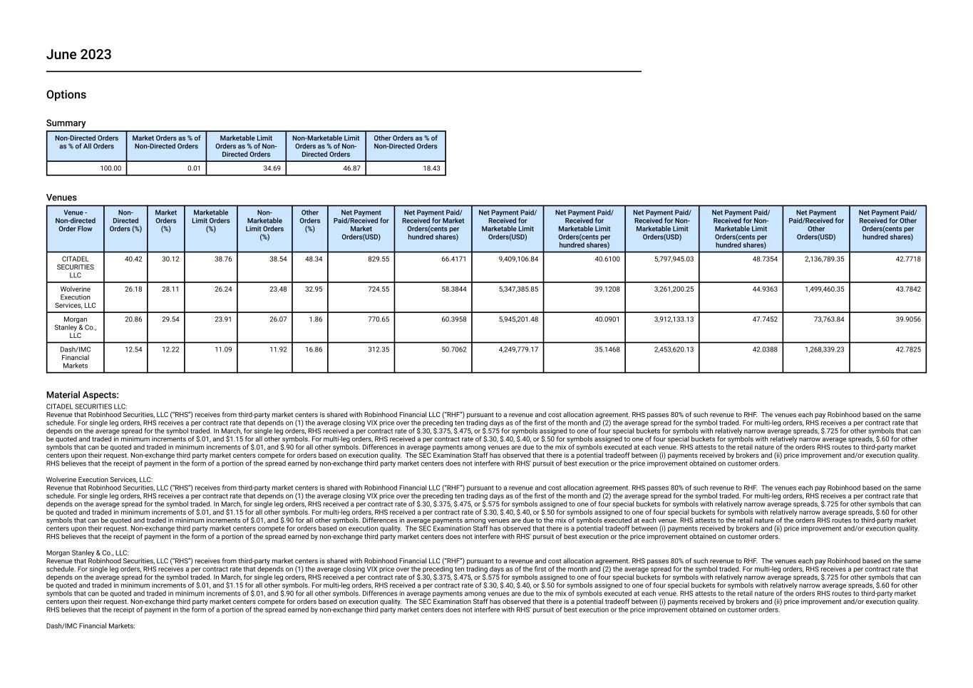 June 2023 Options Summary Non-Directed Orders as % of All Orders Market Orders as % of Non-Directed Orders Marketable Limit Orders as % of Non- Directed Orders Non-Marketable Limit Orders as % of Non- Directed Orders Other Orders as % of Non-Directed Orders 100.00 0.01 34.69 46.87 18.43 Venues Venue - Non-directed Order Flow Non- Directed Orders (%) Market Orders (%) Marketable Limit Orders (%) Non- Marketable Limit Orders (%) Other Orders (%) Net Payment Paid/Received for Market Orders(USD) Net Payment Paid/ Received for Market Orders(cents per hundred shares) Net Payment Paid/ Received for Marketable Limit Orders(USD) Net Payment Paid/ Received for Marketable Limit Orders(cents per hundred shares) Net Payment Paid/ Received for Non- Marketable Limit Orders(USD) Net Payment Paid/ Received for Non- Marketable Limit Orders(cents per hundred shares) Net Payment Paid/Received for Other Orders(USD) Net Payment Paid/ Received for Other Orders(cents per hundred shares) CITADEL SECURITIES LLC 40.42 30.12 38.76 38.54 48.34 829.55 66.4171 9,409,106.84 40.6100 5,797,945.03 48.7354 2,136,789.35 42.7718 Wolverine Execution Services, LLC 26.18 28.11 26.24 23.48 32.95 724.55 58.3844 5,347,385.85 39.1208 3,261,200.25 44.9363 1,499,460.35 43.7842 Morgan Stanley & Co., LLC 20.86 29.54 23.91 26.07 1.86 770.65 60.3958 5,945,201.48 40.0901 3,912,133.13 47.7452 73,763.84 39.9056 Dash/IMC Financial Markets 12.54 12.22 11.09 11.92 16.86 312.35 50.7062 4,249,779.17 35.1468 2,453,620.13 42.0388 1,268,339.23 42.7825 Material Aspects: CITADEL SECURITIES LLC: Revenue that Robinhood Securities, LLC (“RHS”) receives from third-party market centers is shared with Robinhood Financial LLC (“RHF”) pursuant to a revenue and cost allocation agreement. RHS passes 80% of such revenue to RHF.  The venues each pay Robinhood based on the same schedule. For single leg orders, RHS receives a per contract rate that depends on (1) the average closing VIX price over the preceding ten trading days as of the first of the month and (2) the average spread for the symbol traded. For multi-leg orders, RHS receives a per contract rate that depends on the average spread for the symbol traded. In March, for single leg orders, RHS received a per contract rate of $.30, $.375, $.475, or $.575 for symbols assigned to one of four special buckets for symbols with relatively narrow average spreads, $.725 for other symbols that can be quoted and traded in minimum increments of $.01, and $1.15 for all other symbols. For multi-leg orders, RHS received a per contract rate of $.30, $.40, $.40, or $.50 for symbols assigned to one of four special buckets for symbols with relatively narrow average spreads, $.60 for other symbols that can be quoted and traded in minimum increments of $.01, and $.90 for all other symbols. Differences in average payments among venues are due to the mix of symbols executed at each venue. RHS attests to the retail nature of the orders RHS routes to third-party market centers upon their request. Non-exchange third party market centers compete for orders based on execution quality.  The SEC Examination Staff has observed that there is a potential tradeoff between (i) payments received by brokers and (ii) price improvement and/or execution quality. RHS believes that the receipt of payment in the form of a portion of the spread earned by non-exchange third party market centers does not interfere with RHS' pursuit of best execution or the price improvement obtained on customer orders. Wolverine Execution Services, LLC: Revenue that Robinhood Securities, LLC (“RHS”) receives from third-party market centers is shared with Robinhood Financial LLC (“RHF”) pursuant to a revenue and cost allocation agreement. RHS passes 80% of such revenue to RHF.  The venues each pay Robinhood based on the same schedule. For single leg orders, RHS receives a per contract rate that depends on (1) the average closing VIX price over the preceding ten trading days as of the first of the month and (2) the average spread for the symbol traded. For multi-leg orders, RHS receives a per contract rate that depends on the average spread for the symbol traded. In March, for single leg orders, RHS received a per contract rate of $.30, $.375, $.475, or $.575 for symbols assigned to one of four special buckets for symbols with relatively narrow average spreads, $.725 for other symbols that can be quoted and traded in minimum increments of $.01, and $1.15 for all other symbols. For multi-leg orders, RHS received a per contract rate of $.30, $.40, $.40, or $.50 for symbols assigned to one of four special buckets for symbols with relatively narrow average spreads, $.60 for other symbols that can be quoted and traded in minimum increments of $.01, and $.90 for all other symbols. Differences in average payments among venues are due to the mix of symbols executed at each venue. RHS attests to the retail nature of the orders RHS routes to third-party market centers upon their request. Non-exchange third party market centers compete for orders based on execution quality.  The SEC Examination Staff has observed that there is a potential tradeoff between (i) payments received by brokers and (ii) price improvement and/or execution quality. RHS believes that the receipt of payment in the form of a portion of the spread earned by non-exchange third party market centers does not interfere with RHS' pursuit of best execution or the price improvement obtained on customer orders. Morgan Stanley & Co., LLC: Revenue that Robinhood Securities, LLC (“RHS”) receives from third-party market centers is shared with Robinhood Financial LLC (“RHF”) pursuant to a revenue and cost allocation agreement. RHS passes 80% of such revenue to RHF.  The venues each pay Robinhood based on the same schedule. For single leg orders, RHS receives a per contract rate that depends on (1) the average closing VIX price over the preceding ten trading days as of the first of the month an