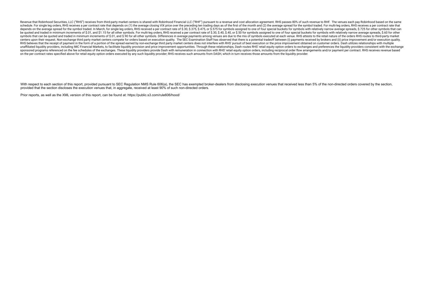 Revenue that Robinhood Securities, LLC (“RHS”) receives from third-party market centers is shared with Robinhood Financial LLC (“RHF”) pursuant to a revenue and cost allocation agreement. RHS passes 80% of such revenue to RHF.  The venues each pay Robinhood based on the same schedule. For single leg orders, RHS receives a per contract rate that depends on (1) the average closing VIX price over the preceding ten trading days as of the first of the month and (2) the average spread for the symbol traded. For multi-leg orders, RHS receives a per contract rate that depends on the average spread for the symbol traded. In March, for single leg orders, RHS received a per contract rate of $.30, $.375, $.475, or $.575 for symbols assigned to one of four special buckets for symbols with relatively narrow average spreads, $.725 for other symbols that can be quoted and traded in minimum increments of $.01, and $1.15 for all other symbols. For multi-leg orders, RHS received a per contract rate of $.30, $.40, $.40, or $.50 for symbols assigned to one of four special buckets for symbols with relatively narrow average spreads, $.60 for other symbols that can be quoted and traded in minimum increments of $.01, and $.90 for all other symbols. Differences in average payments among venues are due to the mix of symbols executed at each venue. RHS attests to the retail nature of the orders RHS routes to third-party market centers upon their request. Non-exchange third party market centers compete for orders based on execution quality.  The SEC Examination Staff has observed that there is a potential tradeoff between (i) payments received by brokers and (ii) price improvement and/or execution quality. RHS believes that the receipt of payment in the form of a portion of the spread earned by non-exchange third party market centers does not interfere with RHS' pursuit of best execution or the price improvement obtained on customer orders. Dash/IMC Financial Markets: Revenue that Robinhood Securities, LLC (“RHS”) receives from third-party market centers is shared with Robinhood Financial LLC (“RHF”) pursuant to a revenue and cost allocation agreement. RHS passes 80% of such revenue to RHF. The venues each pay Robinhood based on the same schedule. For single leg orders, RHS receives a per contract rate that depends on (1) the average closing VIX price over the preceding ten trading days as of the first of the month and (2) the average spread for the symbol traded. For multi-leg orders, RHS receives a per contract rate that depends on the average spread for the symbol traded. In March, for single leg orders, RHS received a per contract rate of $.30, $.375, $.475, or $.575 for symbols assigned to one of four special buckets for symbols with relatively narrow average spreads, $.725 for other symbols that can be quoted and traded in minimum increments of $.01, and $1.15 for all other symbols. For multi-leg orders, RHS received a per contract rate of $.30, $.40, $.40, or $.50 for symbols assigned to one of four special buckets for symbols with relatively narrow average spreads, $.60 for other symbols that can be quoted and traded in minimum increments of $.01, and $.90 for all other symbols. Differences in average payments among venues are due to the mix of symbols executed at each venue. RHS attests to the retail nature of the orders RHS routes to third-party market centers upon their request. Non-exchange third party market centers compete for orders based on execution quality. The SEC Examination Staff has observed that there is a potential tradeoff between (i) payments received by brokers and (ii) price improvement and/or execution quality. RHS believes that the receipt of payment in the form of a portion of the spread earned by non-exchange third party market centers does not interfere with RHS' pursuit of best execution or the price improvement obtained on customer orders. Dash utilizes relationships with multiple unaffiliated liquidity providers, including IMC Financial Markets, to facilitate liquidity provision and price improvement opportunities. Through these relationships, Dash routes RHS’ retail equity option orders to exchanges and preferences the liquidity providers consistent with the exchange sponsored programs referenced on the fee schedules of the exchanges. These liquidity providers provide Dash with remuneration in connection with RHS’ retail equity option orders, including reciprocal order flow arrangements and/or payment per contract. RHS receives revenue based on the per contract rates specified above for retail equity option orders executed by any such liquidity provider; RHS receives such amounts from DASH, which in turn receives those amounts from the liquidity provider. Global Execution Brokers, LP: Revenue that Robinhood Securities, LLC (“RHS”) receives from third-party market centers is shared with Robinhood Financial LLC (“RHF”) pursuant to a revenue and cost allocation agreement. RHS passes 80% of such revenue to RHF.  The venues each pay Robinhood based on the same schedule. For single leg orders, RHS receives a per contract rate that depends on (1) the average closing VIX price over the preceding ten trading days as of the first of the month and (2) the average spread for the symbol traded. For multi-leg orders, RHS receives a per contract rate that depends on the average spread for the symbol traded. In March, for single leg orders, RHS received a per contract rate of $.30, $.375, $.475, or $.575 for symbols assigned to one of four special buckets for symbols with relatively narrow average spreads, $.725 for other symbols that can be quoted and traded in minimum increments of $.01, and $1.15 for all other symbols. For multi-leg orders, RHS received a per contract rate of $.30, $.40, $.40, or $.50 for symbols assigned to one of four special buckets for symbols with relatively narrow average spreads, $.60 for other symbols that can be quoted and traded in min
