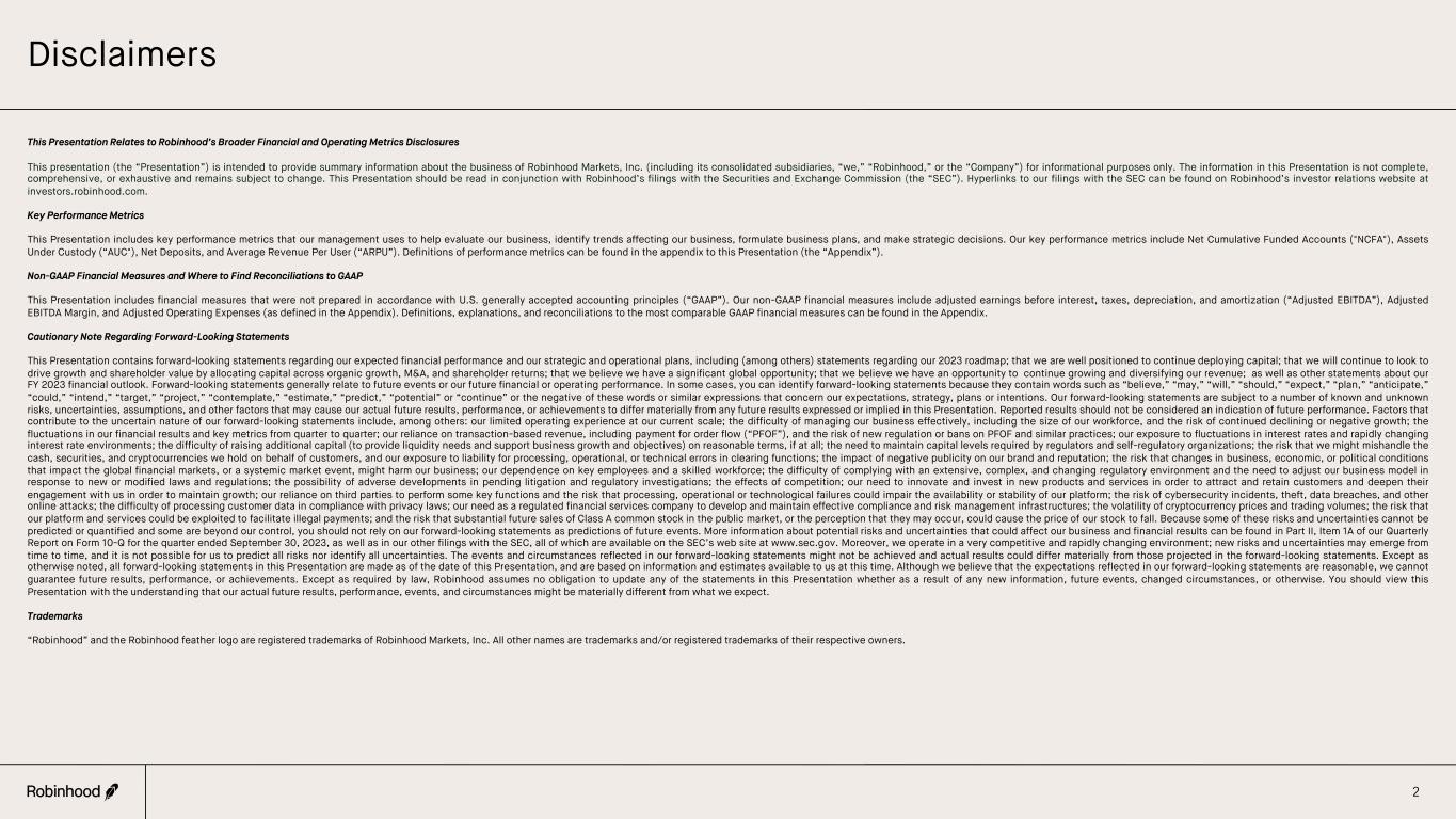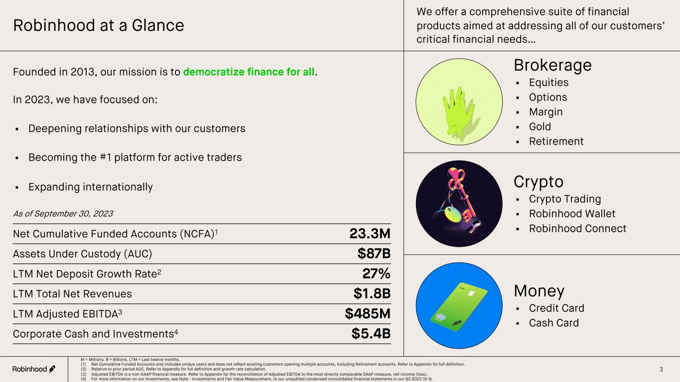 Disclaimers 2 This Presentation Relates to Robinhood’s Broader Financial and Operating Metrics Disclosures This presentation (the “Presentation”) is intended to provide summary information about the business of Robinhood Markets, Inc. (including its consolidated subsidiaries, “we,” “Robinhood,” or the “Company”) for informational purposes only. The information in this Presentation is not complete, comprehensive, or exhaustive and remains subject to change. This Presentation should be read in conjunction with Robinhood’s filings with the Securities and Exchange Commission (the “SEC”). Hyperlinks to our filings with the SEC can be found on Robinhood’s investor relations website at investors.robinhood.com. Key Performance Metrics This Presentation includes key performance metrics that our management uses to help evaluate our business, identify trends affecting our business, formulate business plans, and make strategic decisions. Our key performance metrics include Net Cumulative Funded Accounts ("NCFA"), Assets Under Custody (“AUC"), Net Deposits, and Average Revenue Per User (“ARPU”). Definitions of performance metrics can be found in the appendix to this Presentation (the “Appendix”). Non-GAAP Financial Measures andWhere to Find Reconciliations to GAAP This Presentation includes financial measures that were not prepared in accordance with U.S. generally accepted accounting principles (“GAAP”). Our non-GAAP financial measures include adjusted earnings before interest, taxes, depreciation, and amortization (“Adjusted EBITDA”), Adjusted EBITDA Margin, and Adjusted Operating Expenses (as defined in the Appendix). Definitions, explanations, and reconciliations to the most comparable GAAP financial measures can be found in the Appendix. Cautionary Note Regarding Forward-Looking Statements This Presentation contains forward-looking statements regarding our expected financial performance and our strategic and operational plans, including (among others) statements regarding our 2023 roadmap; that we are well positioned to continue deploying capital; that we will continue to look to drive growth and shareholder value by allocating capital across organic growth, M&A, and shareholder returns; that we believe we have a significant global opportunity; that we believe we have an opportunity to continue growing and diversifying our revenue; as well as other statements about our FY 2023 financial outlook. Forward-looking statements generally relate to future events or our future financial or operating performance. In some cases, you can identify forward-looking statements because they contain words such as “believe,” “may,” “will,” “should,” “expect,” “plan,” “anticipate,” “could,” “intend,” “target,” “project,” “contemplate,” “estimate,” “predict,” “potential” or “continue” or the negative of these words or similar expressions that concern our expectations, strategy, plans or intentions. Our forward-looking statements are subject to a number of known and unknown risks, uncertainties, assumptions, and other factors that may cause our actual future results, performance, or achievements to differ materially from any future results expressed or implied in this Presentation. Reported results should not be considered an indication of future performance. Factors that contribute to the uncertain nature of our forward-looking statements include, among others: our limited operating experience at our current scale; the difficulty of managing our business effectively, including the size of our workforce, and the risk of continued declining or negative growth; the fluctuations in our financial results and key metrics from quarter to quarter; our reliance on transaction-based revenue, including payment for order flow (“PFOF”), and the risk of new regulation or bans on PFOF and similar practices; our exposure to fluctuations in interest rates and rapidly changing interest rate environments; the difficulty of raising additional capital (to provide liquidity needs and support business growth and objectives) on reasonable terms, if at all; the need to maintain capital levels required by regulators and self-regulatory organizations; the risk that we might mishandle the cash, securities, and cryptocurrencies we hold on behalf of customers, and our exposure to liability for processing, operational, or technical errors in clearing functions; the impact of negative publicity on our brand and reputation; the risk that changes in business, economic, or political conditions that impact the global financial markets, or a systemic market event, might harm our business; our dependence on key employees and a skilled workforce; the difficulty of complying with an extensive, complex, and changing regulatory environment and the need to adjust our business model in response to new or modified laws and regulations; the possibility of adverse developments in pending litigation and regulatory investigations; the effects of competition; our need to innovate and invest in new products and services in order to attract and retain customers and deepen their engagement with us in order to maintain growth; our reliance on third parties to perform some key functions and the risk that processing, operational or technological failures could impair the availability or stability of our platform; the risk of cybersecurity incidents, theft, data breaches, and other online attacks; the difficulty of processing customer data in compliance with privacy laws; our need as a regulated financial services company to develop and maintain effective compliance and risk management infrastructures; the volatility of cryptocurrency prices and trading volumes; the risk that our platform and services could be exploited to facilitate illegal payments; and the risk that substantial future sales of Class A common stock in the public market, or the perception that