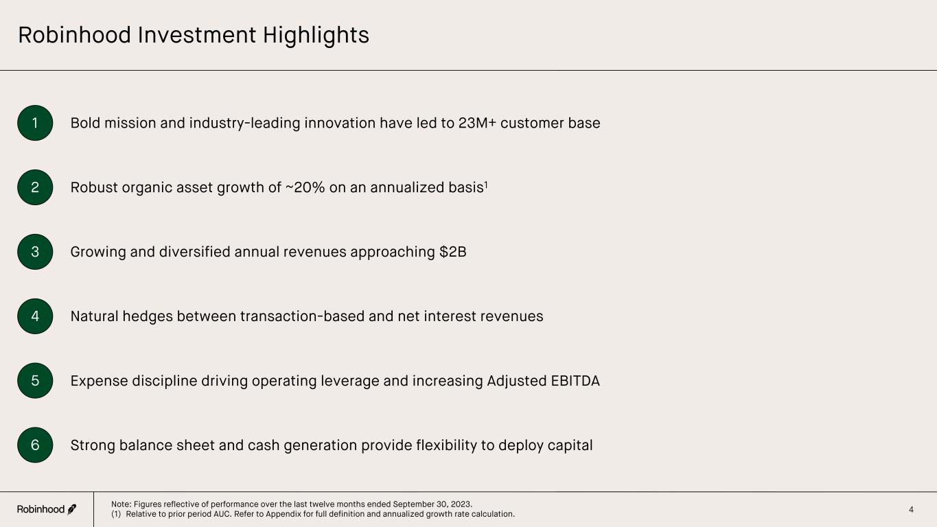 Robinhood at a Glance We offer a comprehensive suite of financial products aimed at addressing all of our customers’ critical financial needs… Founded in 2013, our mission is to democratize finance for all. In 2023, we have focused on: § Deepening relationships with our customers § Becoming the #1 platform for active traders § Expanding internationally As of September 30, 2023 Net Cumulative Funded Accounts (NCFA)1 23.3M Assets Under Custody (AUC) $87B LTM Net Deposit Growth Rate2 27% LTM Total Net Revenues $1.8B LTM Adjusted EBITDA3 $485M Corporate Cash and Investments4 $5.4B Brokerage § Equities § Options § Margin § Gold § Retirement Crypto § Crypto Trading § Robinhood Wallet § Robinhood Connect Money § Credit Card § Cash Card 3 M = Millions. B = Billions. LTM = Last twelve months. (1) Net Cumulative Funded Accounts only includes unique users and does not reflect existing customers opening multiple accounts, including Retirement accounts. Refer to Appendix for full definition. (2) Relative to prior period AUC. Refer to Appendix for full definition and growth rate calculation. (3) Adjusted EBITDA is a non-GAAP financial measure. Refer to Appendix for the reconciliation of Adjusted EBITDA to the most directly comparable GAAP measure, net income (loss). (4) For more information on our investments, see Note - Investments and Fair Value Measurement, to our unaudited condensed consolidated financial statements in our Q3 2023 10-Q.