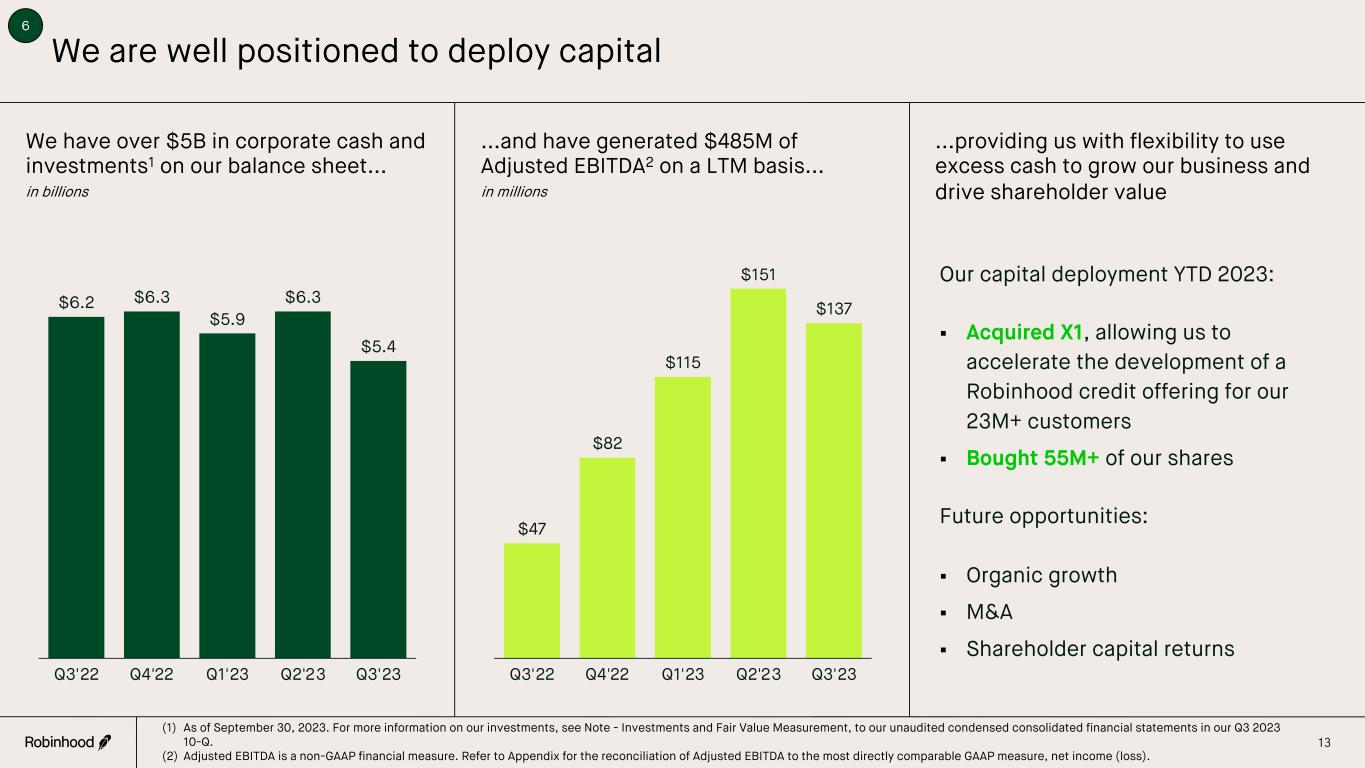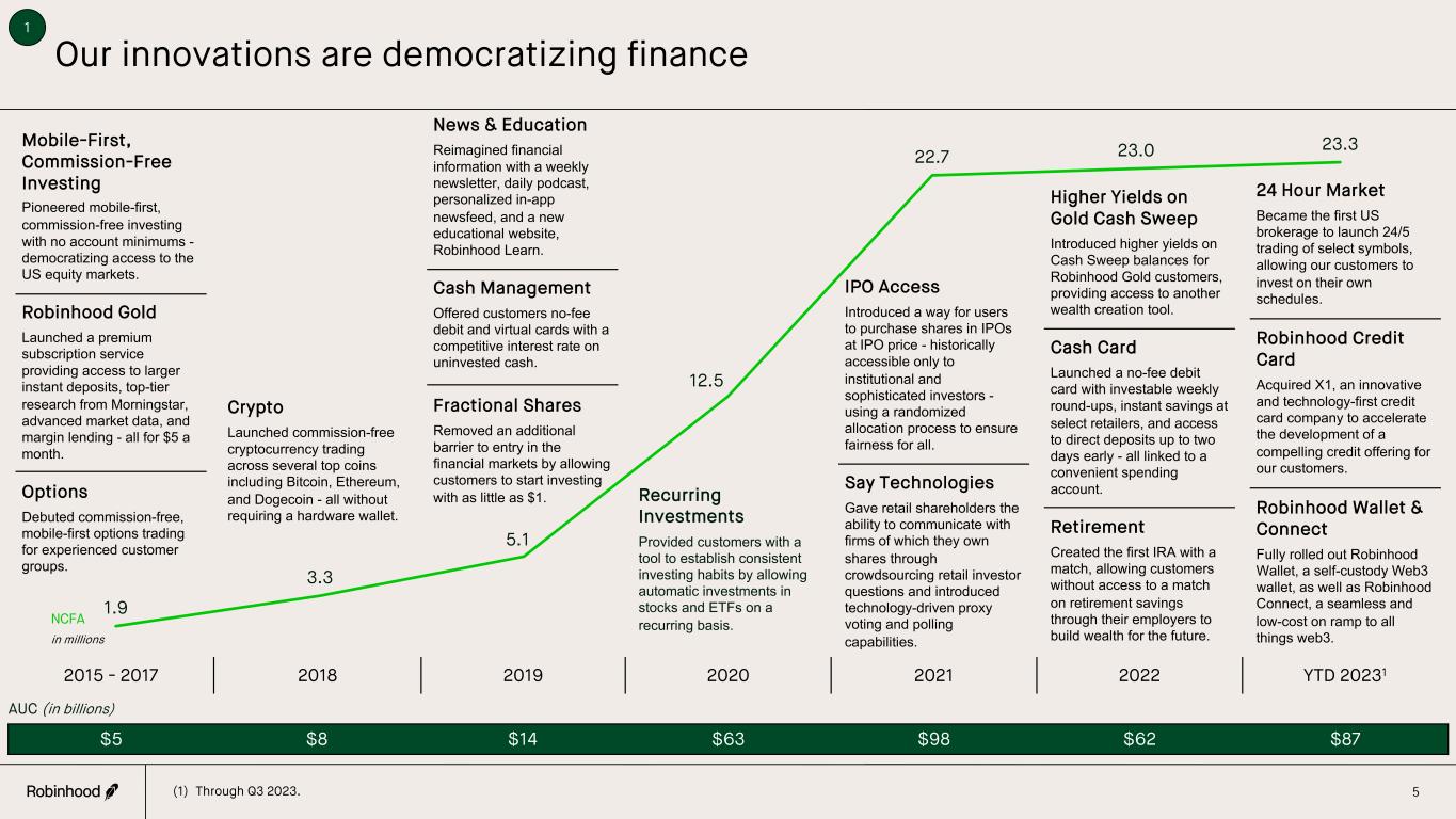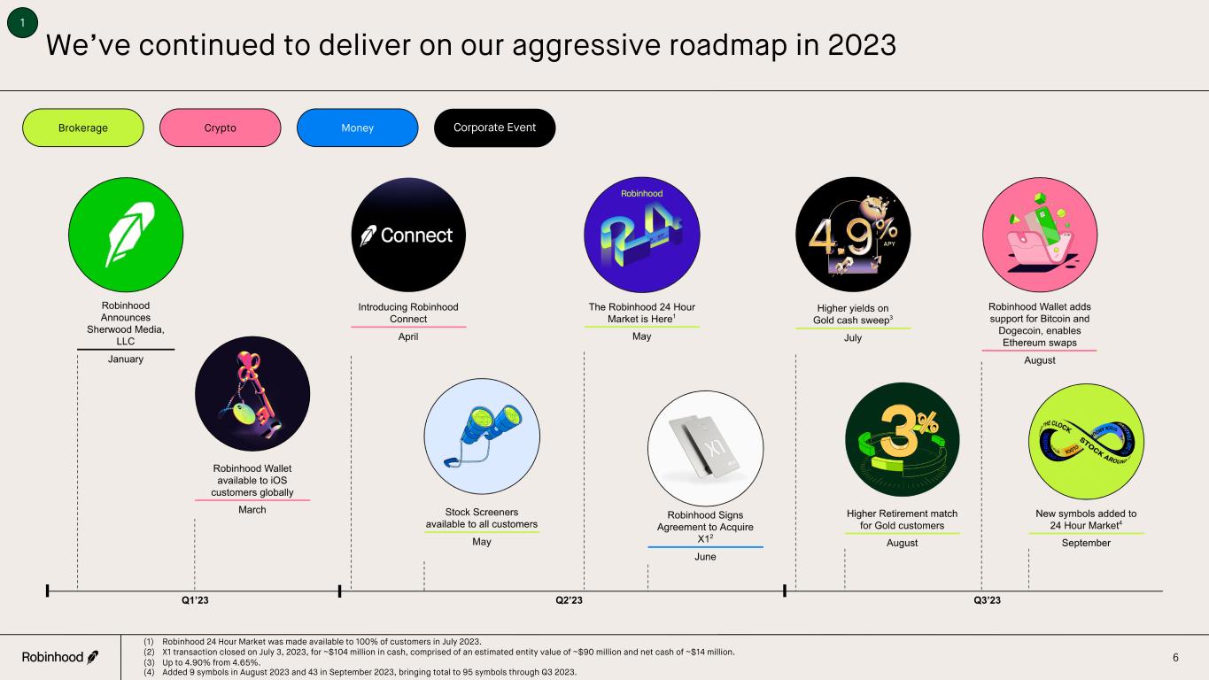 1.9 3.3 5.1 12.5 22.7 23.0 23.3 Our innovations are democratizing finance AUC (in billions) $5 $8 $14 $63 $98 $62 $87 2015 - 2017 2018 2019 2020 2021 2022 YTD 20231 Mobile-First, Commission-Free Investing Pioneered mobile-first, commission-free investing with no account minimums - democratizing access to the US equity markets. Robinhood Gold Launched a premium subscription service providing access to larger instant deposits, top-tier research from Morningstar, advanced market data, and margin lending - all for $5 a month. Options Debuted commission-free, mobile-first options trading for experienced customer groups. Crypto Launched commission-free cryptocurrency trading across several top coins including Bitcoin, Ethereum, and Dogecoin - all without requiring a hardware wallet. News & Education Reimagined financial information with a weekly newsletter, daily podcast, personalized in-app newsfeed, and a new educational website, Robinhood Learn. Cash Management Offered customers no-fee debit and virtual cards with a competitive interest rate on uninvested cash. Fractional Shares Removed an additional barrier to entry in the financial markets by allowing customers to start investing with as little as $1. IPO Access Introduced a way for users to purchase shares in IPOs at IPO price - historically accessible only to institutional and sophisticated investors - using a randomized allocation process to ensure fairness for all. Say Technologies Gave retail shareholders the ability to communicate with firms of which they own shares through crowdsourcing retail investor questions and introduced technology-driven proxy voting and polling capabilities. Higher Yields on Gold Cash Sweep Introduced higher yields on Cash Sweep balances for Robinhood Gold customers, providing access to another wealth creation tool. Cash Card Launched a no-fee debit card with investable weekly round-ups, instant savings at select retailers, and access to direct deposits up to two days early - all linked to a convenient spending account. Retirement Created the first IRA with a match, allowing customers without access to a match on retirement savings through their employers to build wealth for the future. 24 Hour Market Became the first US brokerage to launch 24/5 trading of select symbols, allowing our customers to invest on their own schedules. Robinhood Credit Card Acquired X1, an innovative and technology-first credit card company to accelerate the development of a compelling credit offering for our customers. Robinhood Wallet & Connect Fully rolled out Robinhood Wallet, a self-custody Web3 wallet, as well as Robinhood Connect, a seamless and low-cost on ramp to all things web3. 5 1 (1) Through Q3 2023. NCFA in millions Recurring Investments Provided customers with a tool to establish consistent investing habits by allowing automatic investments in stocks and ETFs on a recurring basis.
