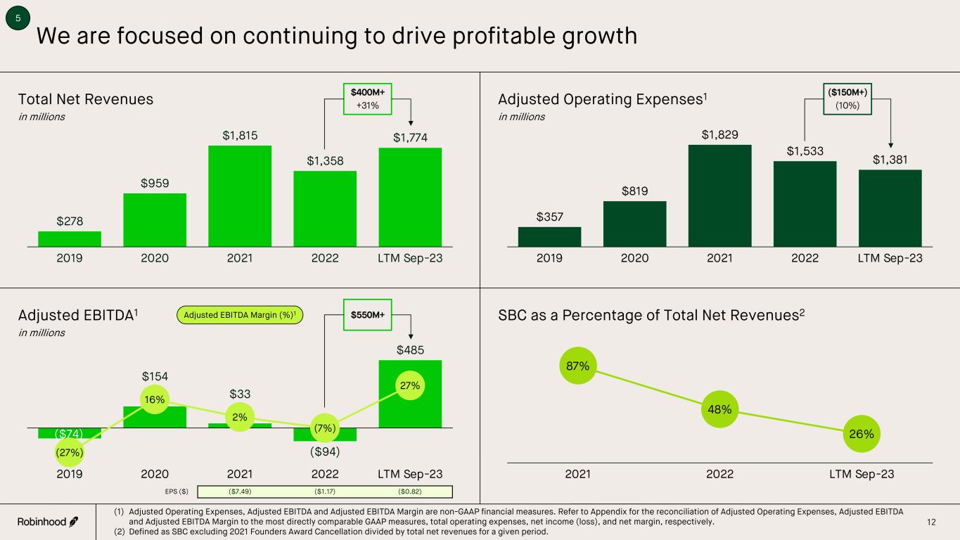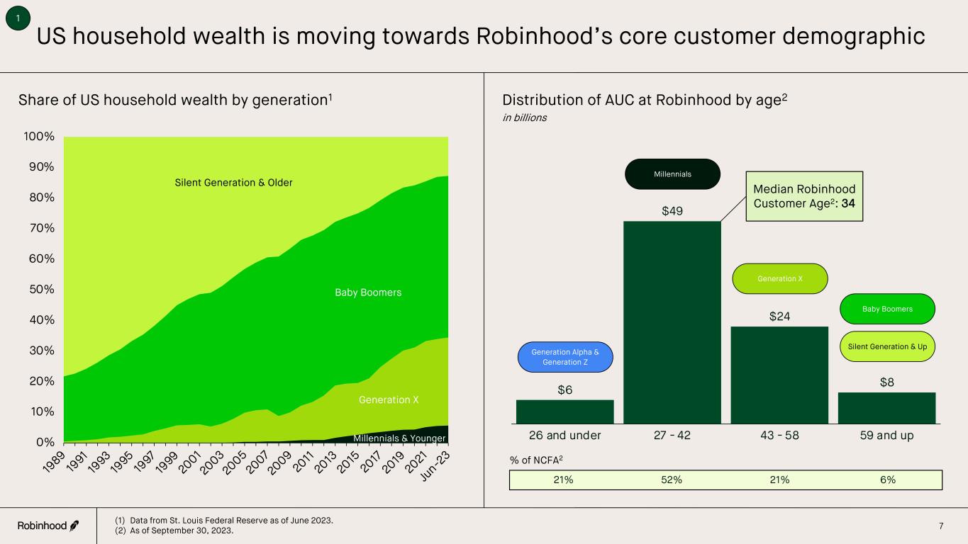 Robinhood Investment Highlights 1 2 3 5 6 Bold mission and industry-leading innovation have led to 23M+ customer base Robust organic asset growth of ~20% on an annualized basis1 Growing and diversified annual revenues approaching $2B Expense discipline driving operating leverage and increasing Adjusted EBITDA Strong balance sheet and cash generation provide flexibility to deploy capital 4 4 Natural hedges between transaction-based and net interest revenues Note: Figures reflective of performance over the last twelve months ended September 30, 2023. (1) Relative to prior period AUC. Refer to Appendix for full definition and annualized growth rate calculation.