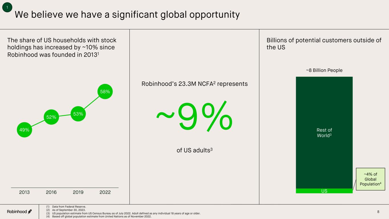 0% 10% 20% 30% 40% 50% 60% 70% 80% 90% 100% 19 89 19 91 19 93 19 95 19 97 19 99 2001 2003 2005 2007 2009 2011 2013 2015 2017 2019 2021 Ju n-2 3 $6 $49 $24 $8 26 and under 27 - 42 43 - 58 59 and up US household wealth is moving towards Robinhood’s core customer demographic Share of US household wealth by generation1 Distribution of AUC at Robinhood by age2 in billions Silent Generation & Up Baby Boomers Generation X Millennials Median Robinhood Customer Age2: 34 Generation Alpha & Generation Z % of NCFA2 21% 52% 21% 6% Silent Generation & Older Baby Boomers Generation X Millennials & Younger 7(1) Data from St. Louis Federal Reserve as of June 2023. (2) As of September 30, 2023. 1