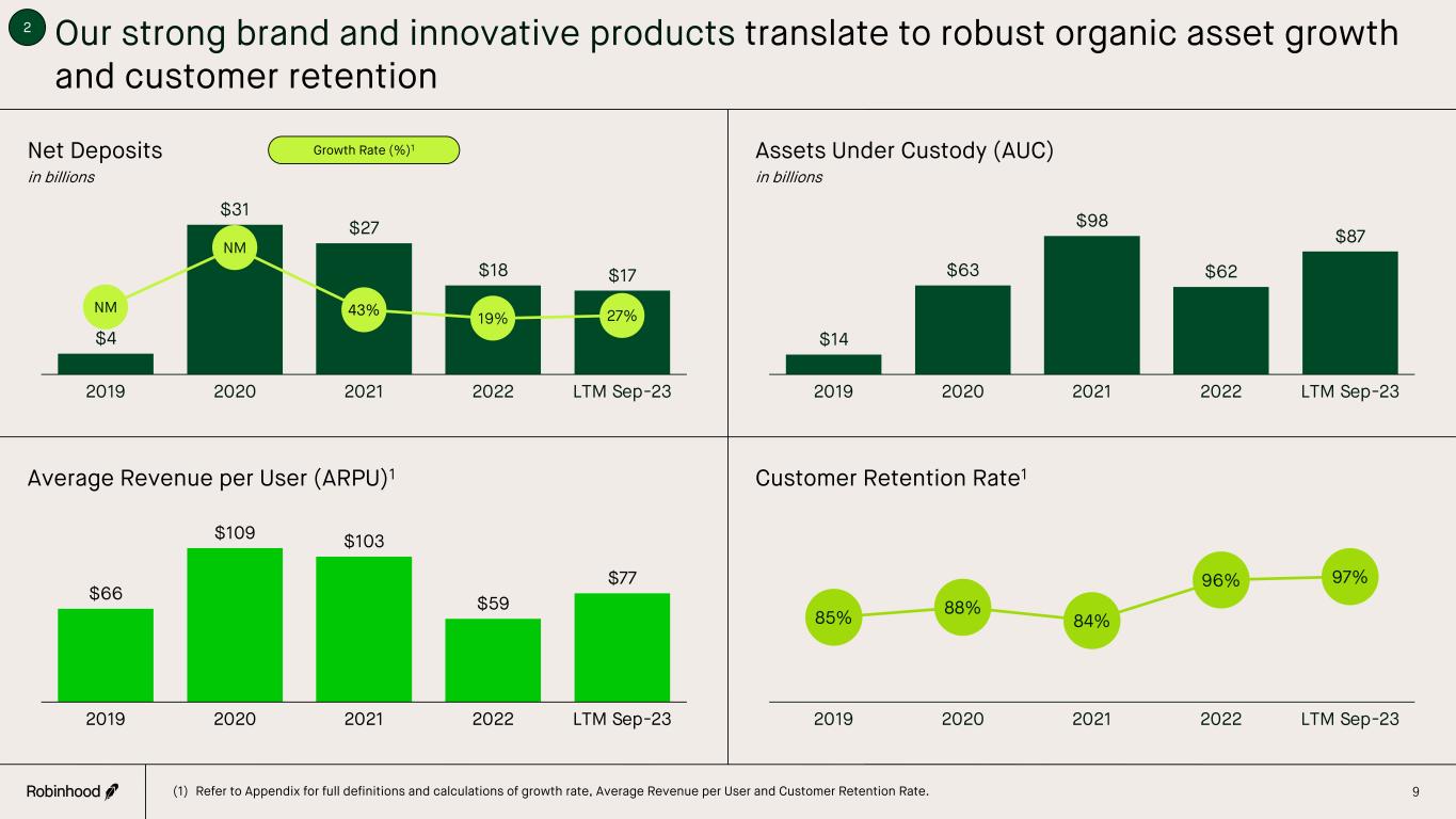 US Rest of World3 ~8 Billion People We believe we have a significant global opportunity The share of US households with stock holdings has increased by ~10% since Robinhood was founded in 20131 8 49% 52% 53% 58% 2013 2016 2019 2022 Robinhood’s 23.3M NCFA2 represents ~9% of US adults3 (1) Data from Federal Reserve. (2) As of September 30, 2023. (3) US population estimate from US Census Bureau as of July 2022. Adult defined as any individual 18 years of age or older. (4) Based off global population estimate from United Nations as of November 2022. ~4% of Global Population4 Billions of potential customers outside of the US 1