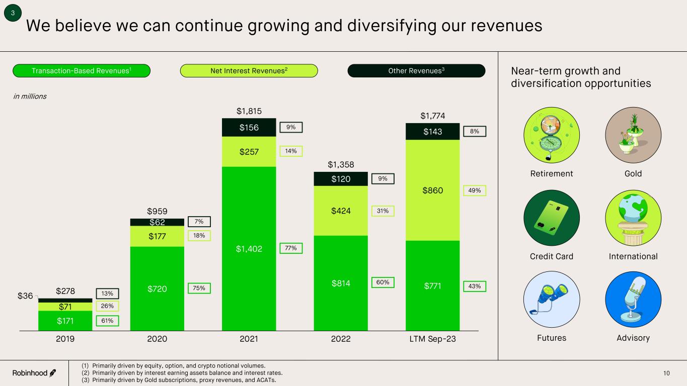 Our strong brand and innovative products translate to robust organic asset growth and customer retention Net Deposits $66 $109 $103 $59 $77 2019 2020 2021 2022 LTM Sep-23 Average Revenue per User (ARPU)1 Assets Under Custody (AUC) Customer Retention Rate1 9 85% 88% 84% 96% 97% 2019 2020 2021 2022 LTM Sep-23 2 (1) Refer to Appendix for full definitions and calculations of growth rate, Average Revenue per User and Customer Retention Rate. Growth Rate (%)1 in billions in billions $14 $63 $98 $62 $87 2019 2020 2021 2022 LTM Sep-23 $4 $31 $27 $18 $17 NM NM 43% 19% 27% 2019 2020 2021 2022 LTM Sep-23